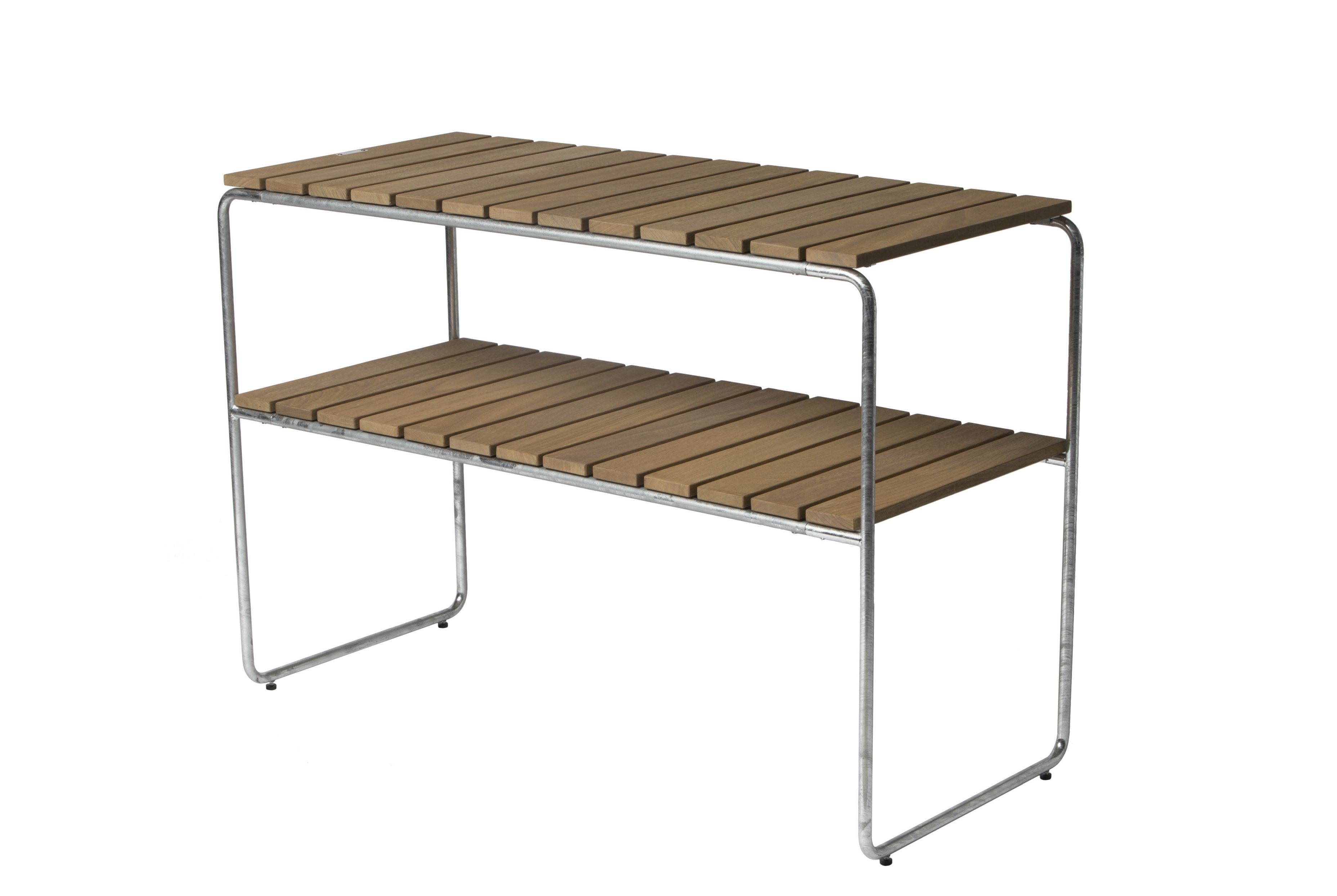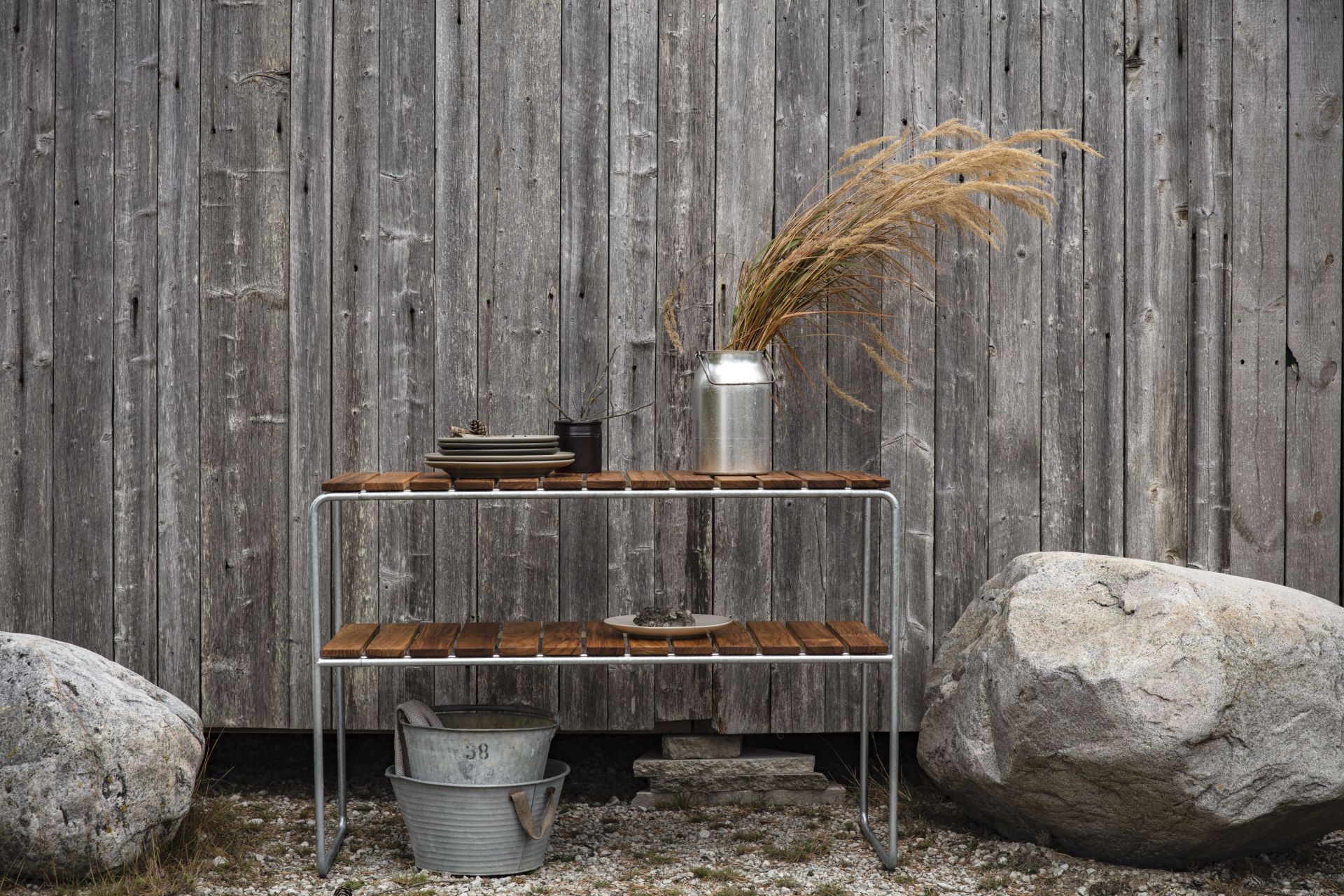 Der Beistelltisch ist 107 cm breit, 45 cm tief und 74 cm hoch. Er besteht aus feuerverzinkten Stahl und FSC-zertifiziertem und geöltem Eichenholz.