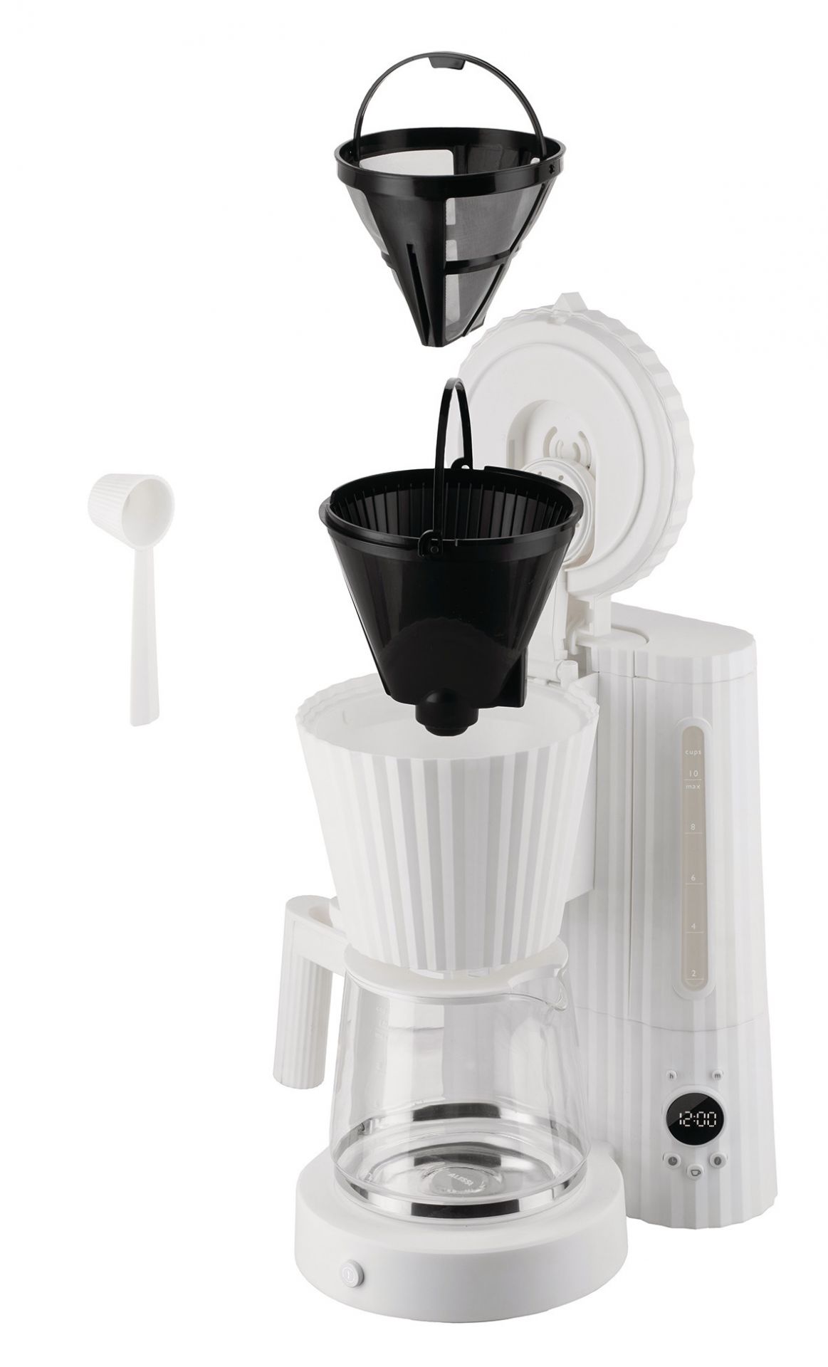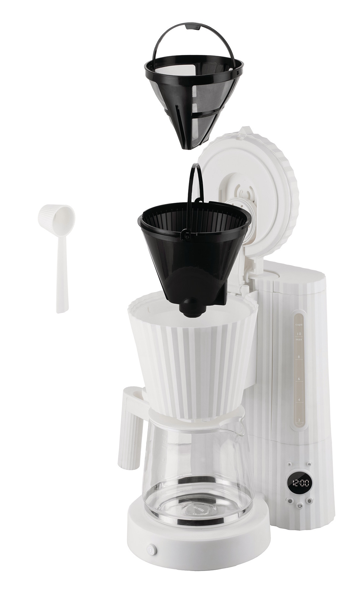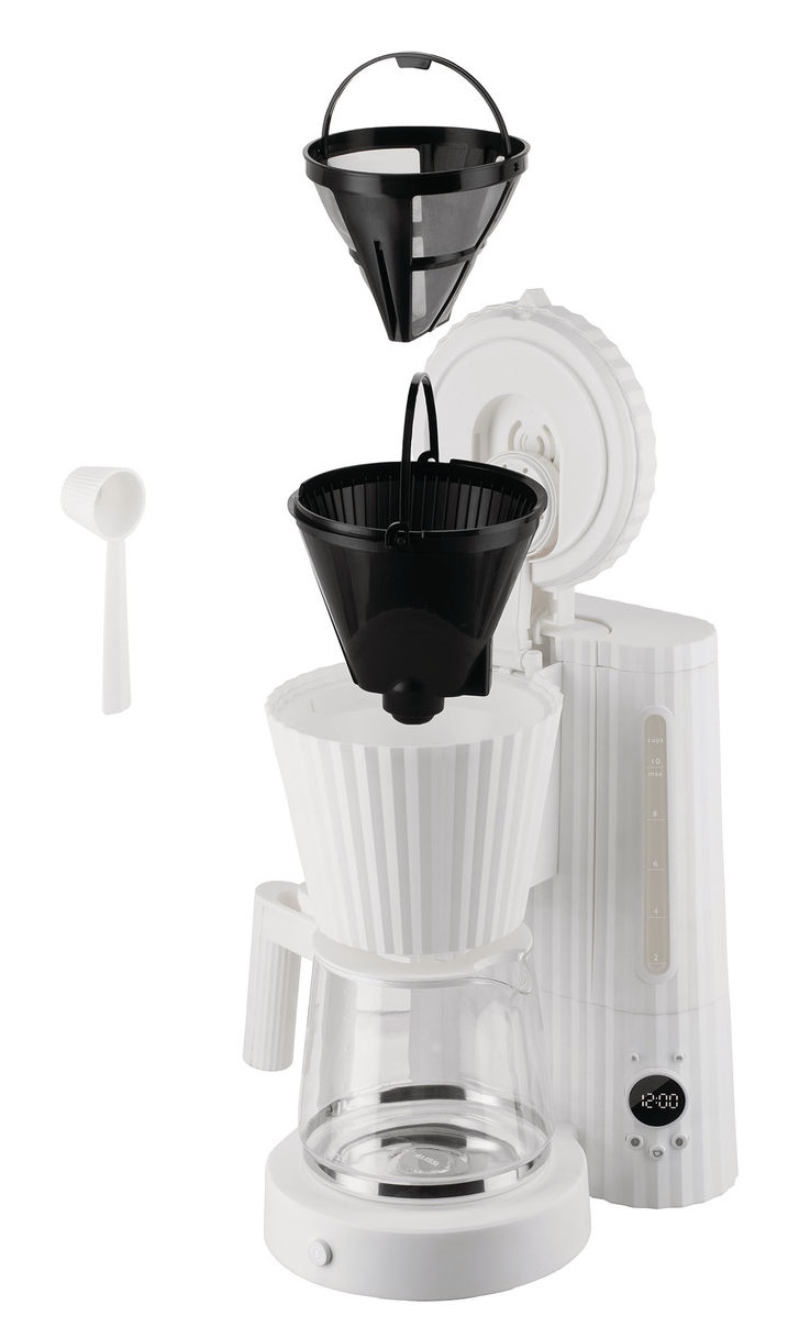 Die Filterkaffeemaschine besteht aus einer Maschine mit Display, einem beheizbaren Sockel, einem Filterhalter mit Deckel und einem Netzkabel. Plissé ist in drei Farben erhältlich: schwarz, grau und weiß. Diese Farbauswahl bietet für jeden Haushalt und jede Küche ein passendes Modell.
