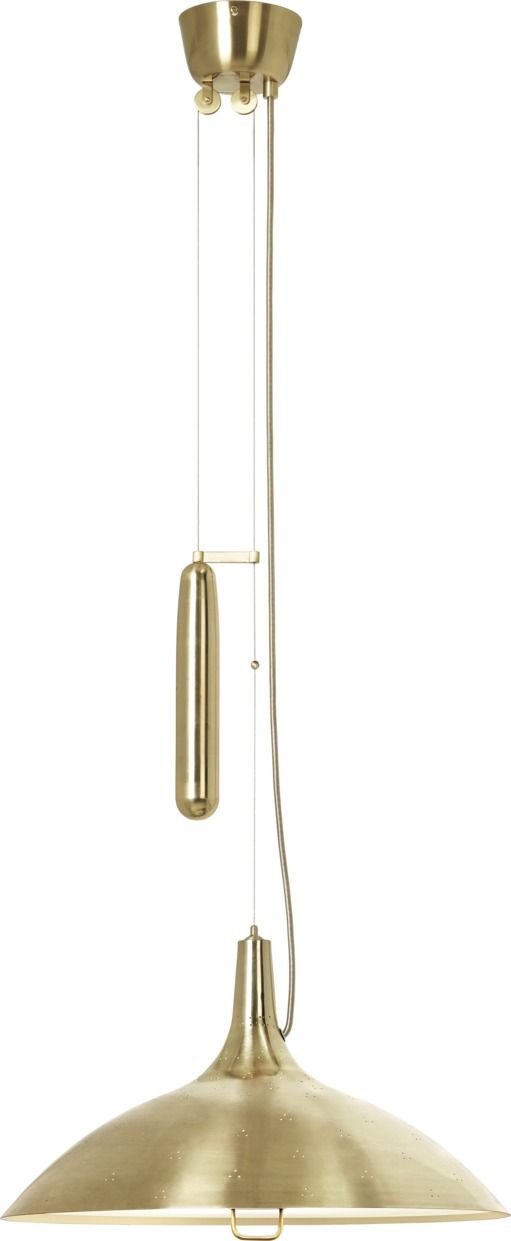 Blickfang und Funktionalität in einem – durch einen einzigartigen Hebemechanismus kann die A1965 Leuchte auf verschiedenen Höhen gehoben und gesenkt werden. Entworfen im Jahr 1948 von dem finnischen Designer Paavo Tynell spiegelt die A1965 Pendelleuchte nahezu die Perfektion der Metallveredelung wider und zeichnet sich durch ihr besonderes dreieckiges Perforationsmuster aus. Der Diffusor besteht aus Milchglas und sorgt somit für ein besonders weiches Licht, welches zu einer ruhigen Umgebung beiträgt.