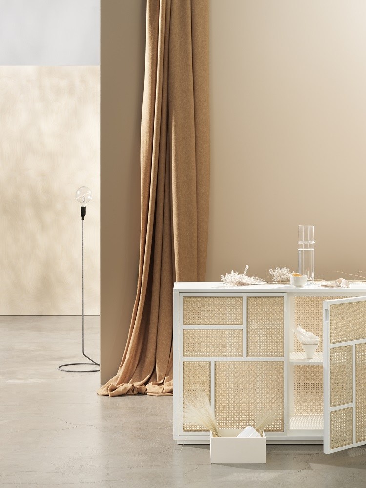 Durch das Schilfrohrgeflecht hindurch lässt sich der Inhalt des Sideboards erahnen – nicht mehr und nicht weniger. So hält das Sideboard Air gekonnt die Balance zwischen der aufgeräumten Optik eines geschlossenen Schränkchens und der luftigen Leichtigkeit eines offenen Regals.