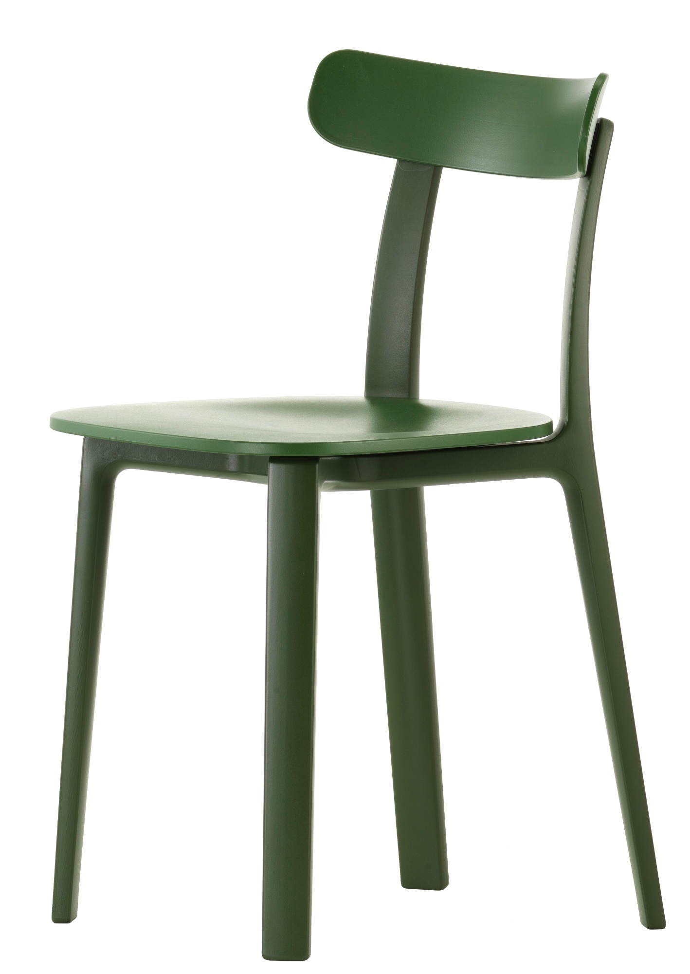 Geformt wie ein klassischer skandinavischer Holzstuhl, überrascht der All Plastic Chair von Vitra durch seine Kunststoffverarbeitung. Positiver Nebeneffekt: Der von Jasper Morrison entworfene Stuhl kann auch im Freien verwendet werden.