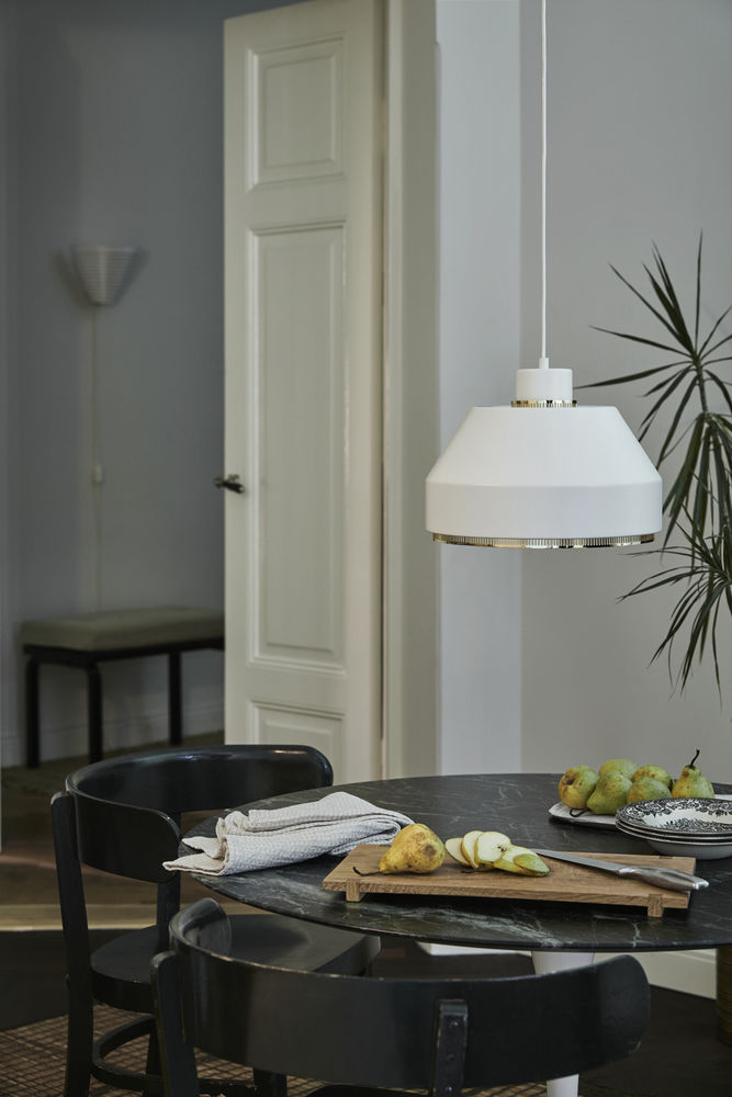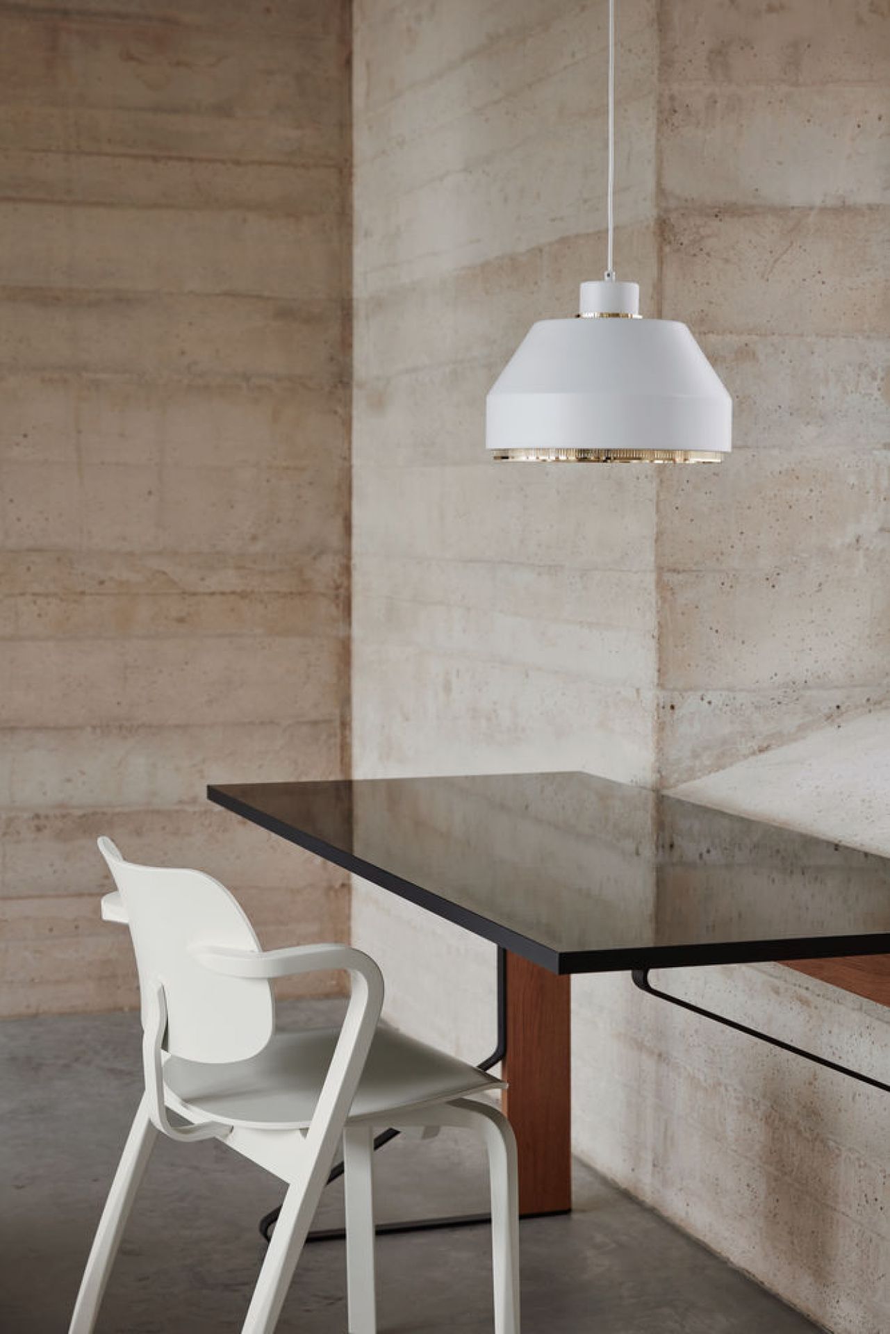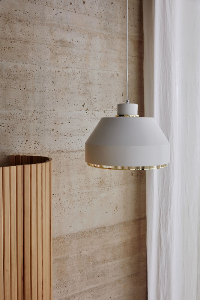 Ein besonders weiches und warmes Licht wird von der AMA500 Pendelleuchte von Artek erzeugt. Sie kann perfekt als einzige Lichtquelle über einem Ess- oder Schreibtisch platziert werden und strahlt großzügig ihr Licht nach unten ab. Die Leuchte gilt bei Artek als eines der Herzstücke. Sie ist identisch mit der Pendelleuchte, die in der Bibliothek der Villa Maiera, Altos Meisterwerk hängt.