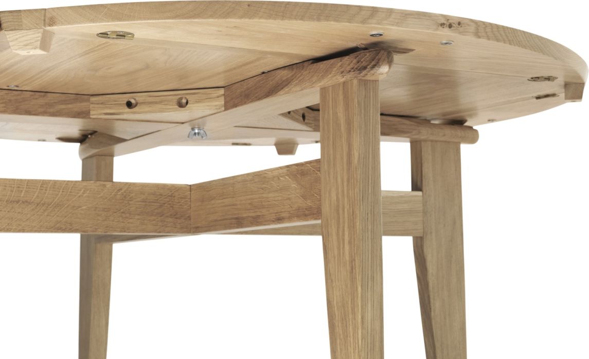 Der Tisch wird je nach Variante aus Eiche oder Walnuss gefertigt. Im quadratischen Zustand ist der Tisch 85 cm breit und tief, in der erweiterten runden Variante hat der Tisch einen Durchmesser von 116 cm. Die Höhe des Tisches beträgt in beiden Versionen 75 cm.