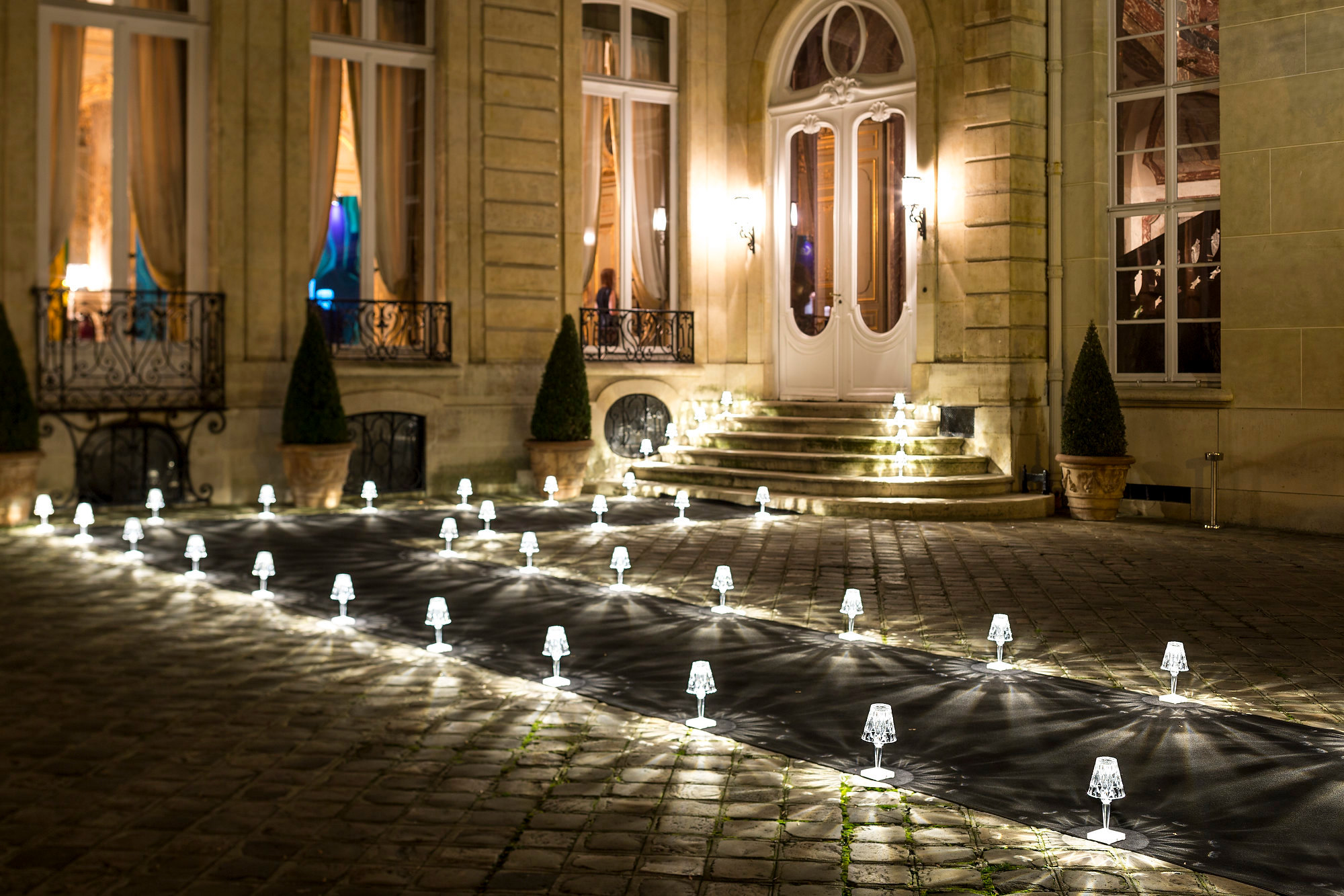 Die Battery 4 Tischleuchte besteht aus transparentem, thermoplastischem Technopolymer und eignet sich perfekt für den Outdoor-Bereich.