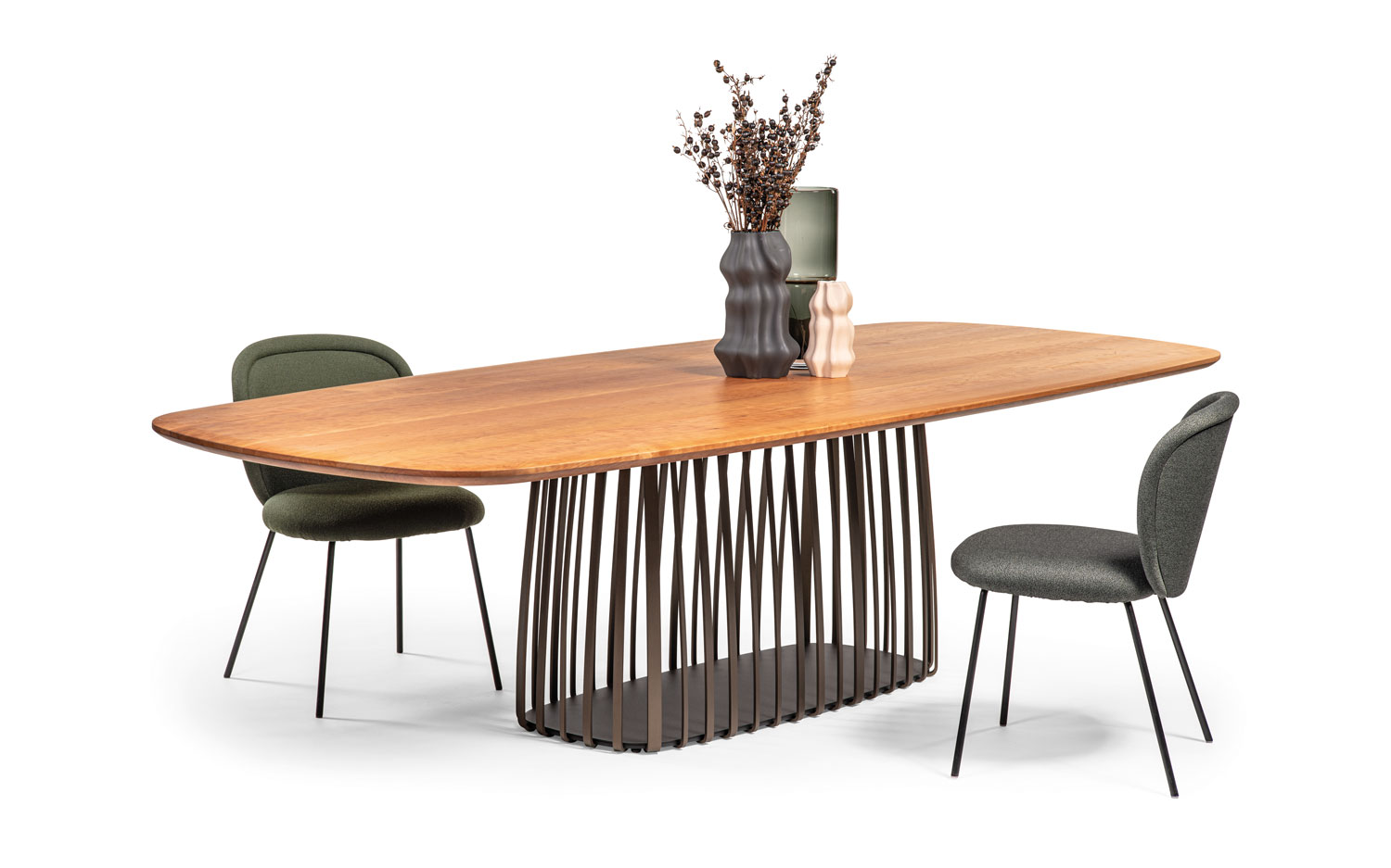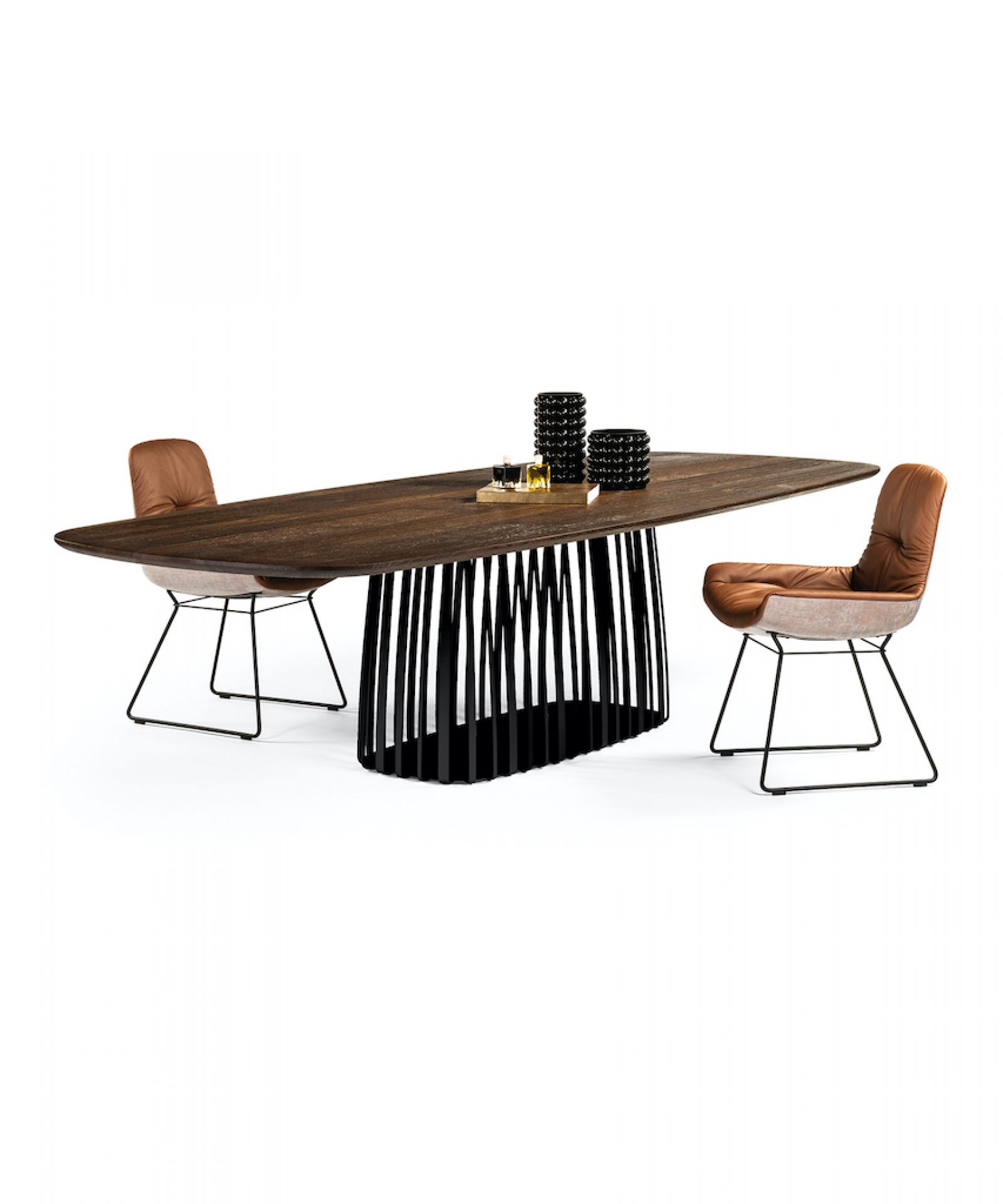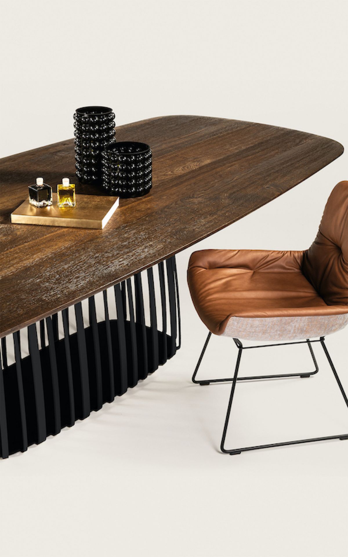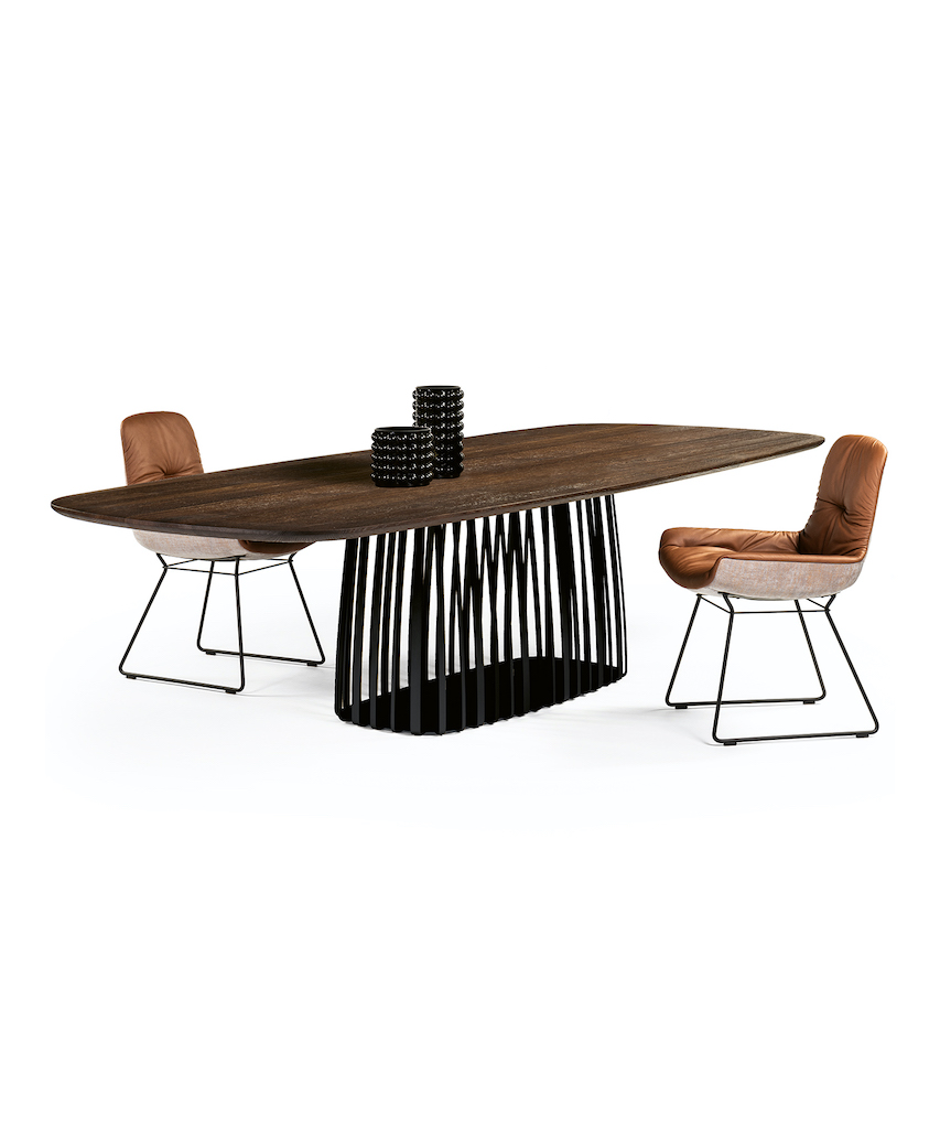 Hochwertig und charakterstark präsentiert sich der BC 07 Basket in einer edlen Kombination aus Massivholz und Metall. Das durchbrochene Gestell aus unterschiedlich breiten, sanft gebogenen Streben erzeugt einen tollen Kontrast zur imposanten Tischplatte aus geräuchertem Eichenholz bzw. Nussbaum.