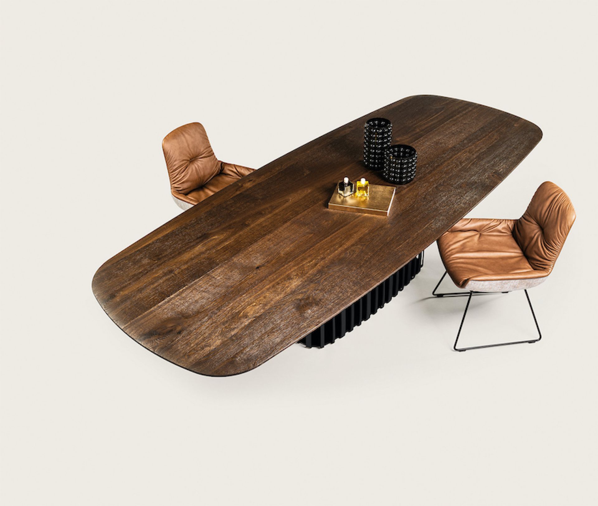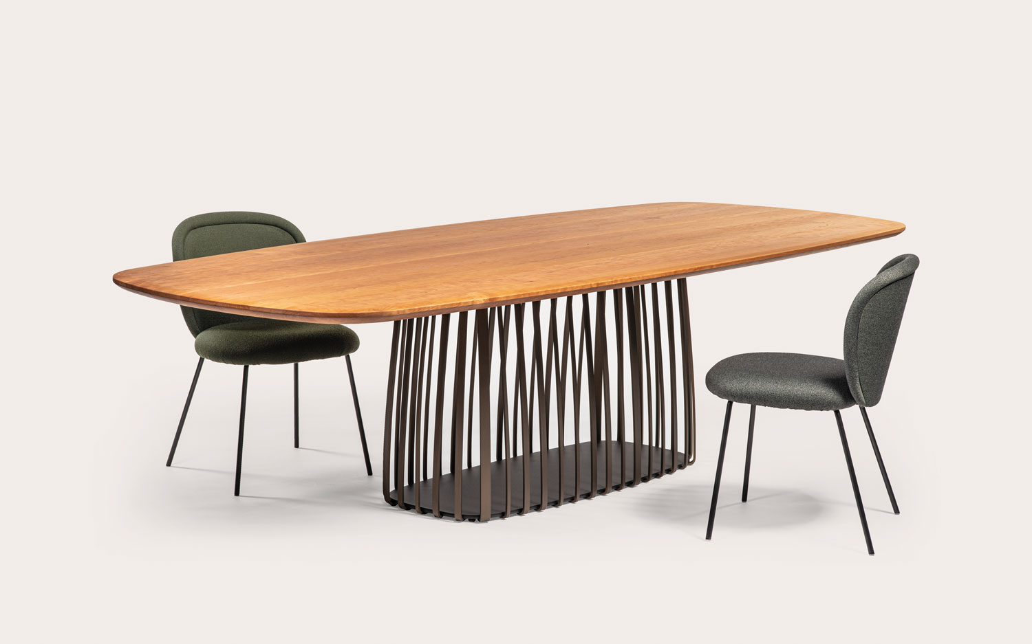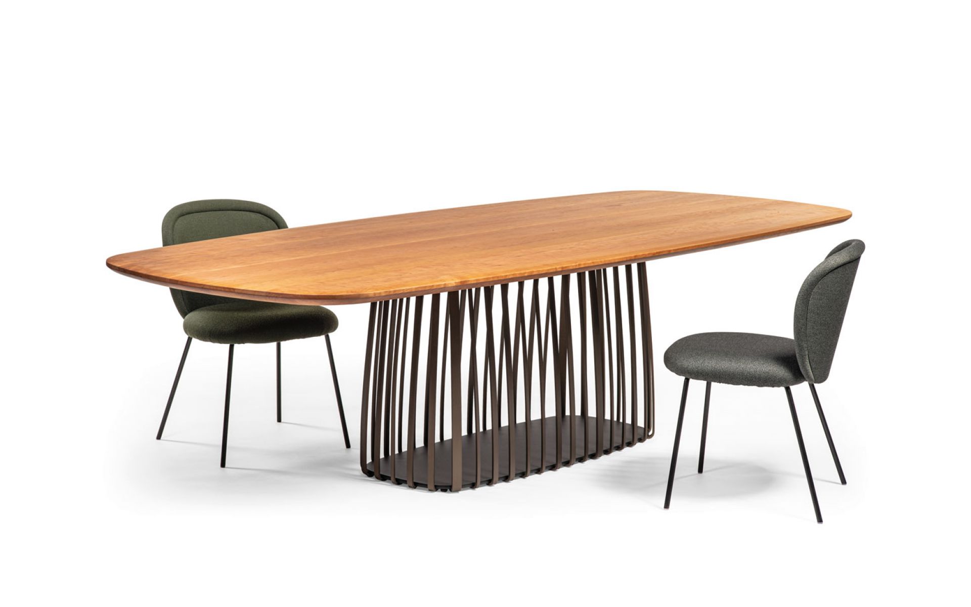 Hochwertig und charakterstark präsentiert sich der BC 07 Basket in einer edlen Kombination aus Massivholz und Metall. Das durchbrochene Gestell aus unterschiedlich breiten, sanft gebogenen Streben erzeugt einen tollen Kontrast zur imposanten Tischplatte aus geräuchertem Eichenholz bzw. Nussbaum.