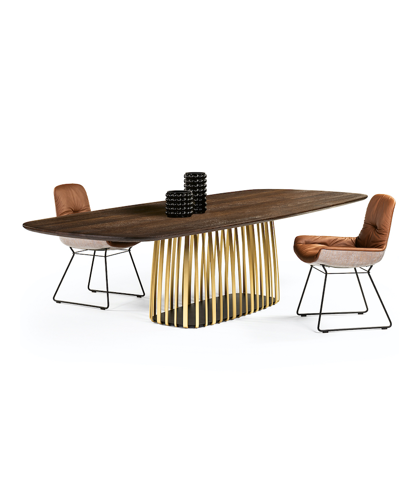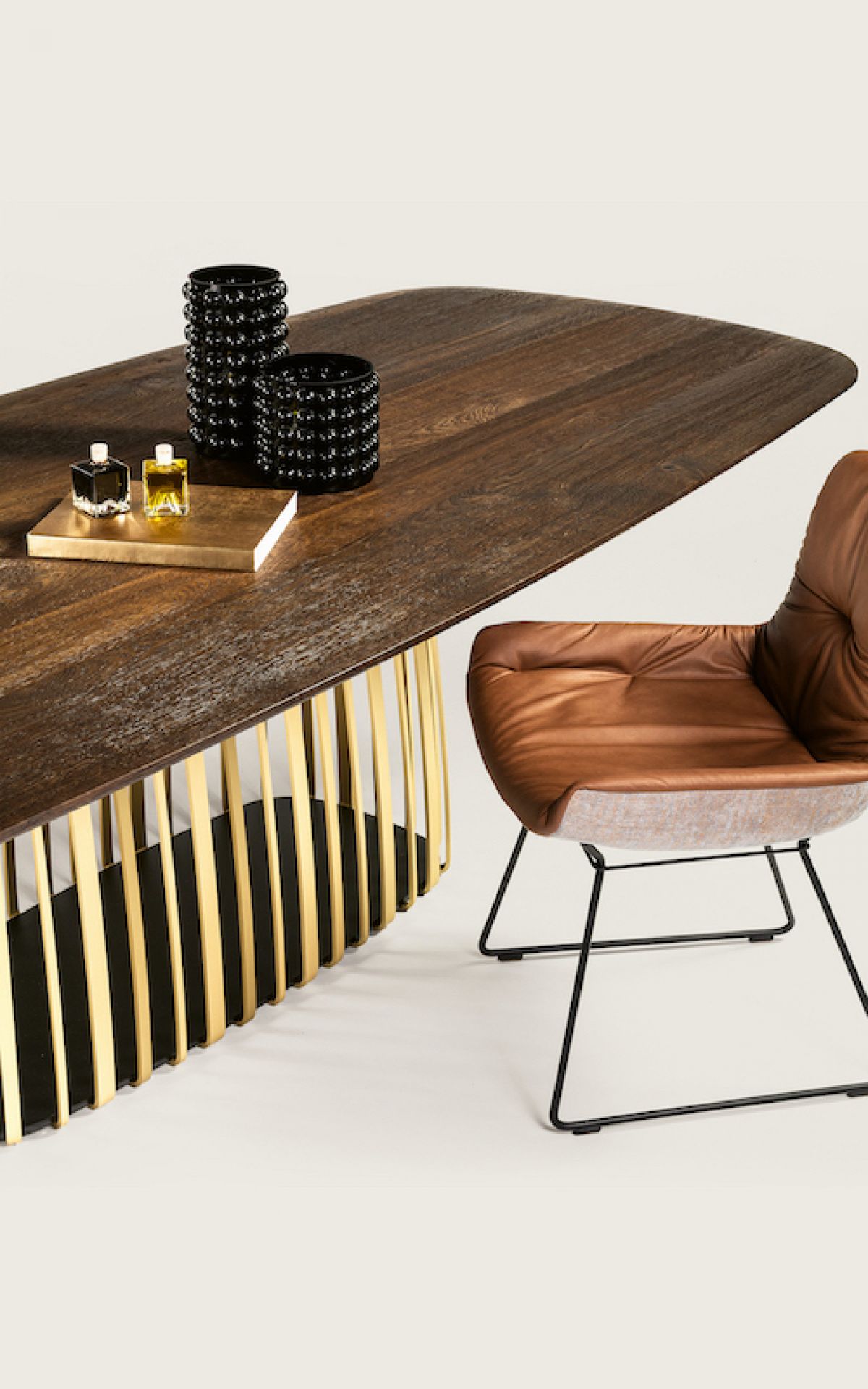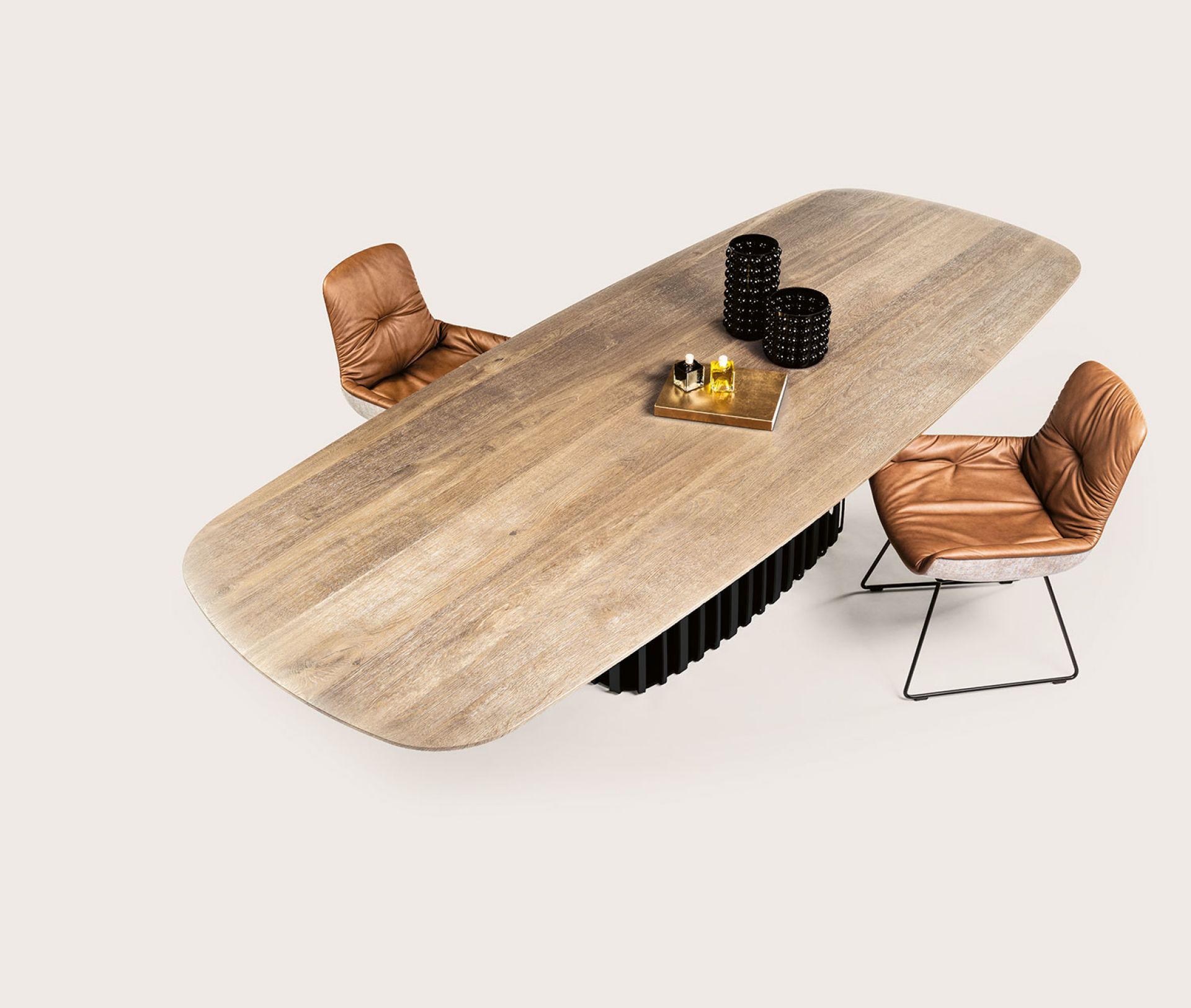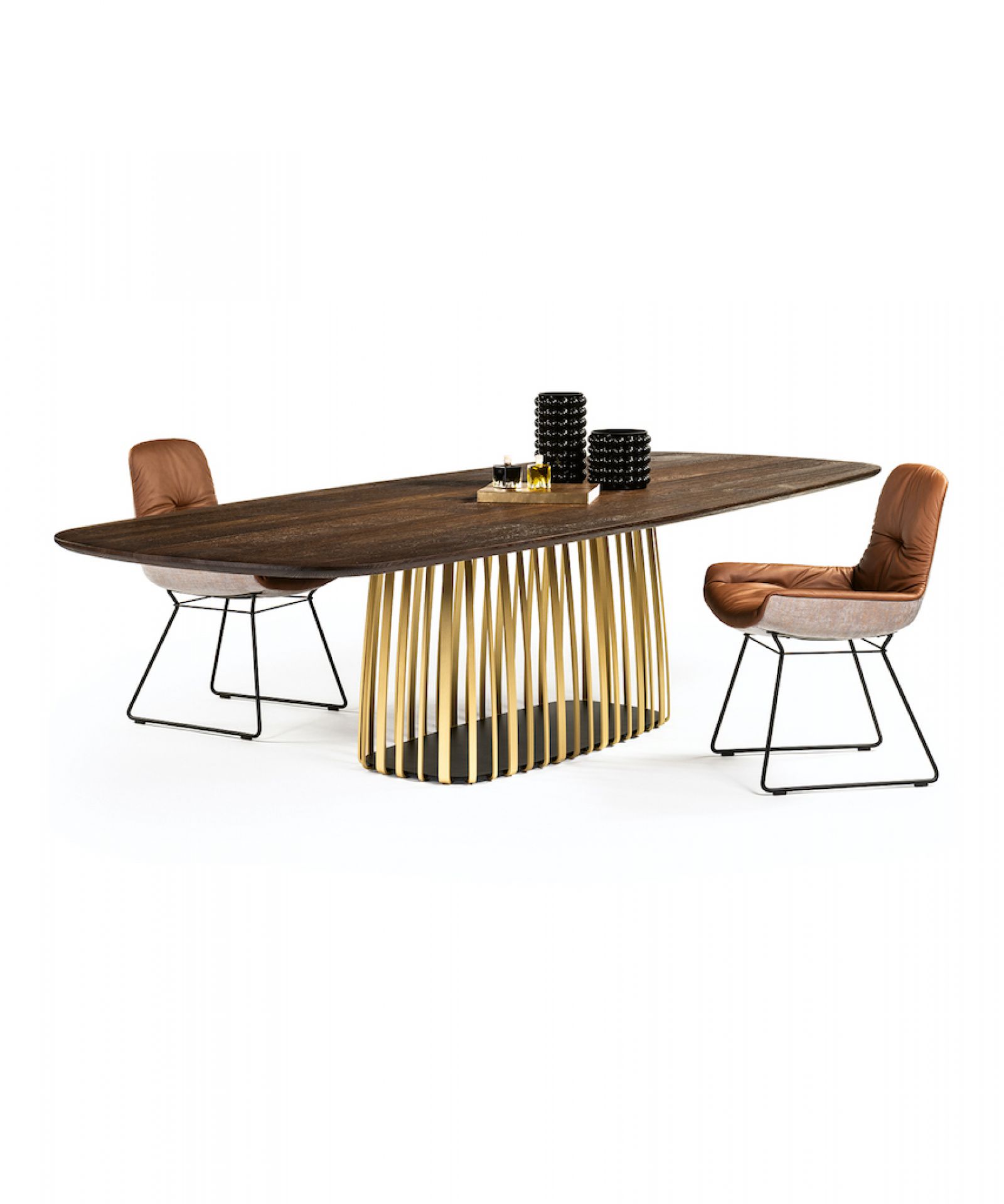 Hochwertig und charakterstark präsentiert sich der BC 07 Basket in einer edlen Kombination aus Massivholz und Metall. Das durchbrochene Gestell aus unterschiedlich breiten, sanft gebogenen Streben erzeugt einen tollen Kontrast zur imposanten Tischplatte aus geräuchertem Eichenholz bzw. Nussbaum.
