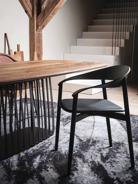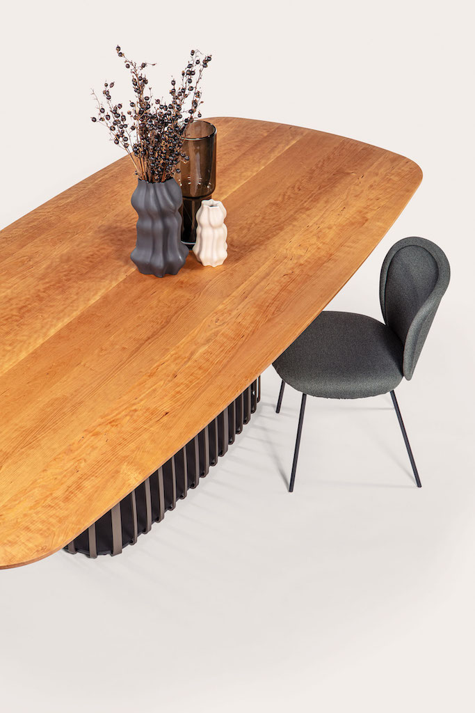 Auch bei der Tischkante hat man sich etwas Besonderes einfallen lassen. Im Einklang mit den abgerundeten Metallstreben ist auch diese komplett ausgerundet gestaltet. Hierfür wird ein eigens hergestelltes Werkzeug genutzt. So entsteht die markante Form, die stark an einen Kieselstein erinnert. Daher auch die Bezeichnung „Kieselkante”.