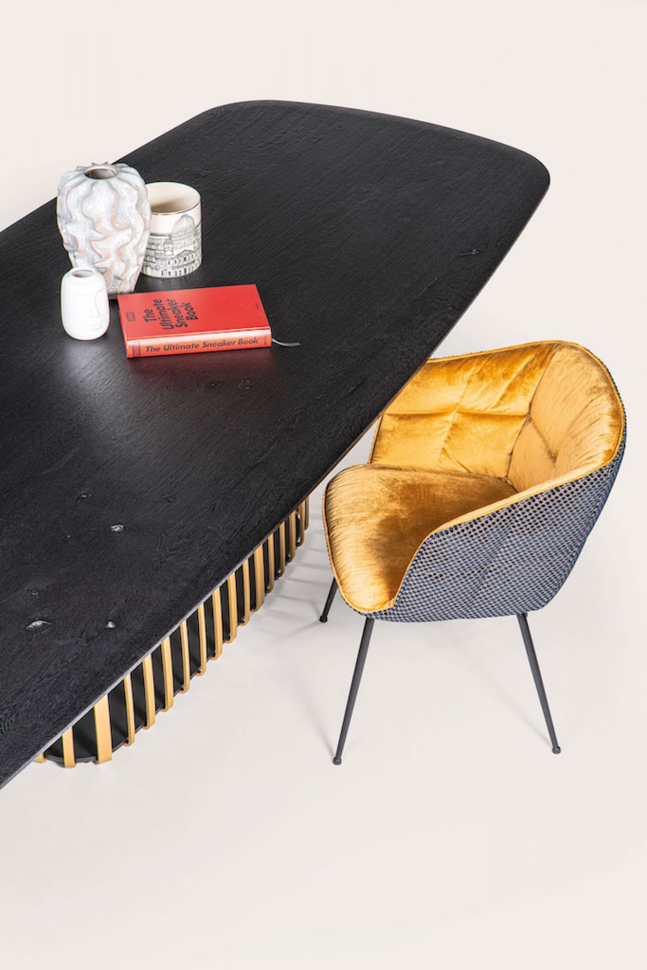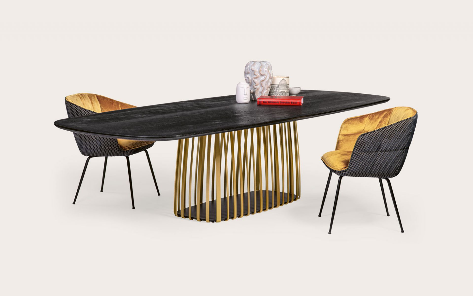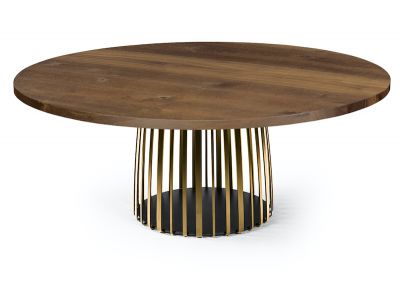 Das elegante Gestell – mit seiner markanten Korbform namensgebend für das Tischdesign – ist aus schwarz pulverbeschichtetem Stahl gefertigt. Bei der Variante mit Eichenholz können Sie das Gestell außerdem in eloxiertem, messingfarbenem Aluminium bestellen.