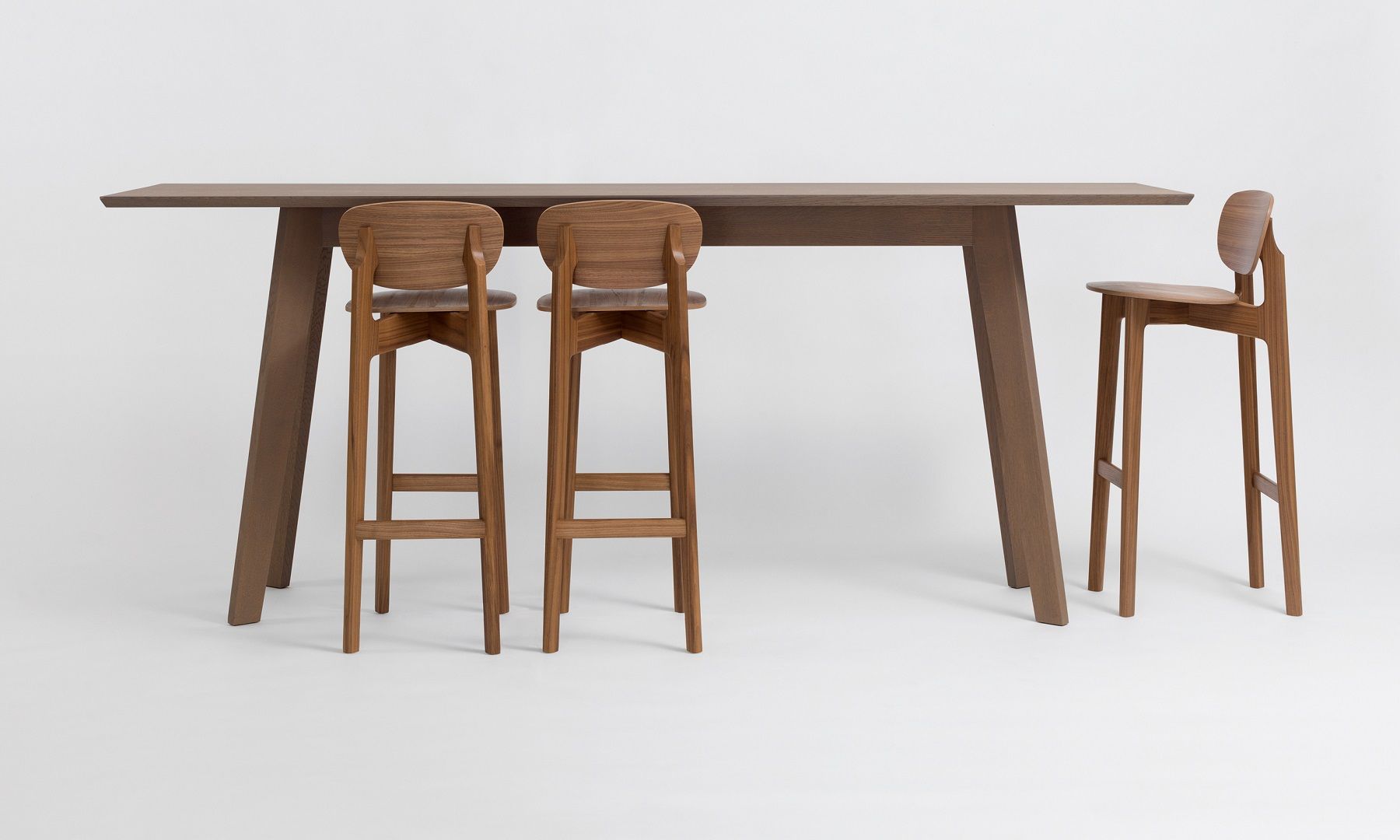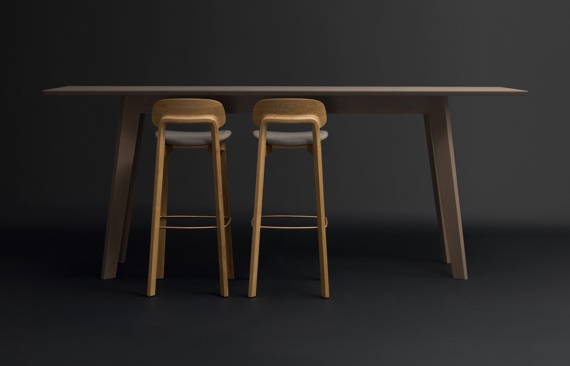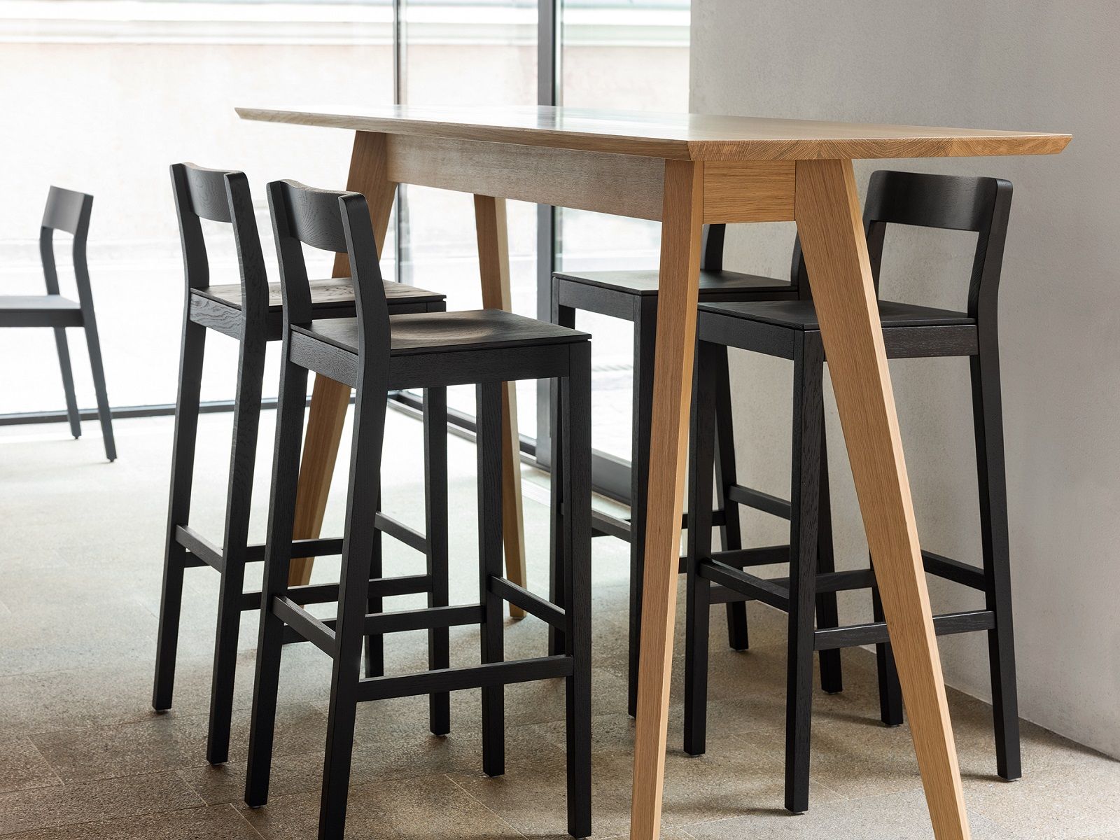 Der rechteckige High Table ist in verschiedenen Holzausführungen und Maßen erhältlich. Die Oberfläche ist mit natürlichem Hartwachsöl behandelt (Ausnahme Eiche Farbbeize – diese Variante ist matt lackiert).