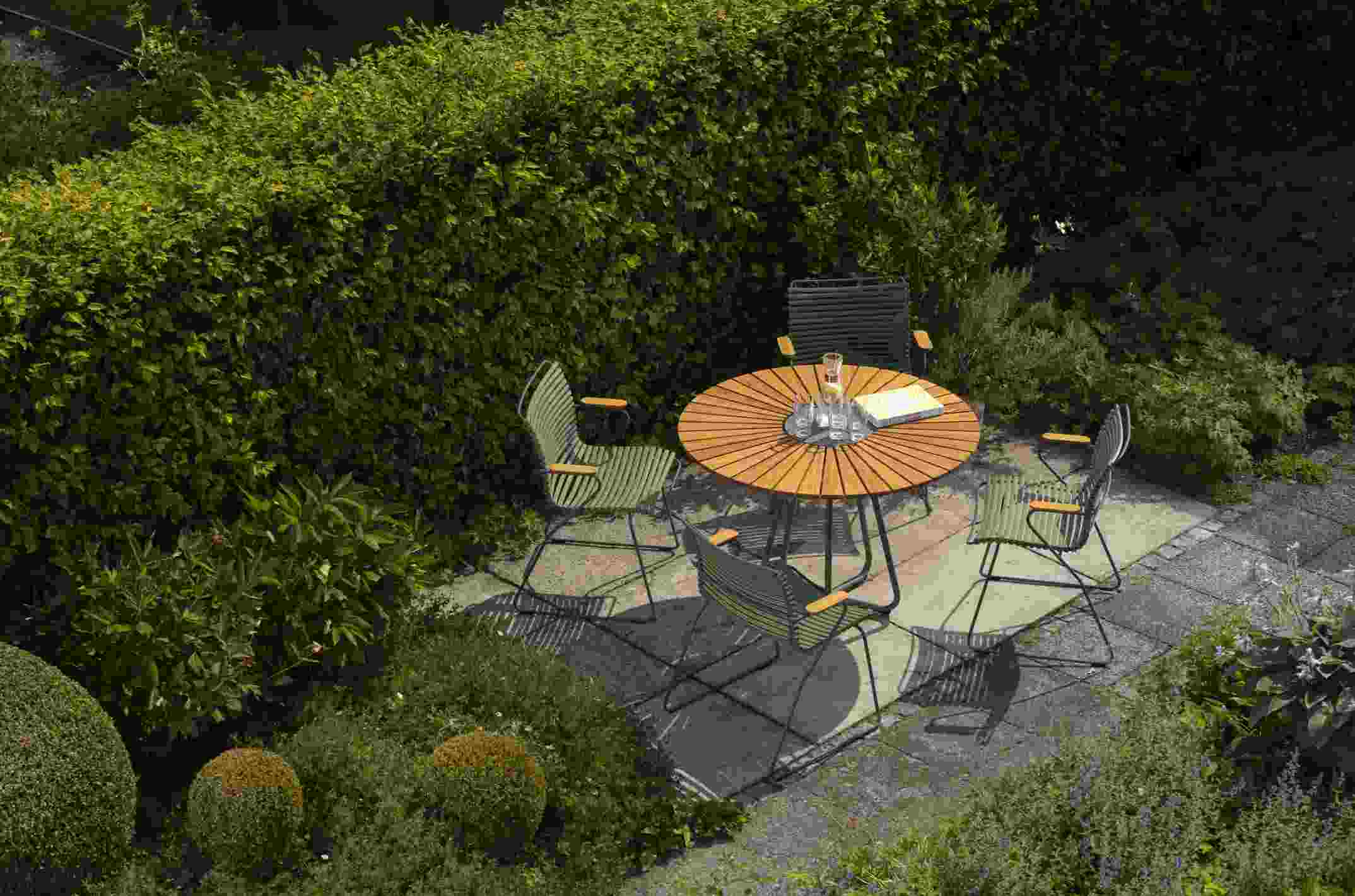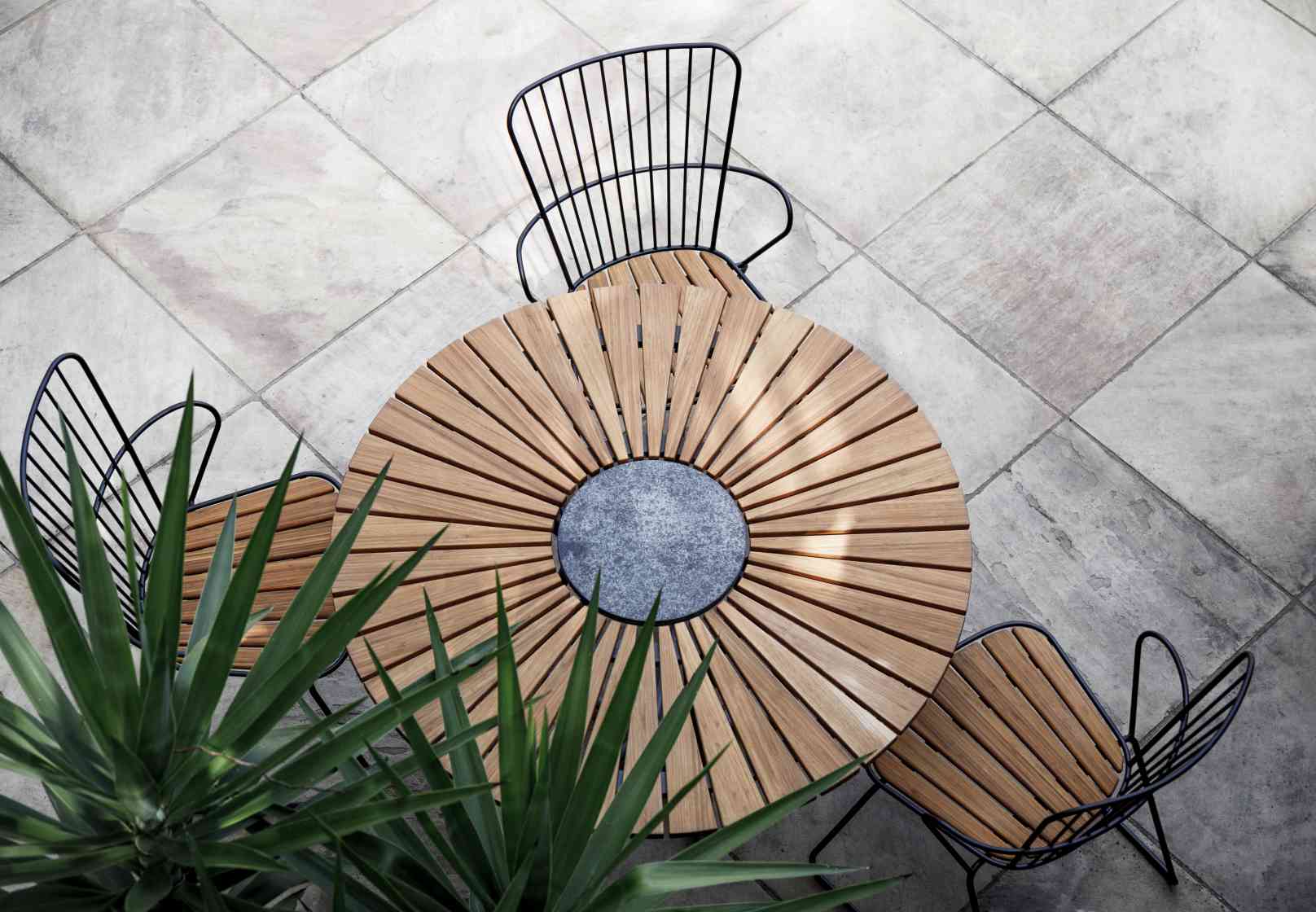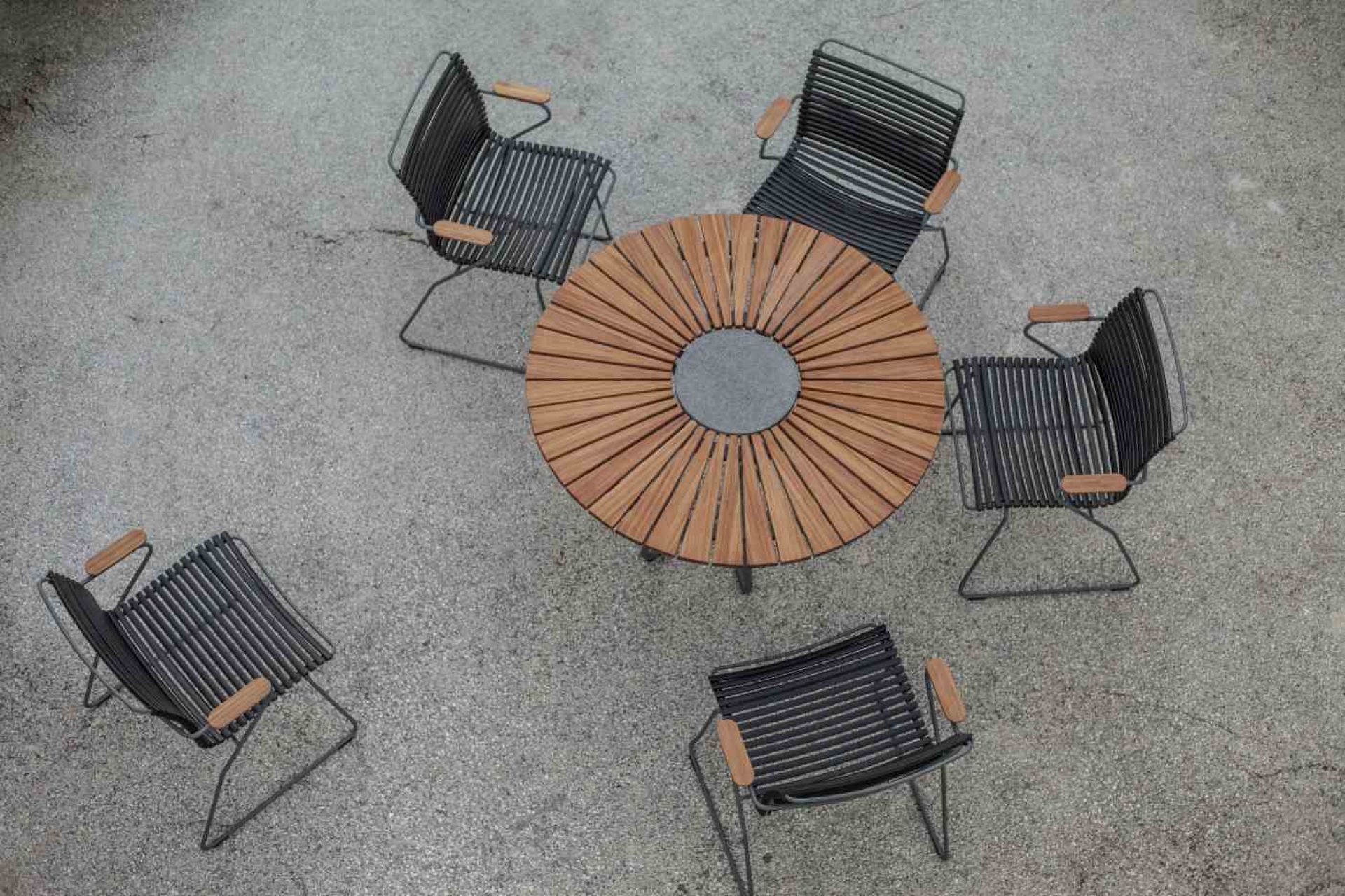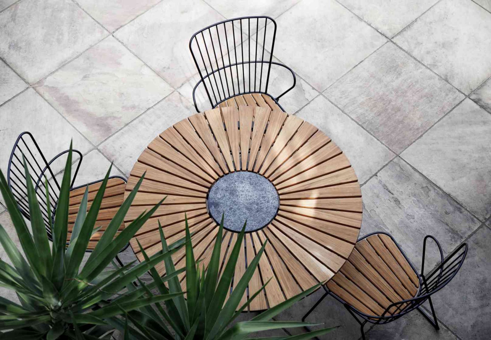 Trotz seines Durchmessers von 110 cm wirkt der Outdoortisch alles andere als schwer. Wie er das macht? Durch sein filigranes Metallgestell und durch die unterbrochene Tischplatte.