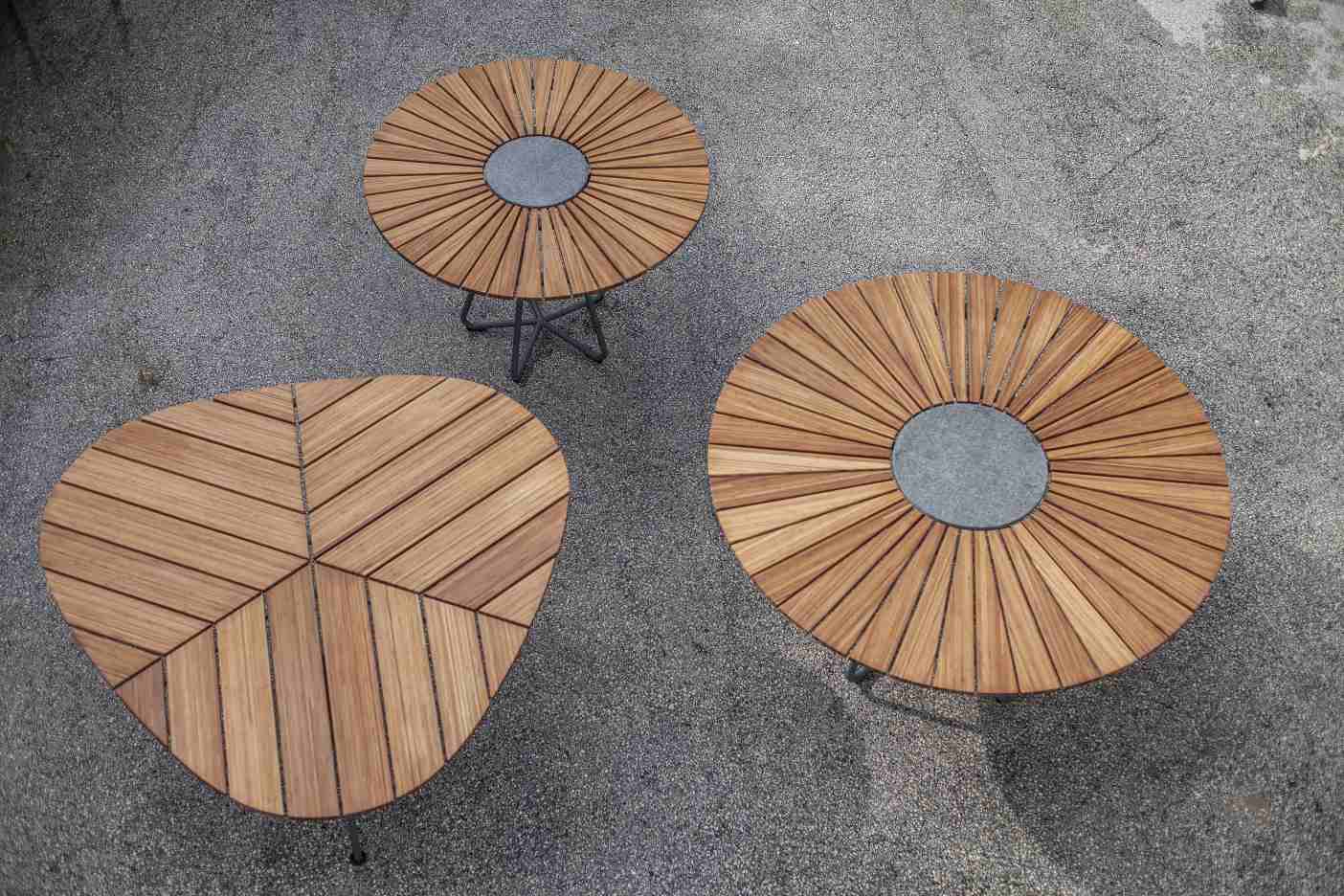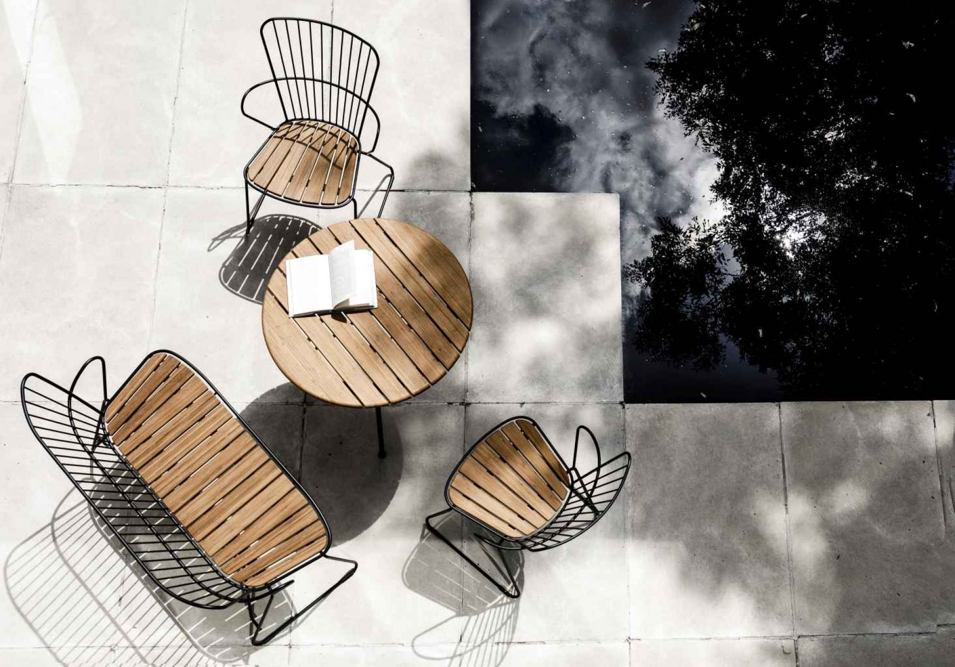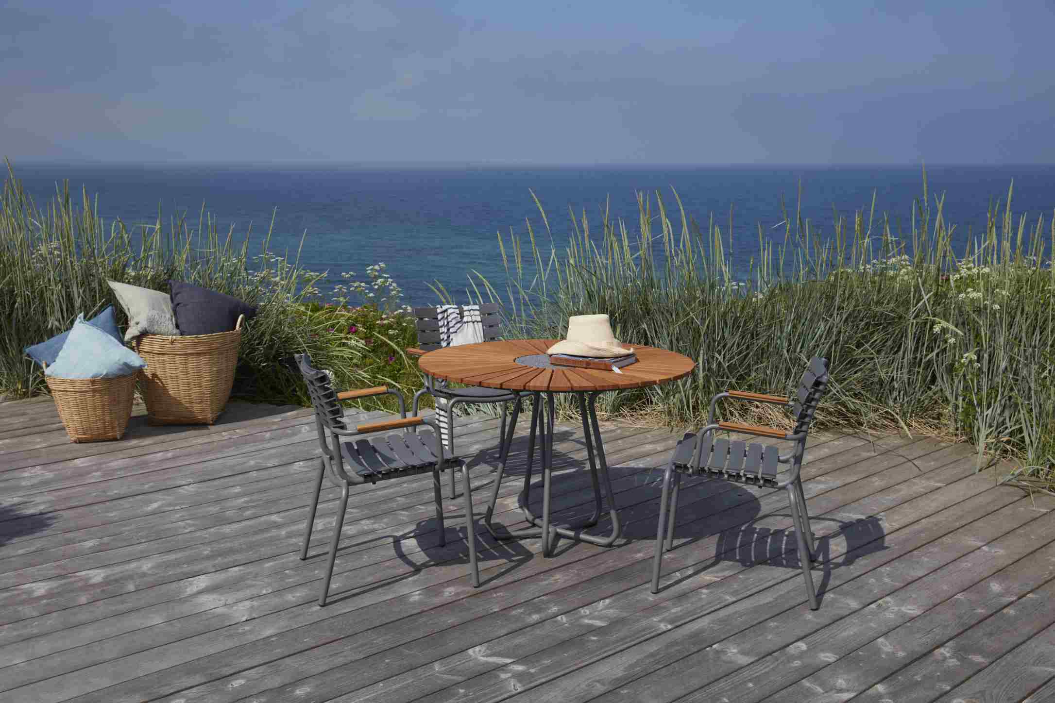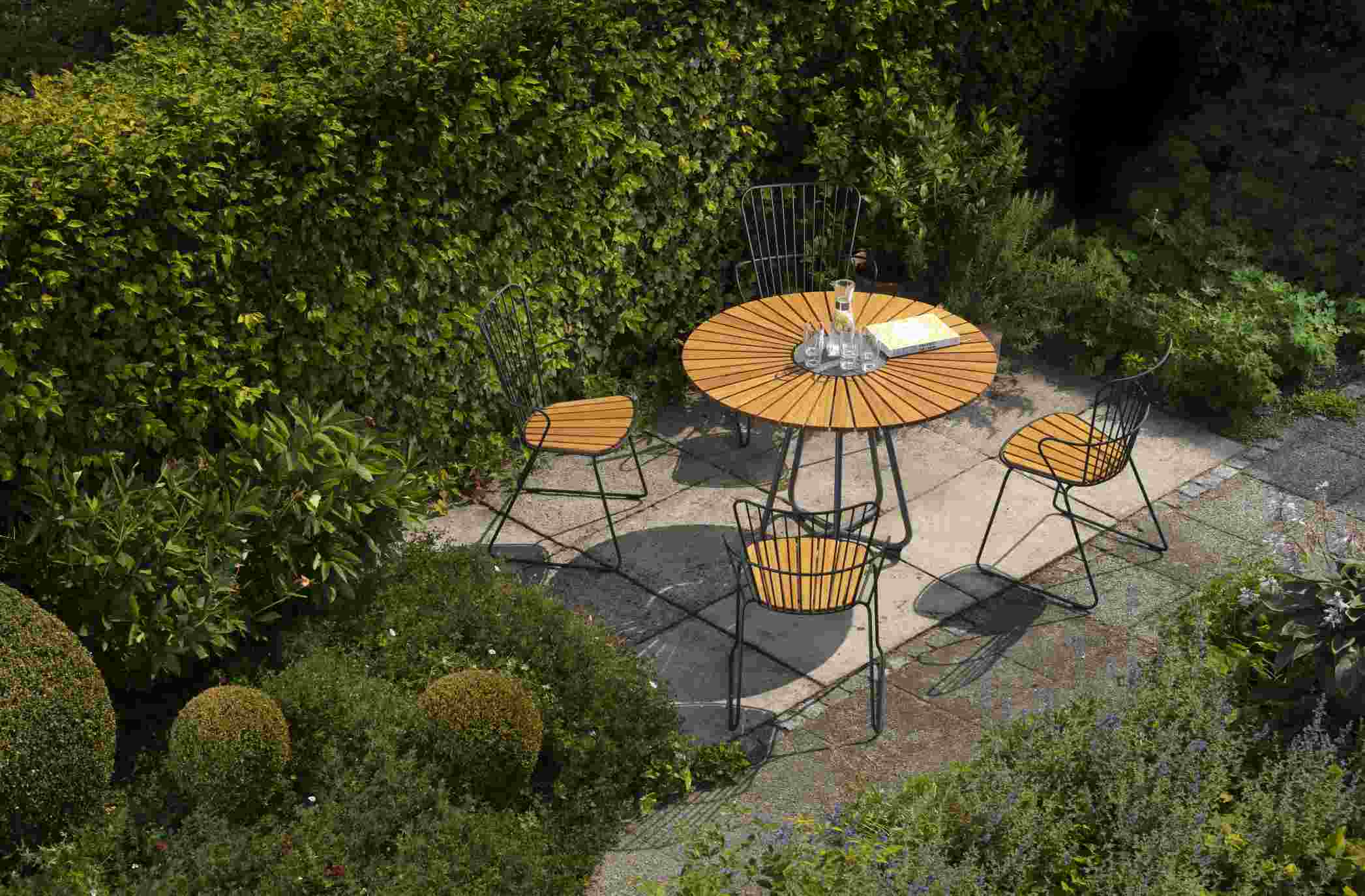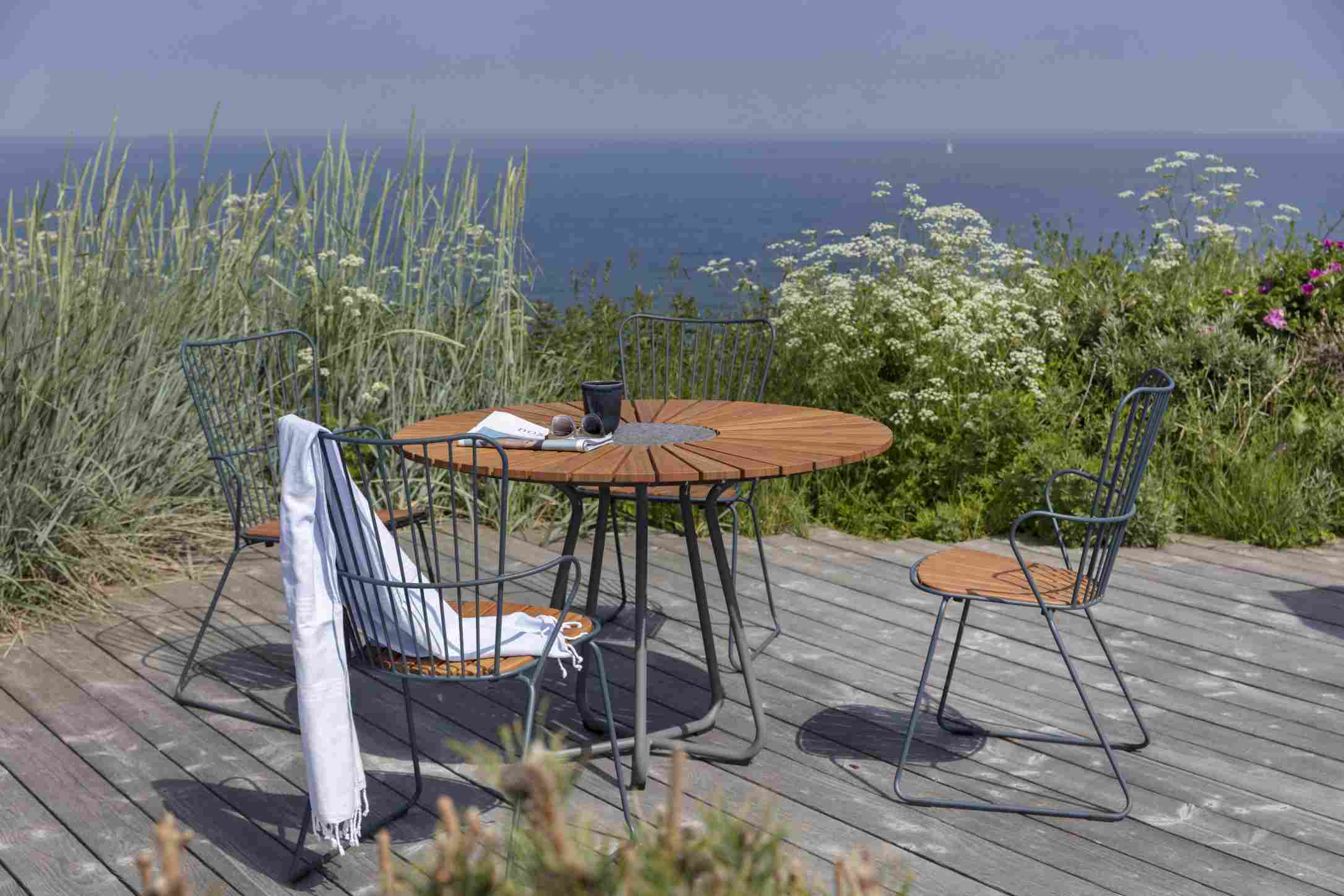 Trotz seines Durchmessers von 110 cm wirkt der Outdoortisch alles andere als schwer. Wie er das macht? Durch sein filigranes Metallgestell und durch die unterbrochene Tischplatte.