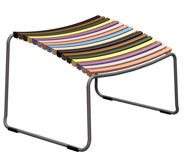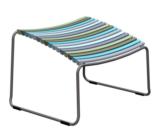 Das Gestell ist aus pulverbeschichtetem Metall gefertigt. Die Lamellen bestehen aus Kunststoff. Der Click Fußhocker ist 56,4 cm breit, 50 cm tief und 39 cm hoch.