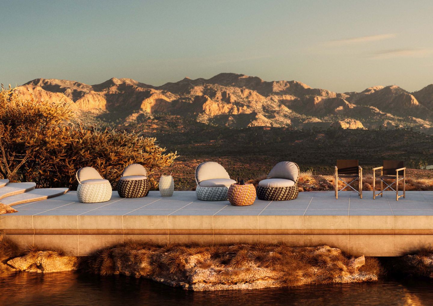 Designer Stephen Burks hat sich bei seiner spannenden Dala Kollektion vom Kunsthandwerk und improvisierten Sitzmöglichkeiten aus den Entwicklungsländern inspirieren lassen. Jedes Stück basiert auf einem pulverbeschichteten Rahmen aus Aluminium, in den die farbenfrohen Stränge der innovativen Dedon Faser eingeflochten werden. Jedes Exemplar ist dabei ein Stück Handwerkskunst, denn die äußere Struktur wird von Dedons hauseigenen Flechtern von Hand gefertigt.