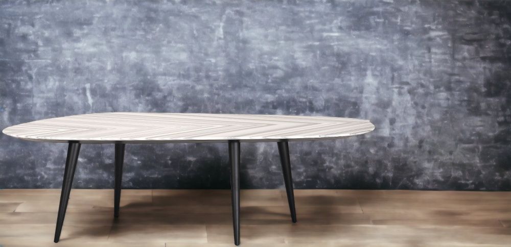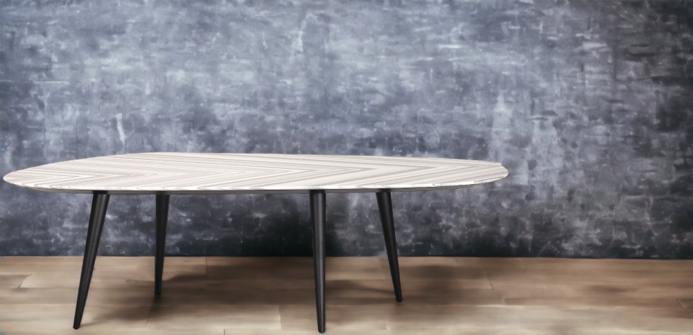 Das verstärkte Gestell besteht aus konisch zulaufenden Stahlrohrbeinen und einer Tischplatte aus MDF. Er trägt die beiden gestreiften Marmorplatten, die so angeordnet sind, dass die Maserung ein Rautenmuster bildet.
