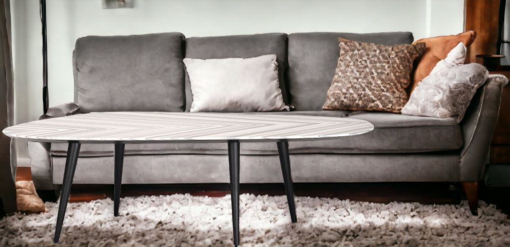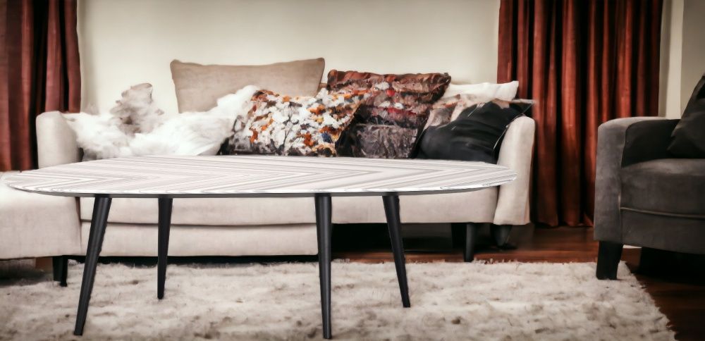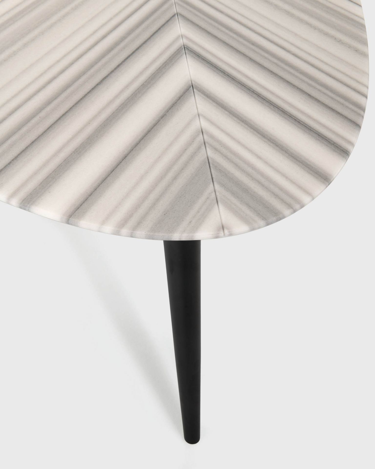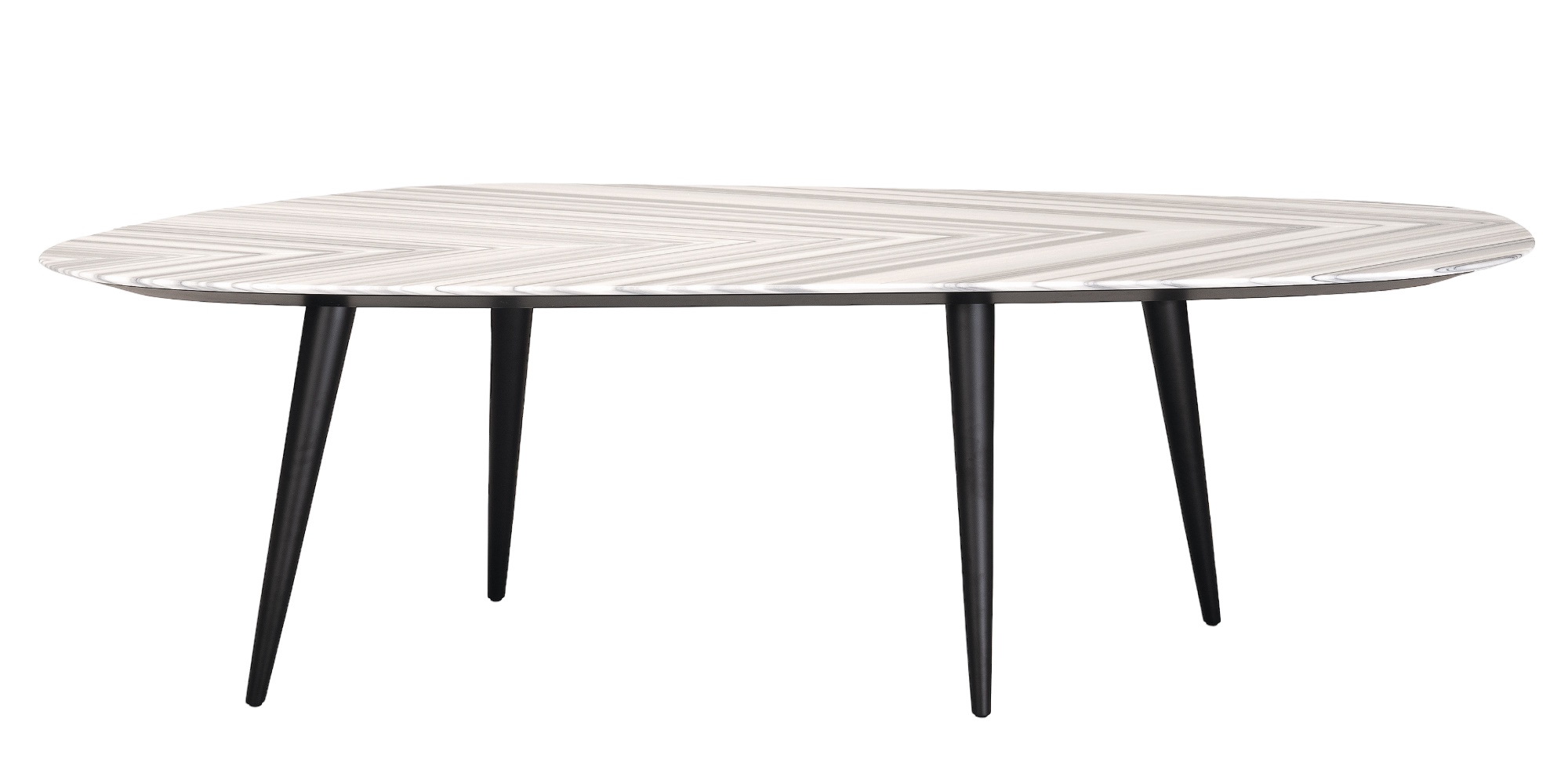 Die Tweed-Kollektion wurde um eine einzigartige Ausführung in Marmor erweitert: Tweed Marble. Dieser Tisch hat eine Platte aus weißem Marmor Striato Olimpico mit markanten horizontalen grauen Adern. Das ursprüngliche Konzept wurde beibehalten: Das Design nutzt die natürliche Maserung des Materials, um ein grafisches Zeichen zu schaffen. Dieses Zeichen verläuft diagonal über die Tischplatte und teilt sie wie ein Blatt in zwei Hälften.