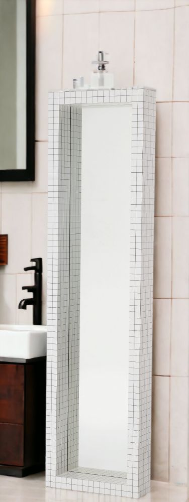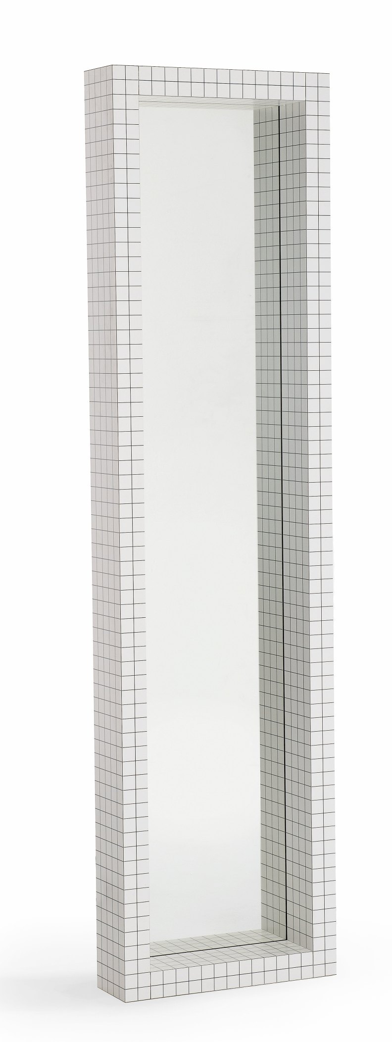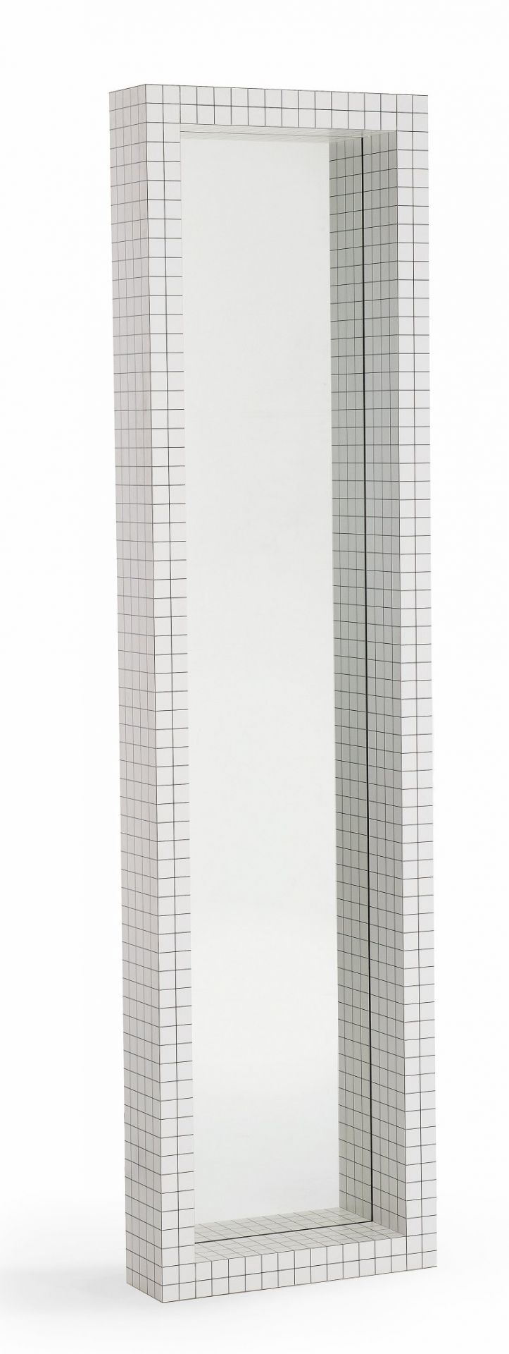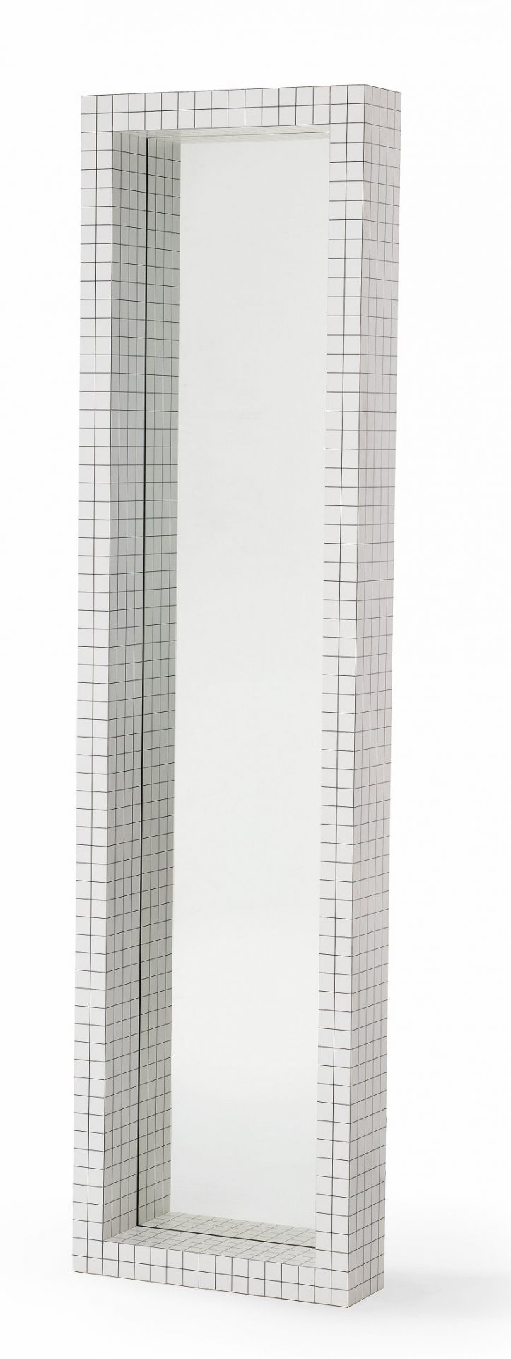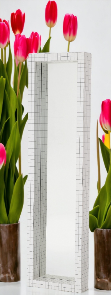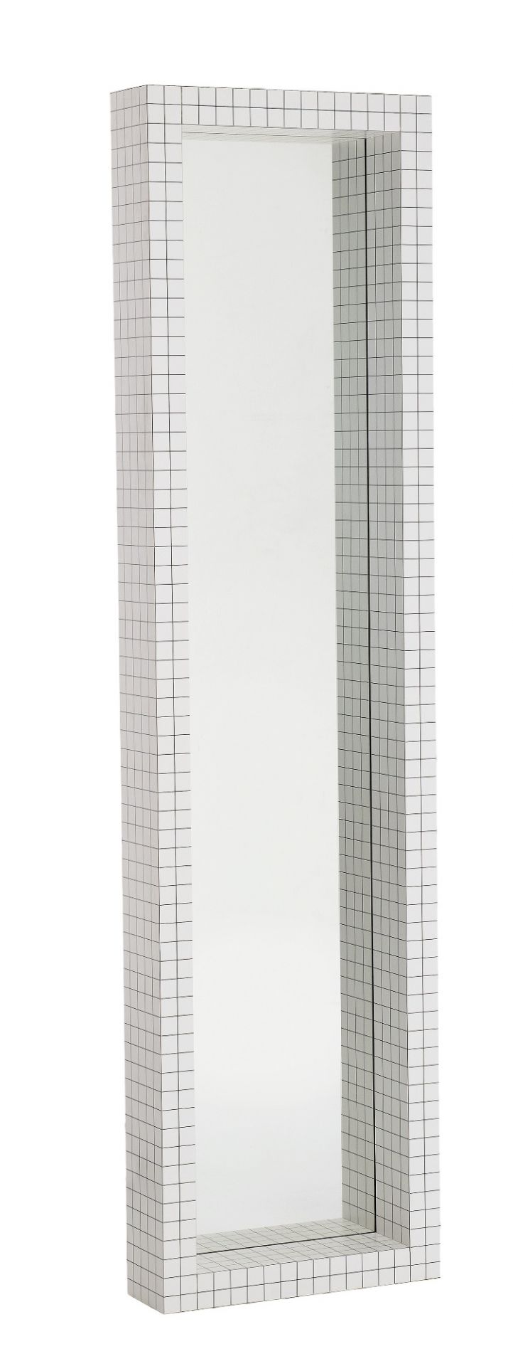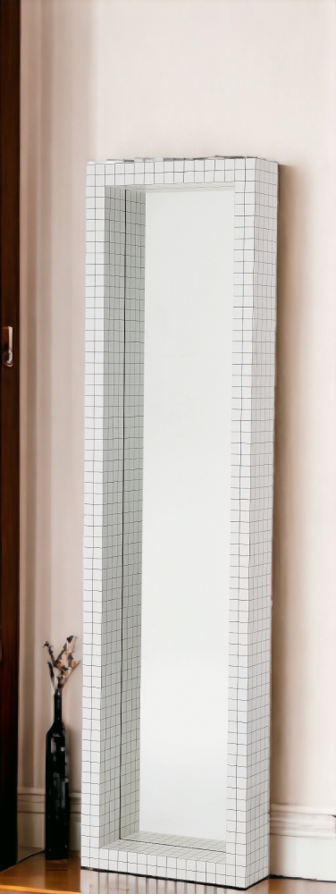 Der Spiegel besteht aus Sperrholz mit weißem Print, Kristallglas. Der Spiegel misst 51 cm in der Breite, 15 cm in der Tiefe und 195 cm in der Höhe.