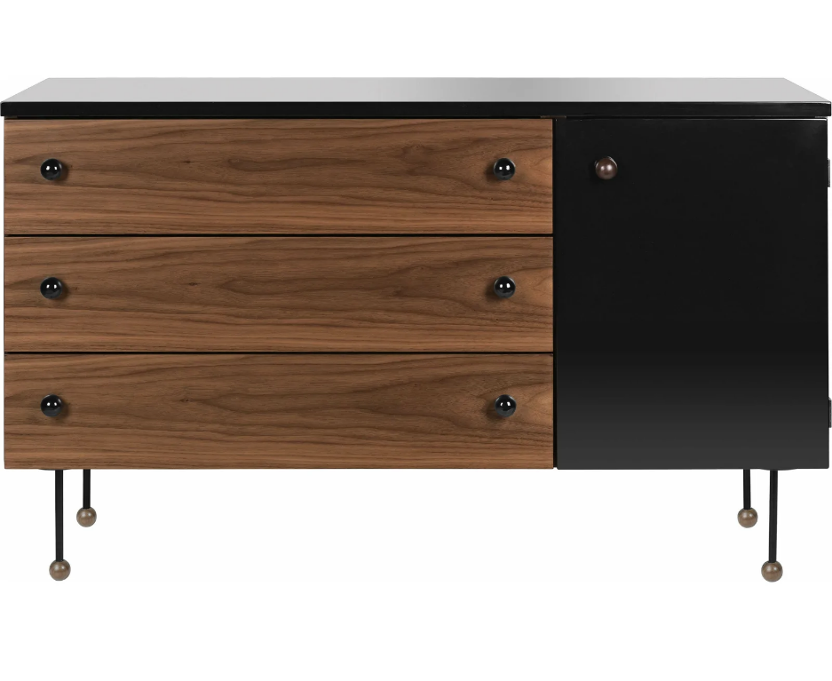 Im Jahr 1952 entwarf Greta M. Grossman die 62er-Serie, wozu auch das 62 Sideboard gehört. Zum Zeitpunkt des Entwurfs wurde diese Kollektion schon als ihrer Zeit um zehn Jahre voraus angesehen und erhielt so ihren Namen. Die Symbiose aus dem luxuriösem Nussbaum, den schlanken Beinen aus Metall mit den charakteristischen kugelförmigen Füßen sowie den schwarzen Hochglanzakzenten kreiert eine tiefe Eleganz für Ihren Wohnraum.