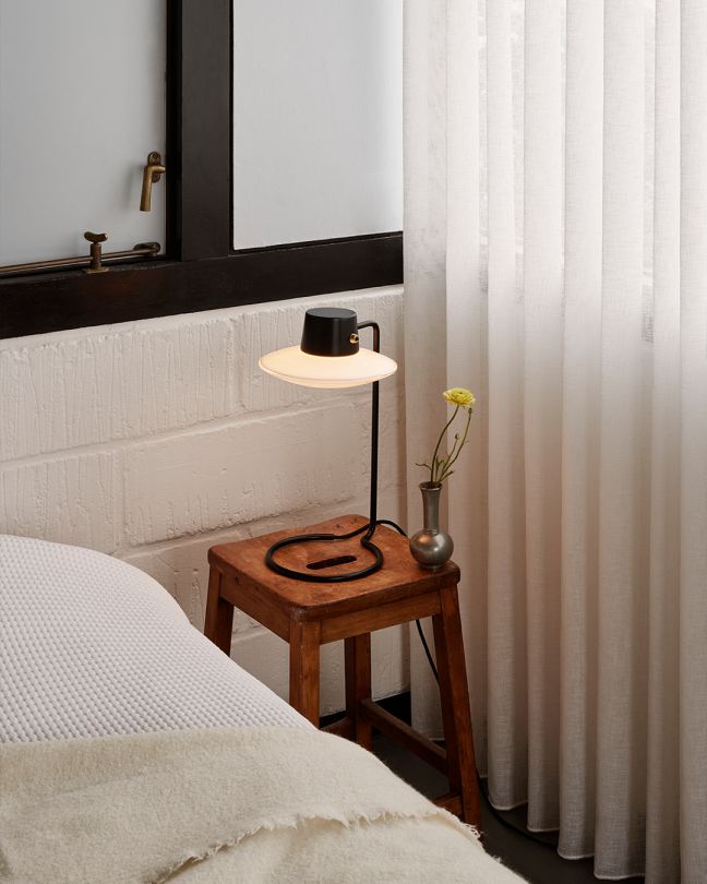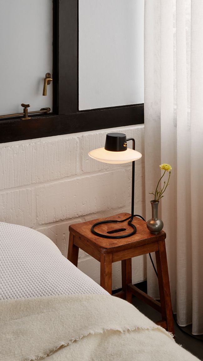 Die AJ Oxford Tischleuchte wird aus dreischichtigem und mundgeblasenem Opalglas sowie nasslackiertem Ständer und Schirm aus Stahl gefertigt. Ein weiteres Detail: Die Überwurfmutter und Rändelschraube aus unbehandeltem Messing mit feiner, im Uhrzeigersinn verlaufender Linienstruktur. Diese Besonderheit führt dazu, dass sich im Laufe der Zeit eine Patina auf dem unbehandelten Messing bildet.