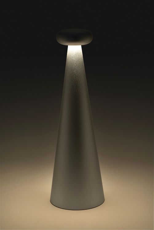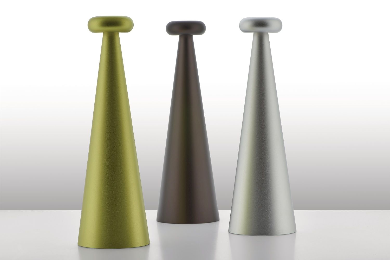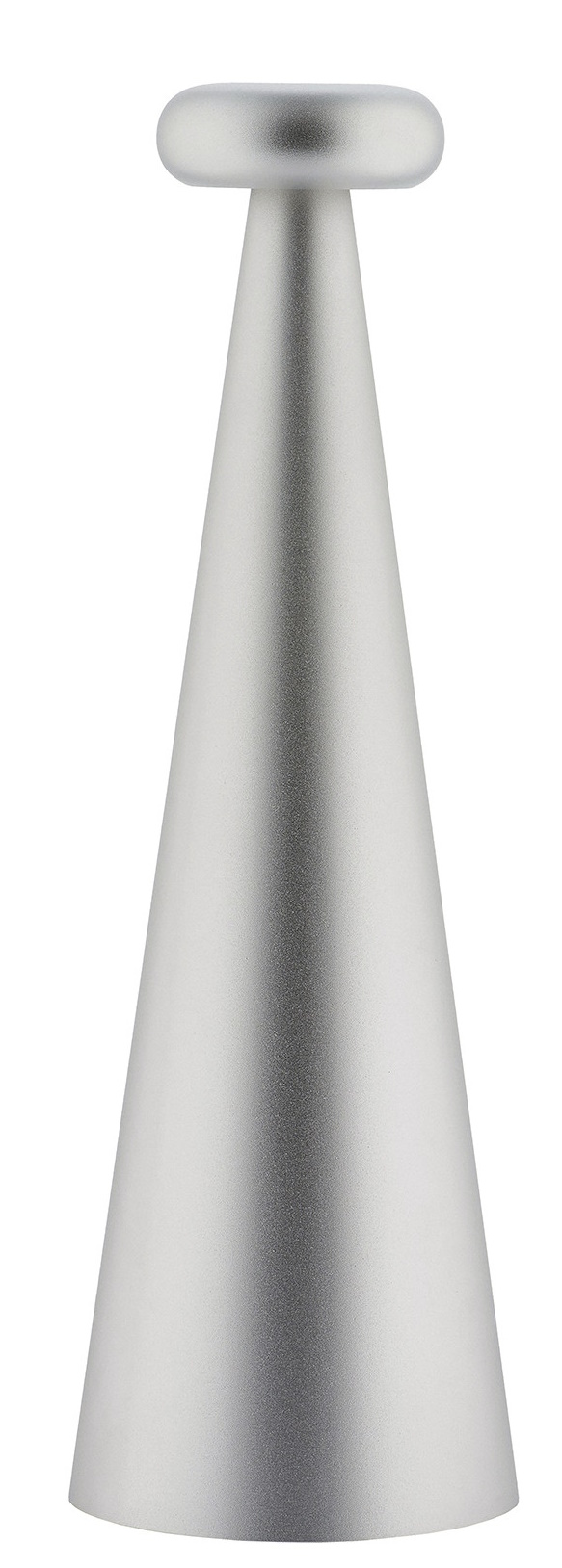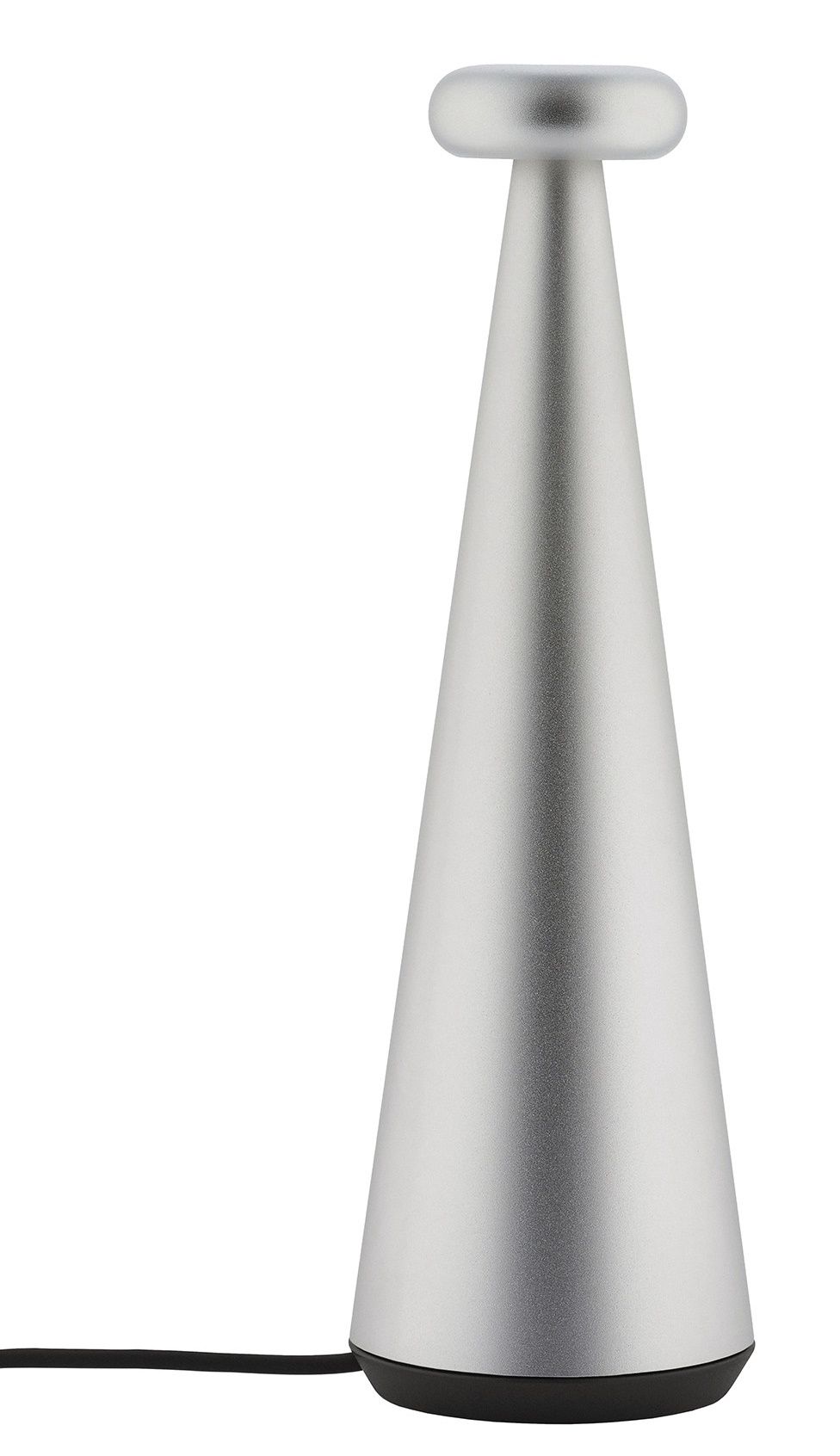 Die Tischleuchte ist gefertigt aus eloxiertem Aluminium. Sie hat einen Durchmesser von 8 cm und ist 26,1 cm hoch.