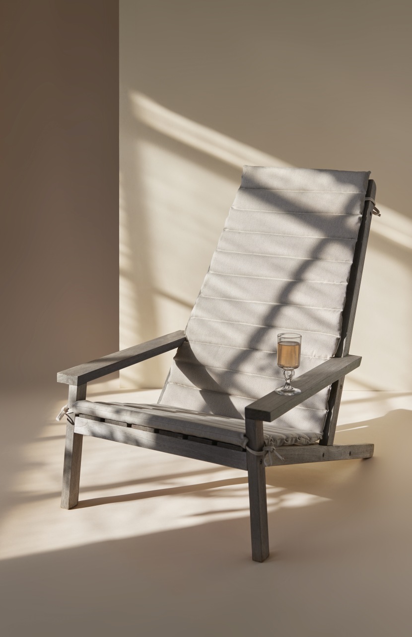 Das Between Lines Cushion lehnt sich an die markanten Holzlatten des passenden Liegestuhls an und besteht aus Oeko-Tex®-zertifiziertem, wetterfestem Stoff, der auch bei widrigen Bedingungen seine ansprechende Optik behält. Sein schnell trocknendes und atmungsaktives Design, gepaart mit einem stützenden Outdoor-Schaumstoff, garantiert höchsten Sitzkomfort.