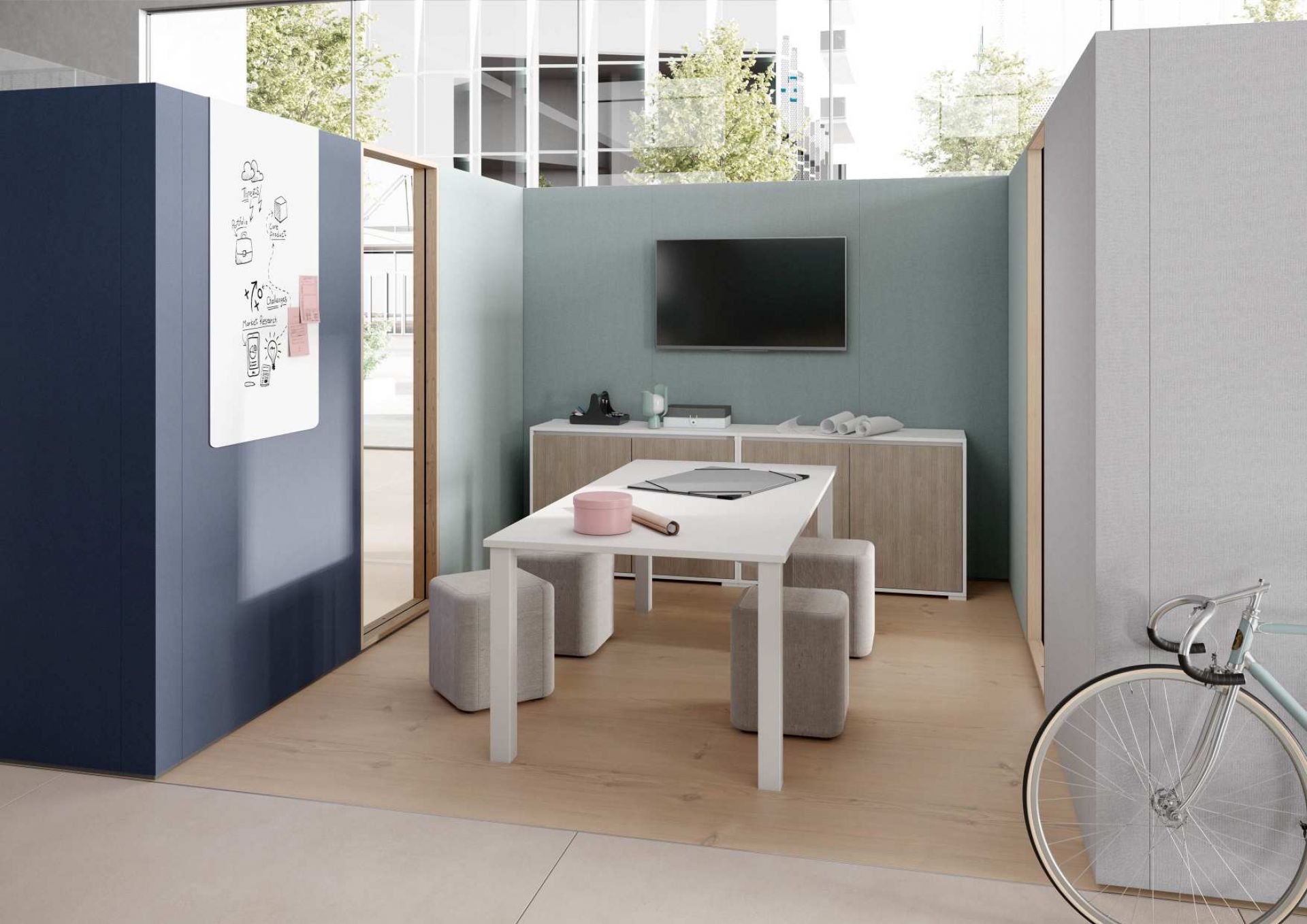 Längere Telefonate oder Besprechungen am Arbeitsplatz können in einer modernen Arbeitswelt die alltägliche Arbeit stören. Um in offenen Räumen Zonen für Besprechungen und zum Rückzug zu ermöglichen, können sogenannte Meetingboxen eingesetzt werden.