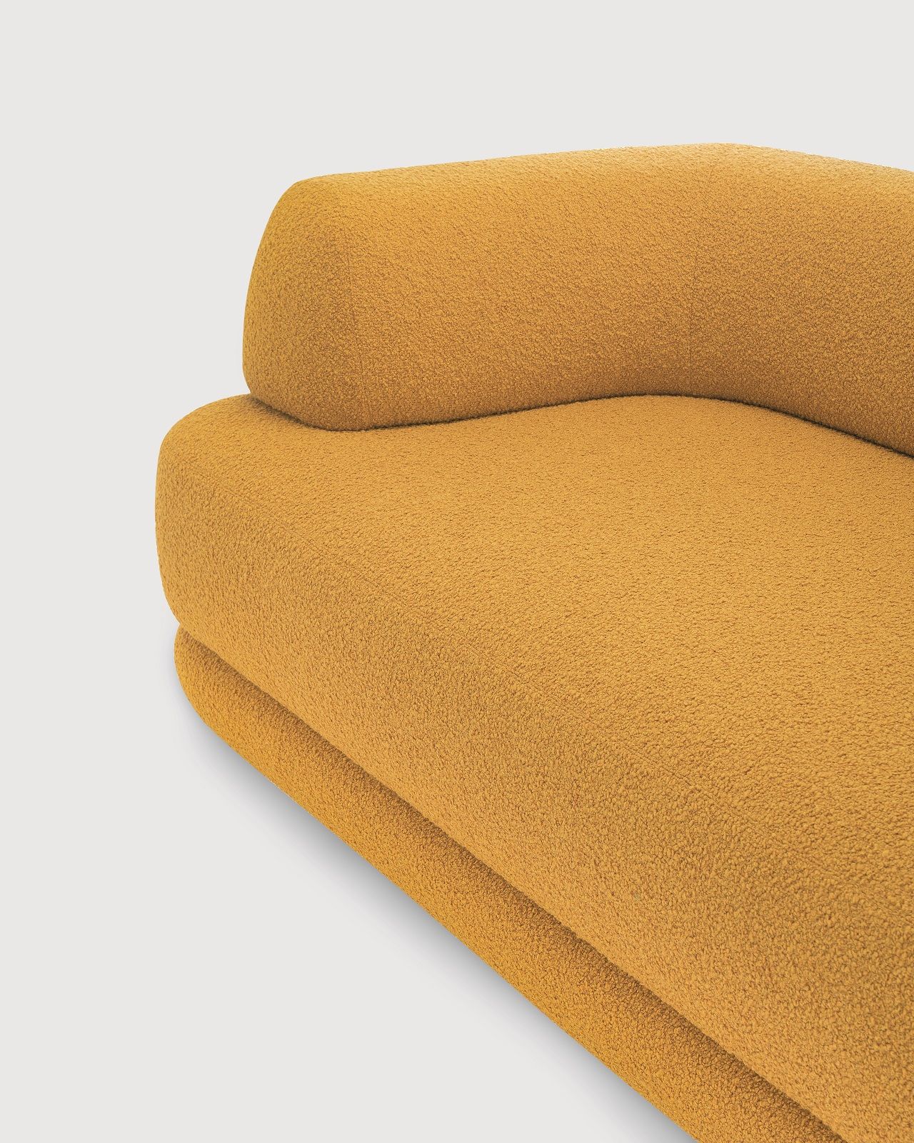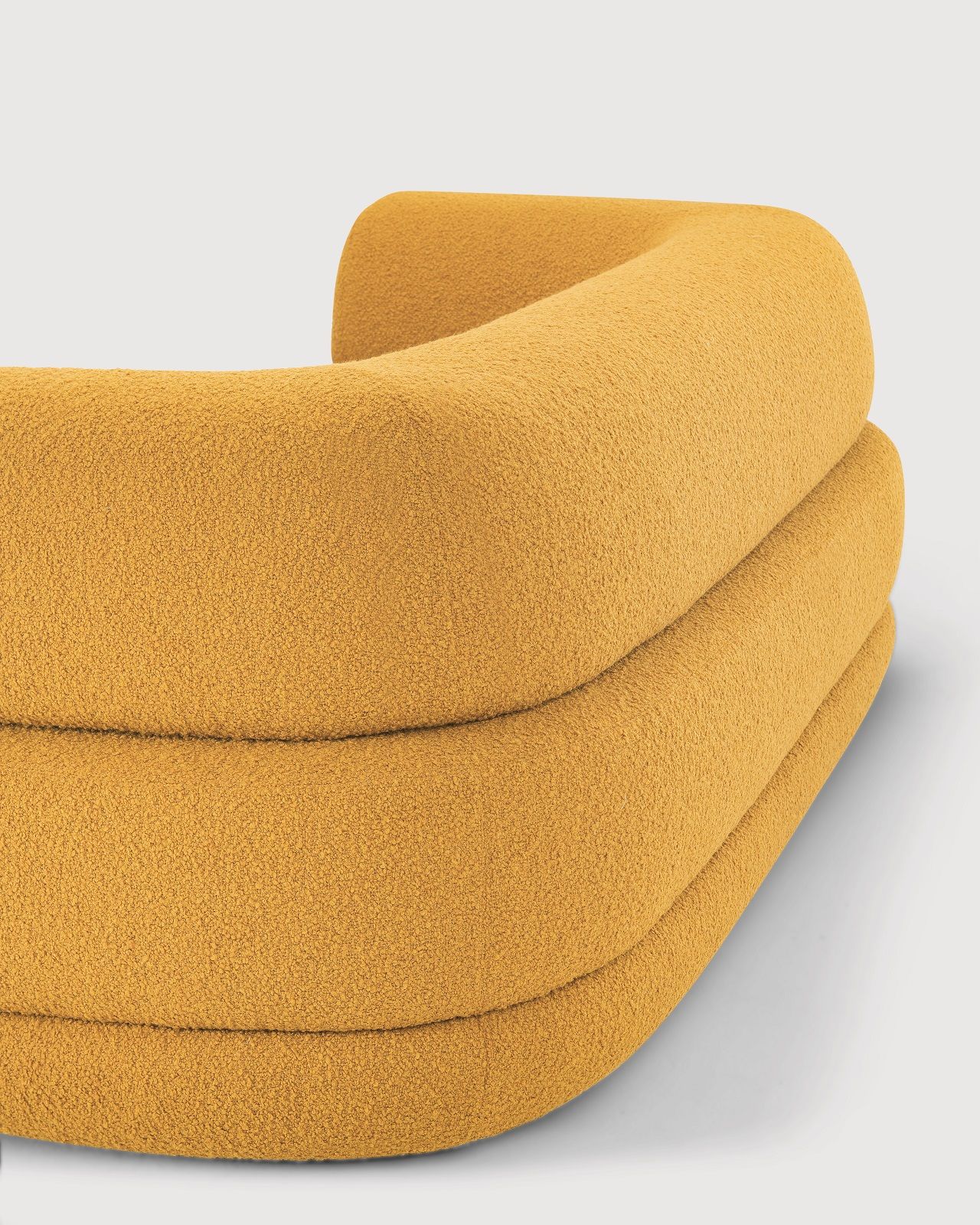 Die faszinierende Struktur des Bumpers setzt auf hochwertiges Holz als Basis für seine weiche Form. Die sorgfältige Polsterung mit abgestuftem Polyurethan und Dacron Du Pont macht das Sofa zu einer einladenden und luxuriösen Sitzgelegenheit. Die mit recycelten Polyesterflocken gefüllten Kissen tragen nicht nur zu einem nachhaltigen, sondern auch äußerst angenehmen Sitzerlebnis bei. Ein zusätzliches Highlight ist der abnehmbare Stoffbezug, der die Hochwertigkeit unterstreicht, während die recycelten Polyesterflocken für eine optimale Rückenunterstützung sorgen. Komfort und Umweltbewusstsein gehen hier eine entspannte Verbindung ein.