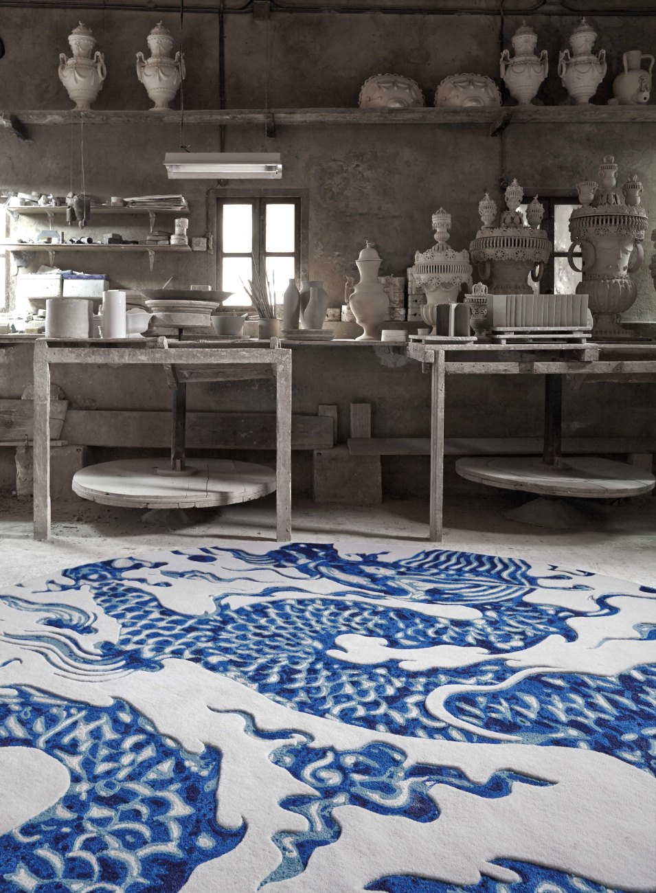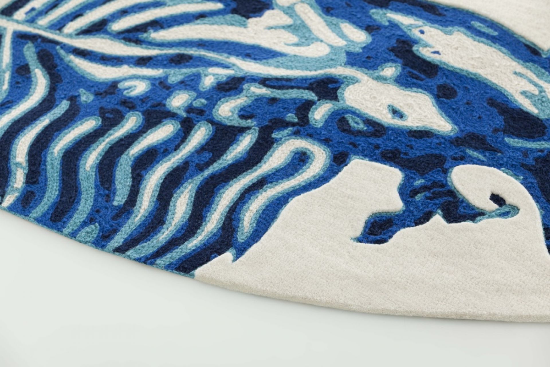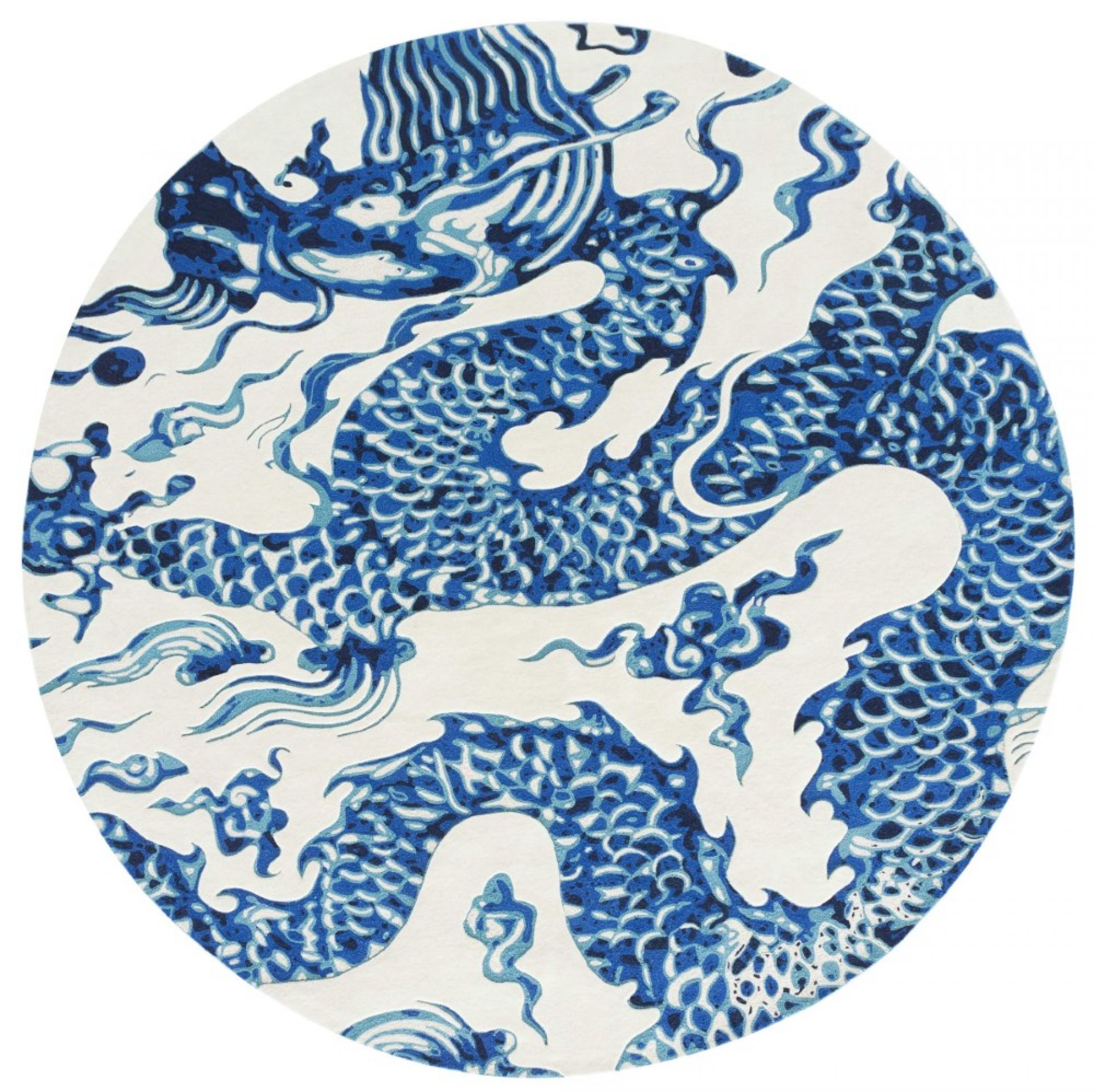 Mit einem Durchmesser von 250 cm besitzt der Cadeneta Teppich von GAN eine ganz beachtliche Größe. Das asiatische blau-weiße Drachenmuster, gestaltet von Designerin Mapi Millet, bringt den Zauber von Fernost in Ihr Zuhause.