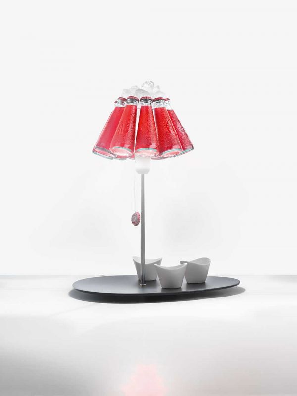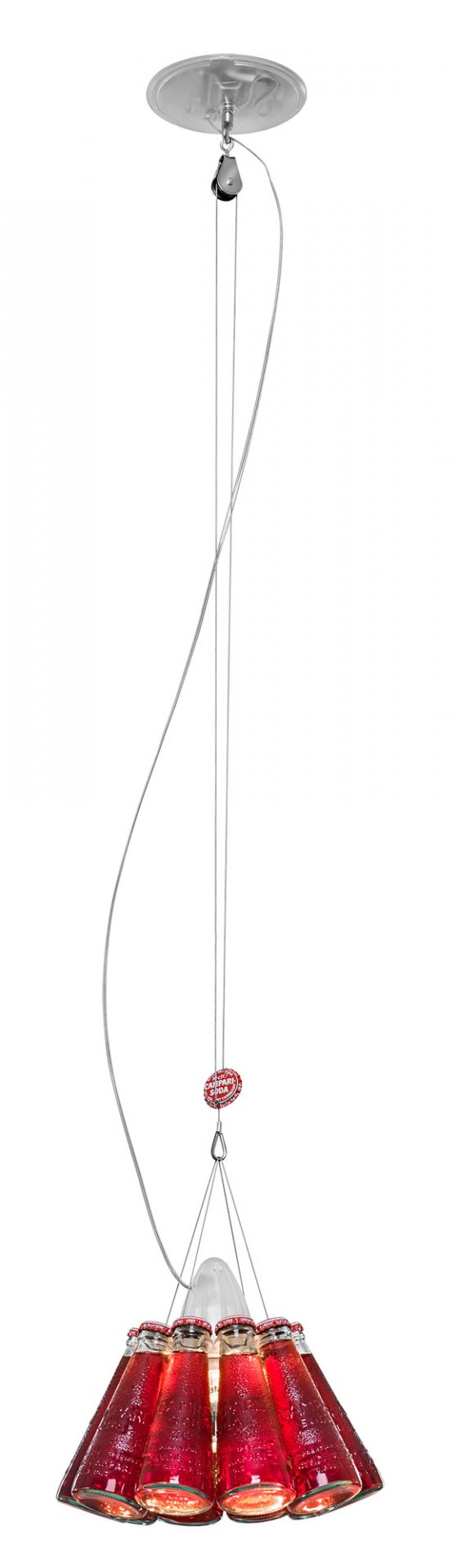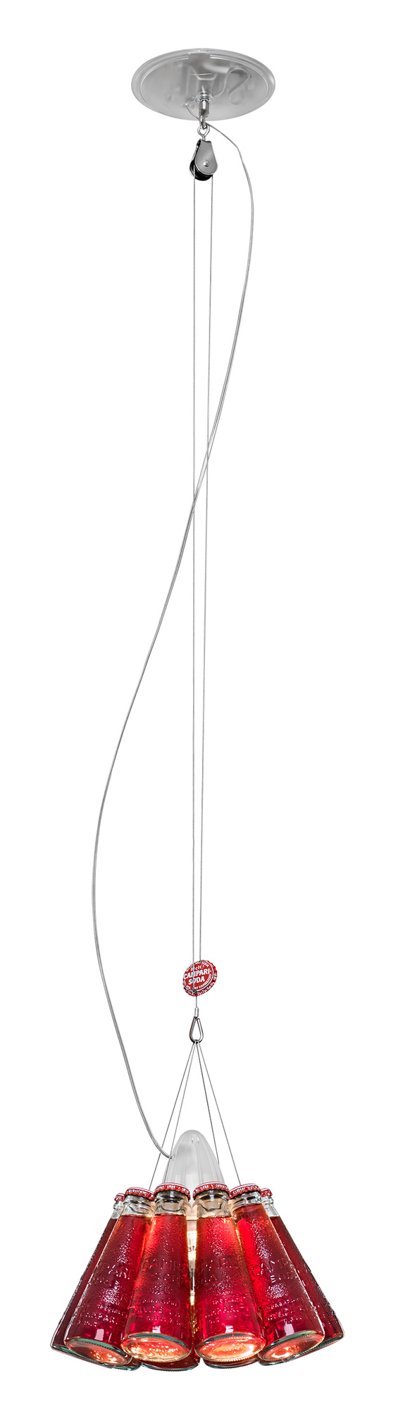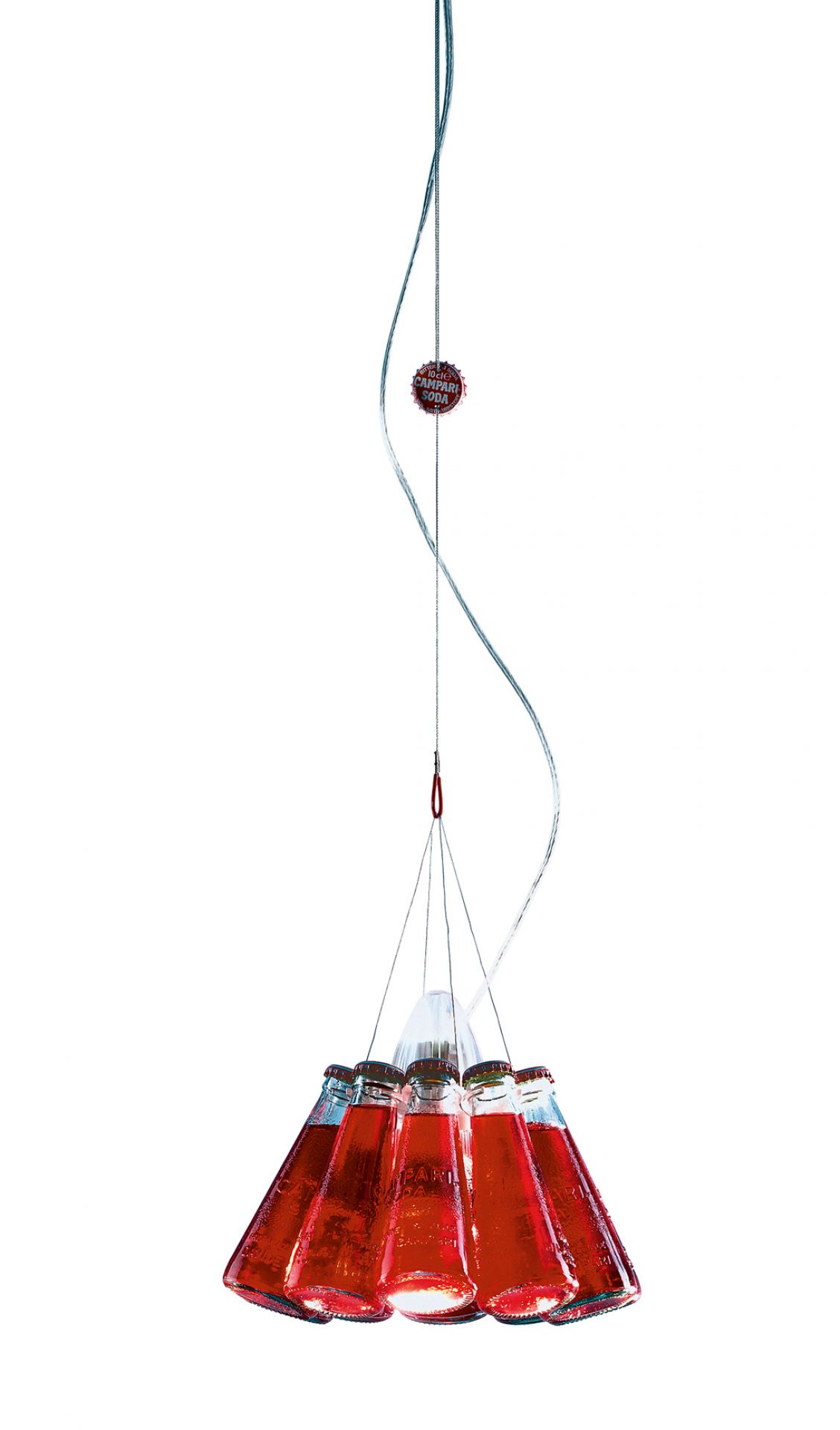 Zehn einzeln abnehmbare originale Campari-Soda-Flaschen bilden den Schirm der Leuchte. Das ist Wiederverwertung neu gedacht. Durch die Campari Kronkorken ist die Leuchte sogar höhenverstellbar.
