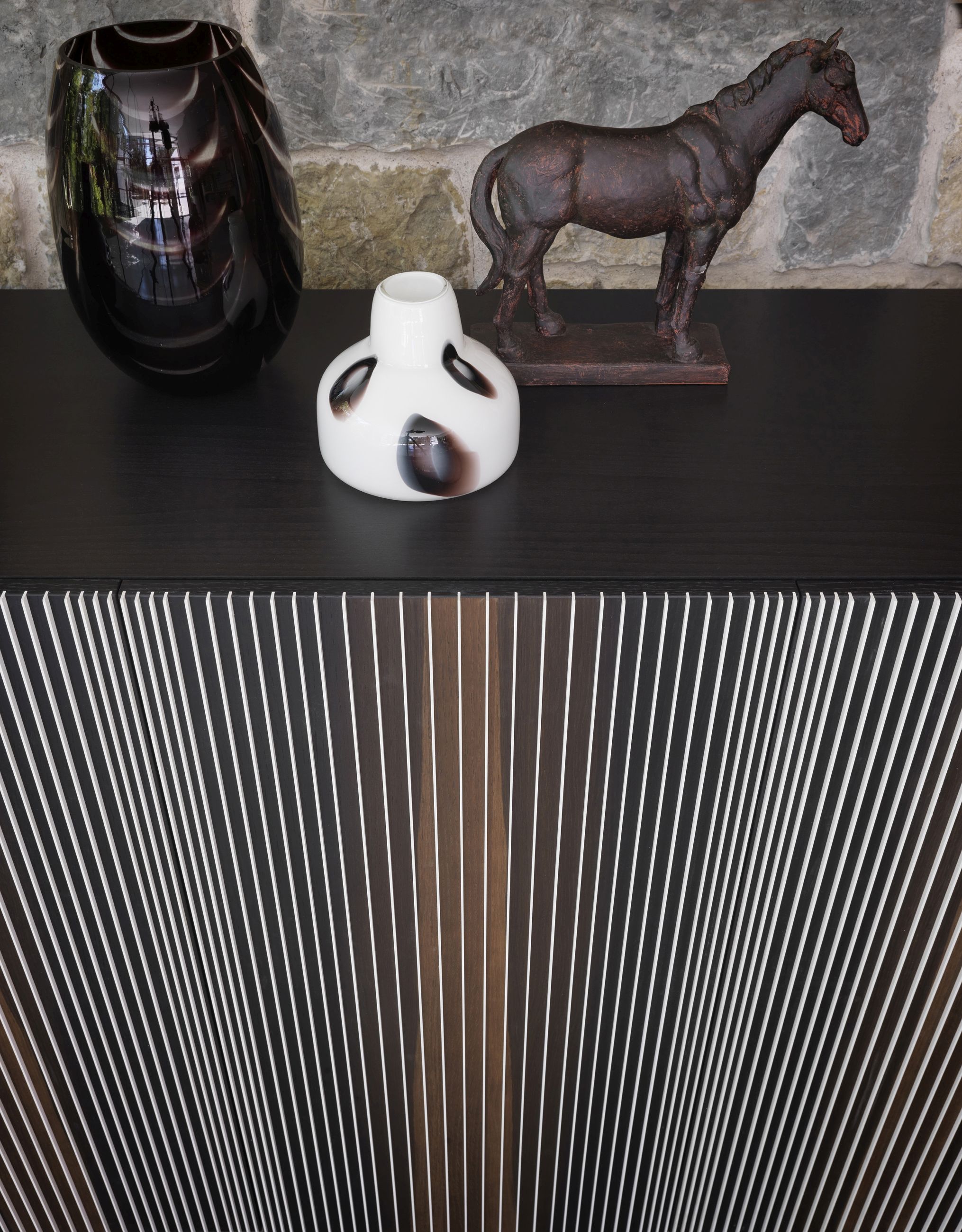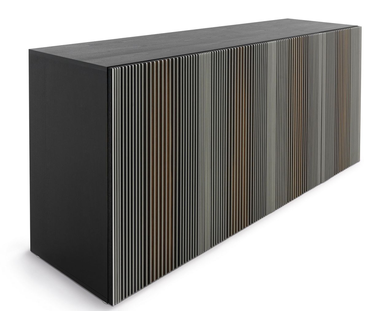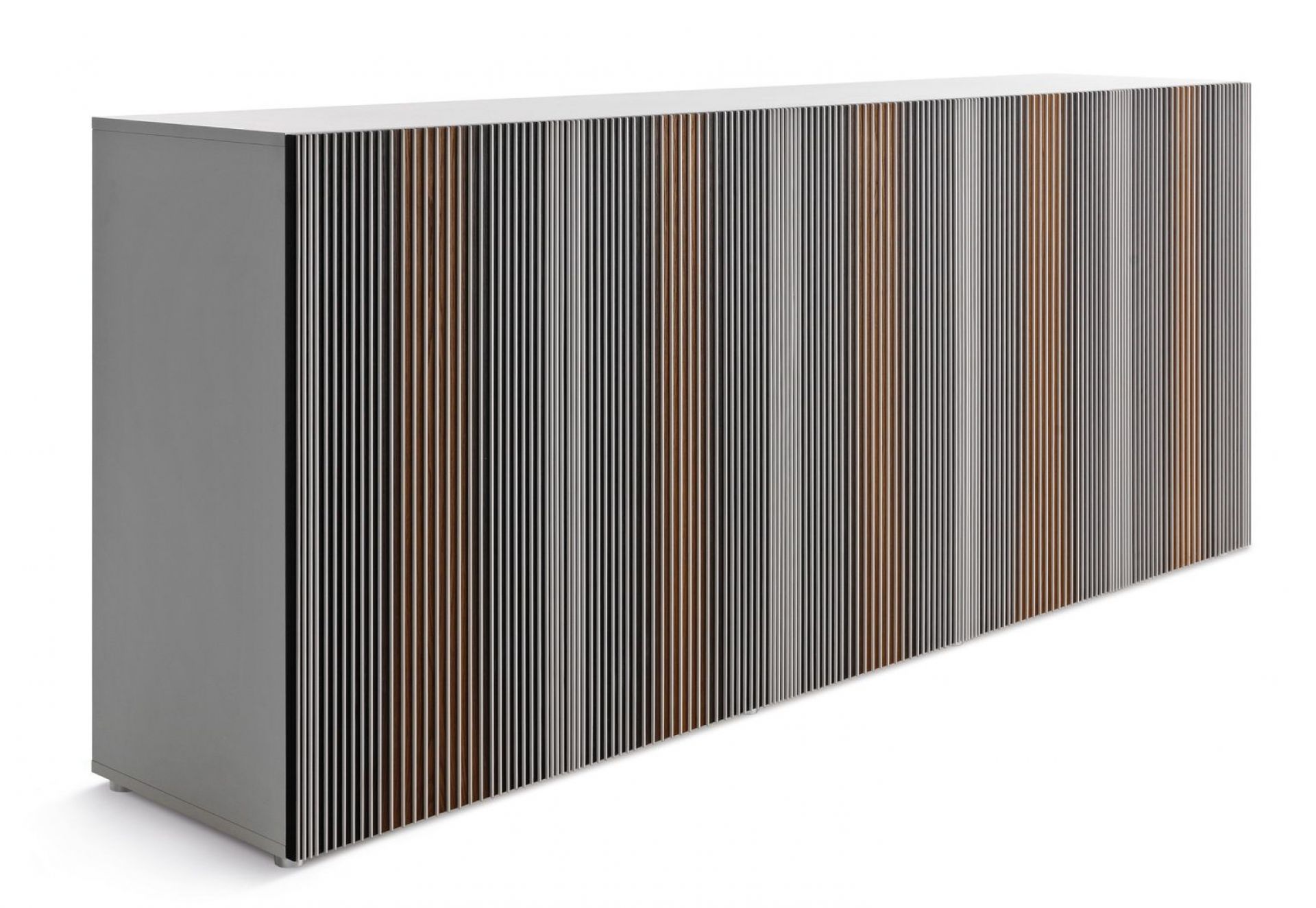 Entstanden ist eine ausgefallene Anrichte, die immer wieder aufs Neue fasziniert und sich neu erfahren lässt. Mittels eingesetzter Lamellen ändert sie je nach Blickwinkel ihre Farbe und wirkt wie ein Vorhang, der mit dem einfallenden Licht spielt. Damit wird das Möbel garantiert zum Eye-Catcher in Ihren Wohn- oder Büroräumen.