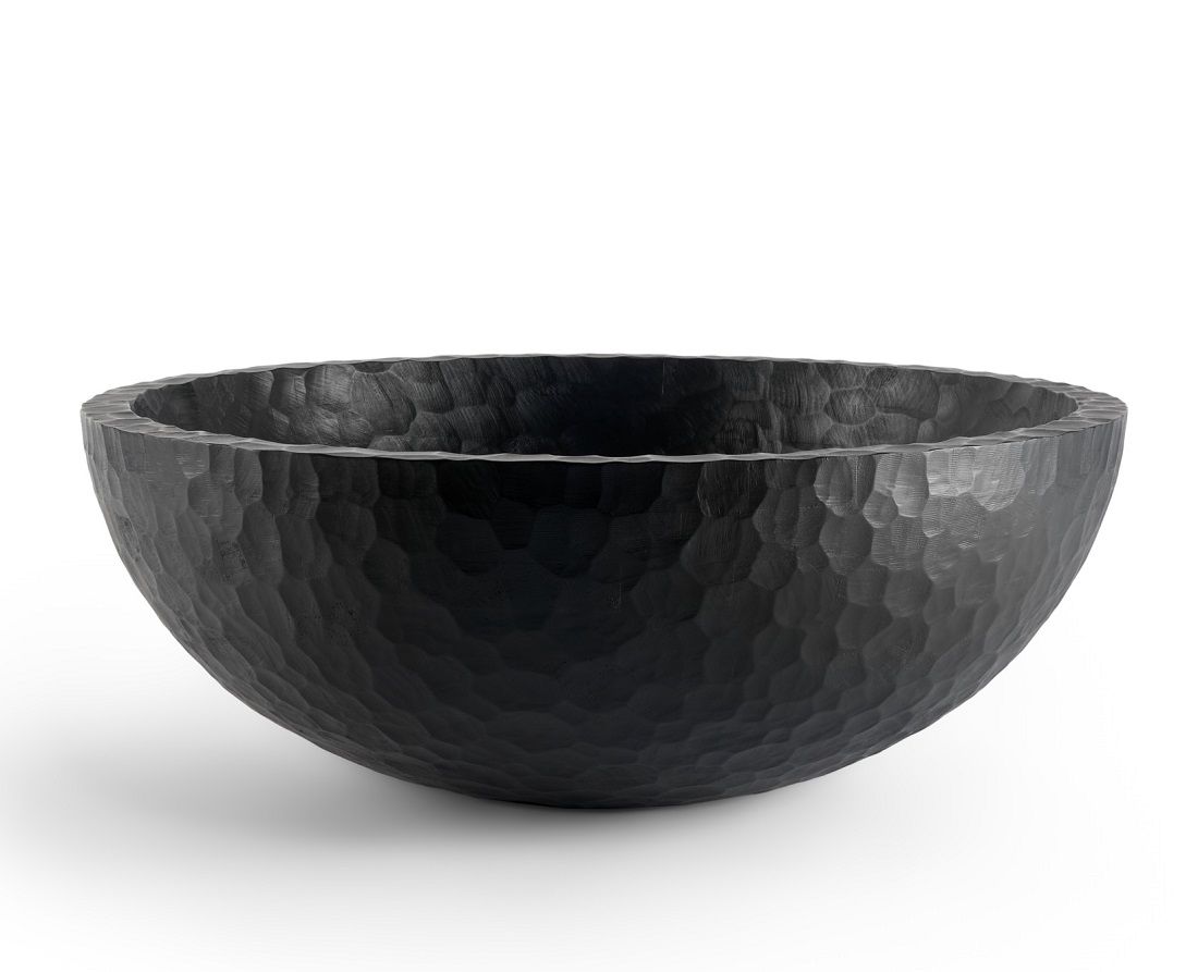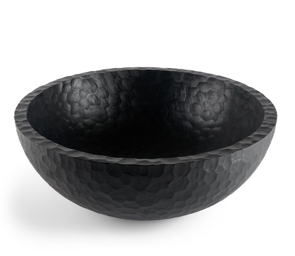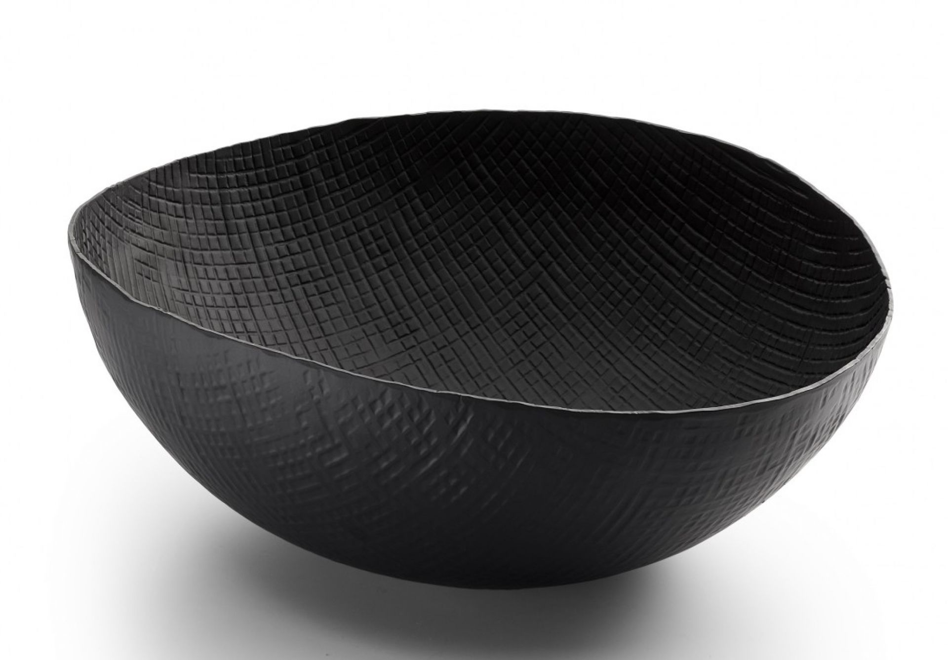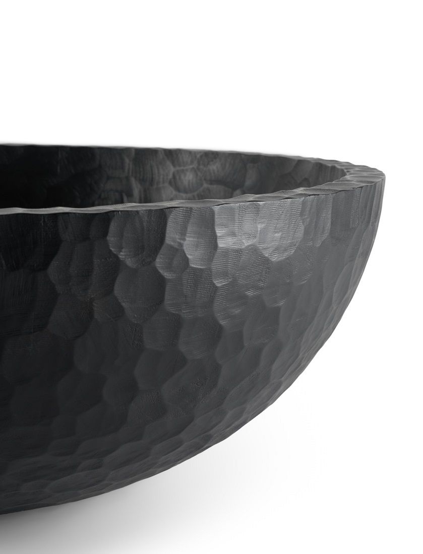 Jede Schale wird handgefertigt und ist ein absolutes Unikat. Sie besteht aus schwarz eingefärbtem Mahagoni Holz mit einer Lackierung auf Wasserbasis. Die Schale ist 65 cm breit und tief und 26 cm hoch. Sie wiegt 9,2 kg.