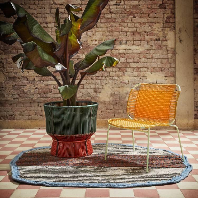 Die Webtechnik, die die kolumbianischen artesanos und artesanas bei der Herstellung der Cielo, Caribe und Cartaganes-Möbelstücke anwenden, heißt "momposino". Diese Methode ist besonders in der Region Santa Marta an der Karibikküste beliebt. Die farbigen Schnüre bestehen aus recyceltem PVC und werden von Hand um einen Rahmen aus feuerverzinktem Stahl geflochten, wodurch verschiedene Muster entstehen.