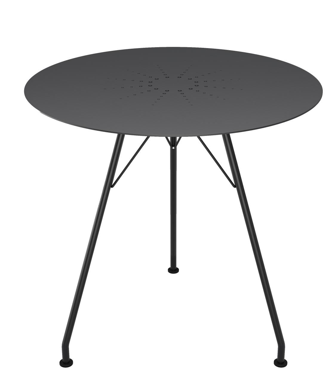 Bei Circum betragen Höhe und Durchmesser jeweils 74 cm. Der Tisch besteht aus schwarz pulverbeschichtetem Metall.