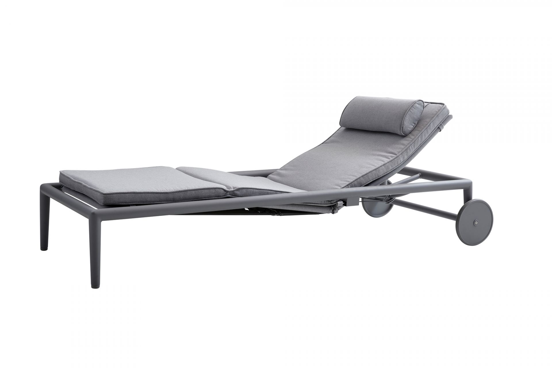 Die Conic-Sonnenliege ist aus leichtem Aluminium, Cane-line AirTouch-Stoff und QuickDryFoam hergestellt. Sie ist 220 cm breit, 78 cm tief und 40 cm hoch.