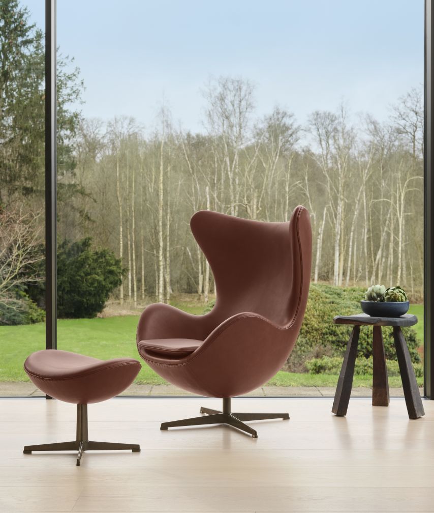 Der neigbare Egg ist 86 cm breit, 79 - 95 cm tief und 104 cm hoch. Die Sitzhöhe beträgt 37 cm, die Armlehnen liegen bei einer Höhe von 58 cm. Der Sessel besteht aus einer Kunststoffschale mit Kaltschaumschicht sowie einem drehbaren Fuß aus schwarz PVD-beschichtetem Aluminium und Stahl. Für den Bezug können Sie aus den folgenden beiden Jubiläumsvarianten wählen: