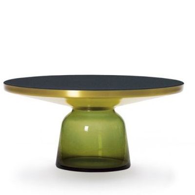 Bell Coffee Table Couchtisch von ClassiCon: Olivgrüner Glasfuß, Messingring und dunkle Tischplatte.