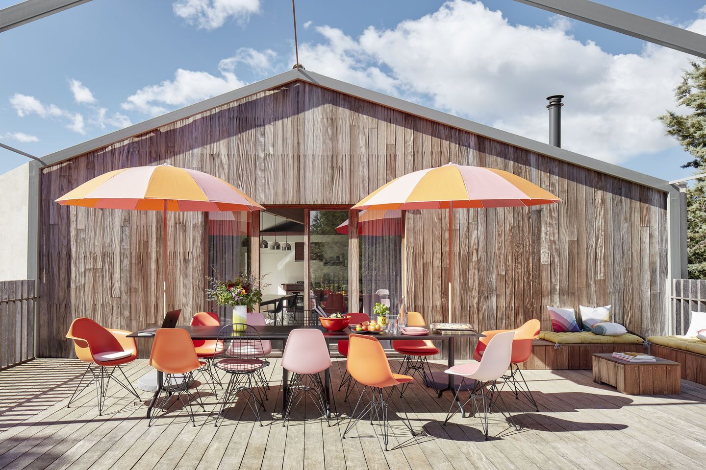 DAR steht als Abkürzung für "Dining Armchair rod base". Die filigrane Konstruktion aus Stahldraht wird auch Eiffelturm-Untergestell genannt und verbindet eine konstruktive Stabilität mit einer formalen Leichtigkeit. Die verschiedenfarbigen, organischen Sitzschalen ermöglichen es den beliebten Klassiker DAR nach den eigenen Vorlieben anzupassen.