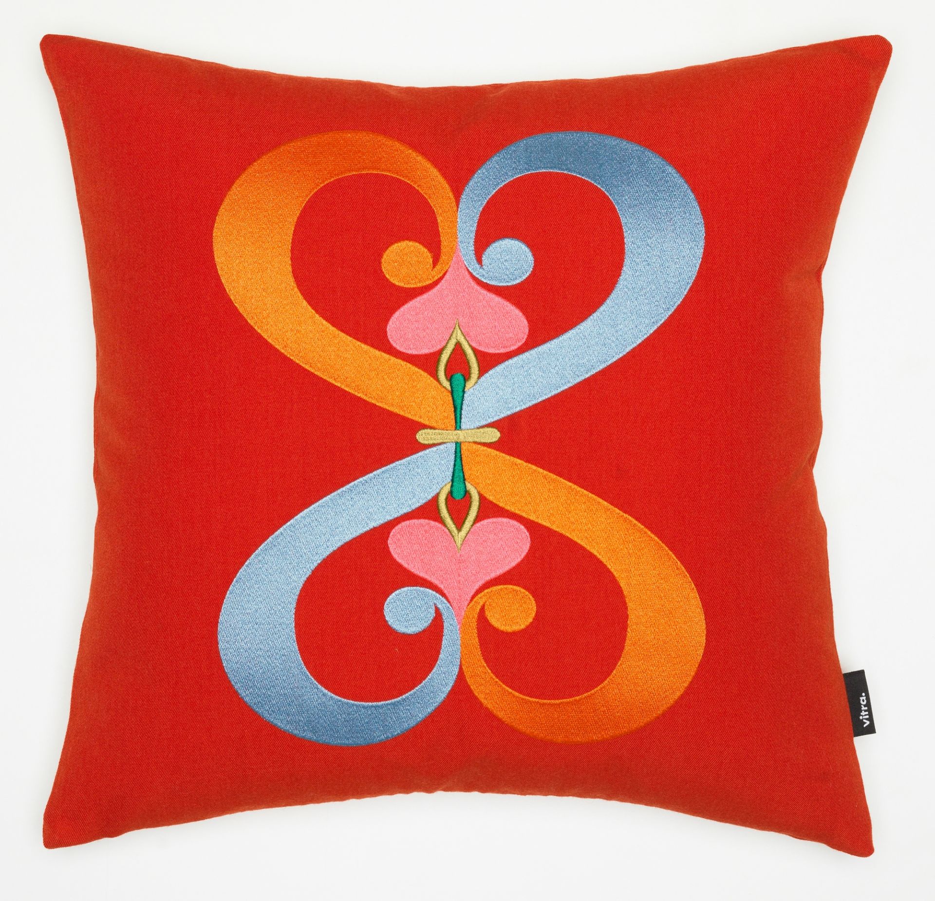 Ein neuer Schatz aus dem reichhaltigen Designfundus von Alexander Girard: Zum Home Sweet Home Embroidered Pillow gesellt sich nun ein neues, vor Energie nur so strotzendes Kissen: das orangerote Vitra Double Heart.