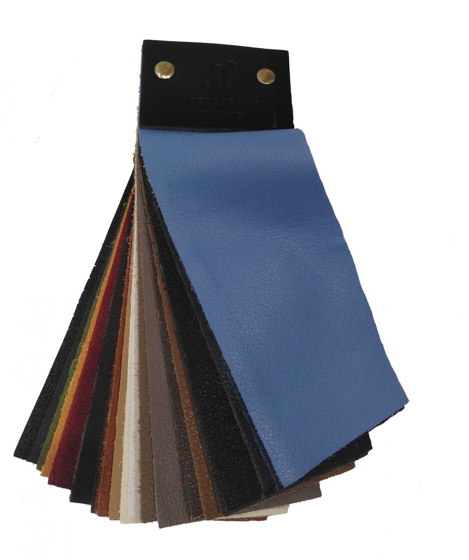 Ledermusterkarte von Freifrau mit verschiedenen Farbtönen und Texturen für Möbel und Innenausstattung.