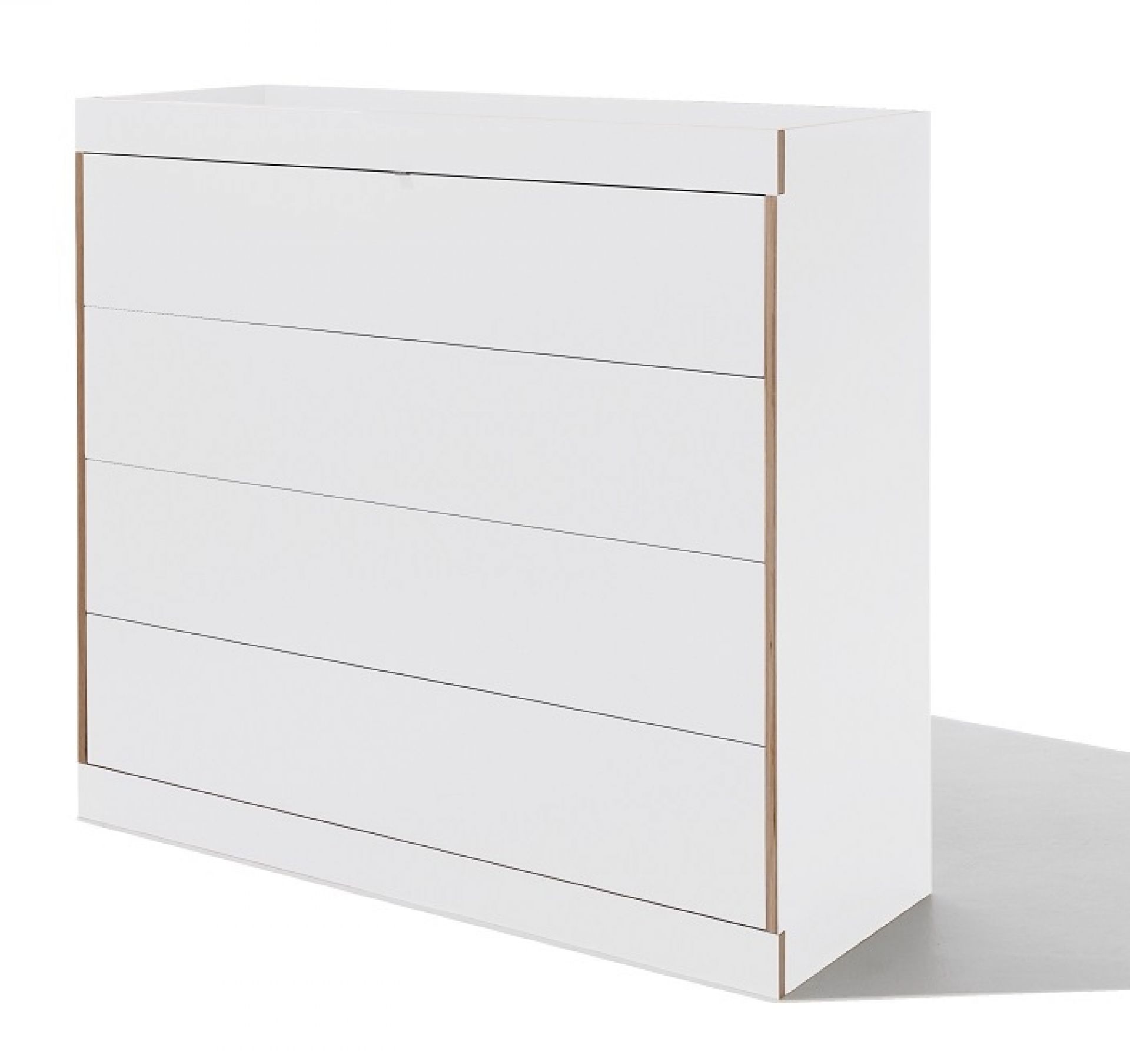 Weiße Flai Kommode von Müller Möbelwerkstätten mit vier Schubladen, modernes Schlafzimmermöbel.