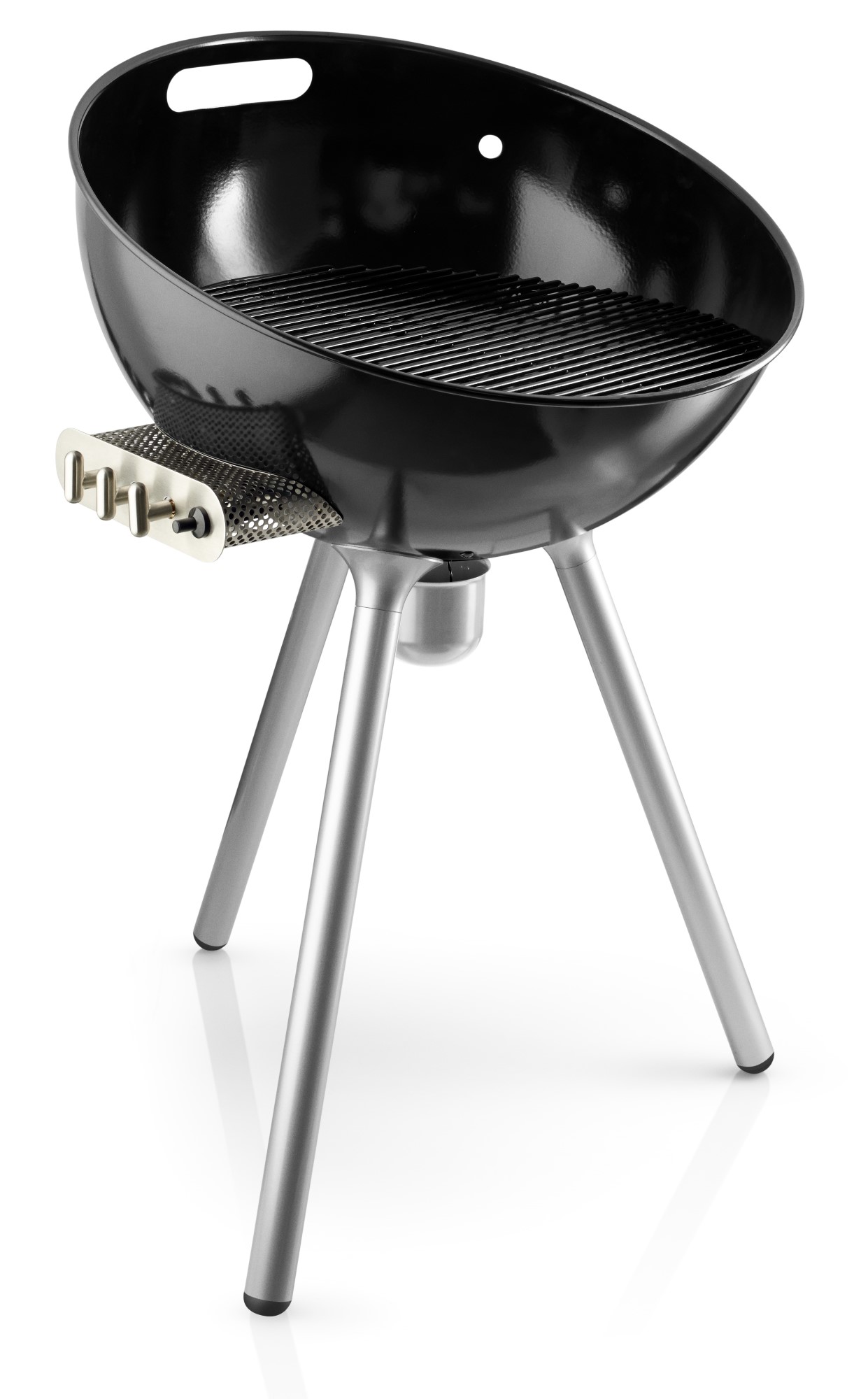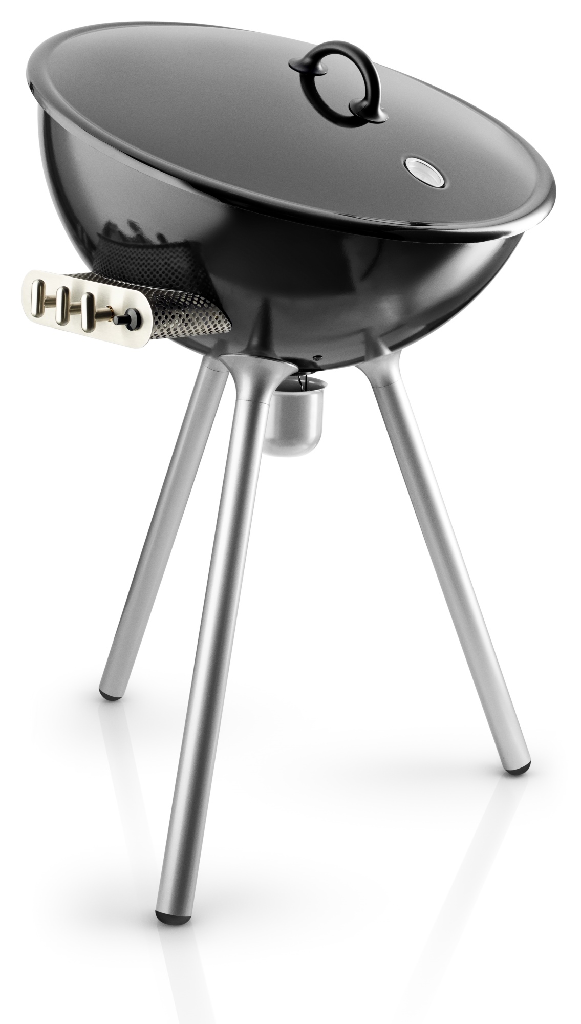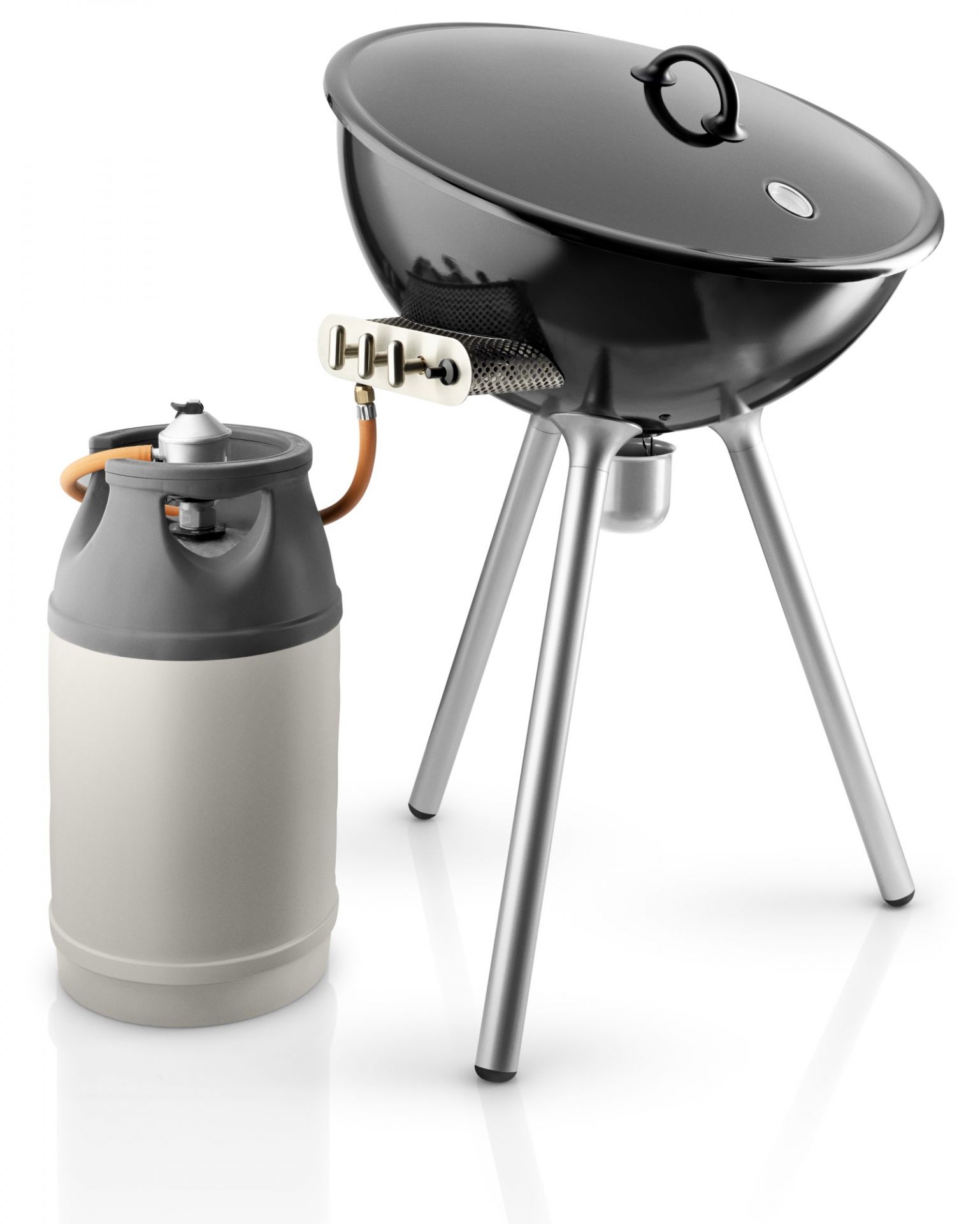 Der FireGlobe Gasgrill von Eva Solo besteht aus mattschwarzem, emailliertem Stahl. Die abnehmbaren Beine sind aus Aluminium gefertigt, der Griff aus Bakelit. Der Durchmesser beträgt 58 cm. Der Design Grill verfügt über drei einzeln regulierbare Brenner. Der Schmordeckel ist mit einem Thermometer ausgestattet.