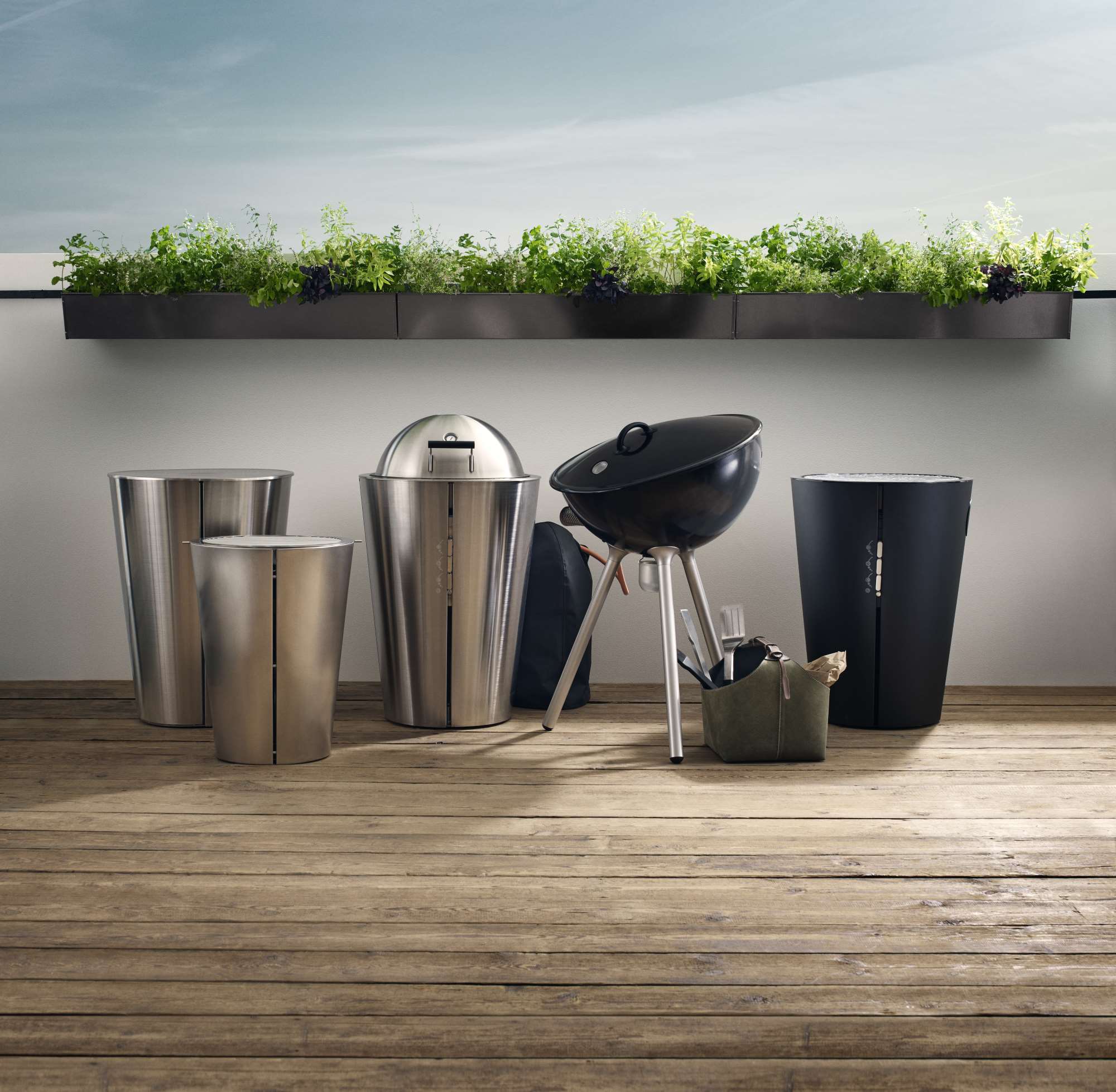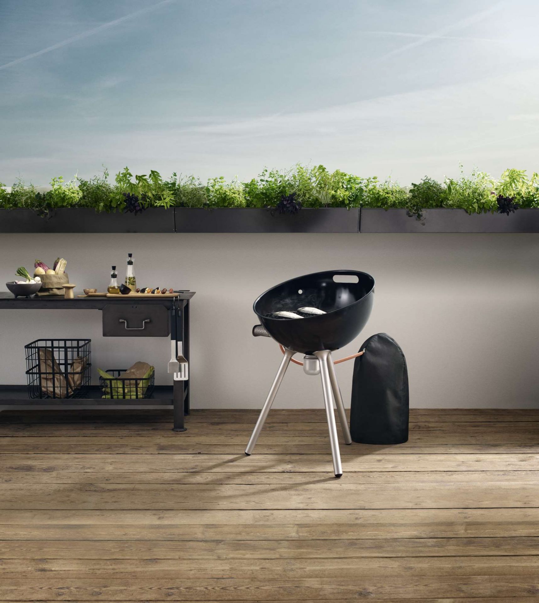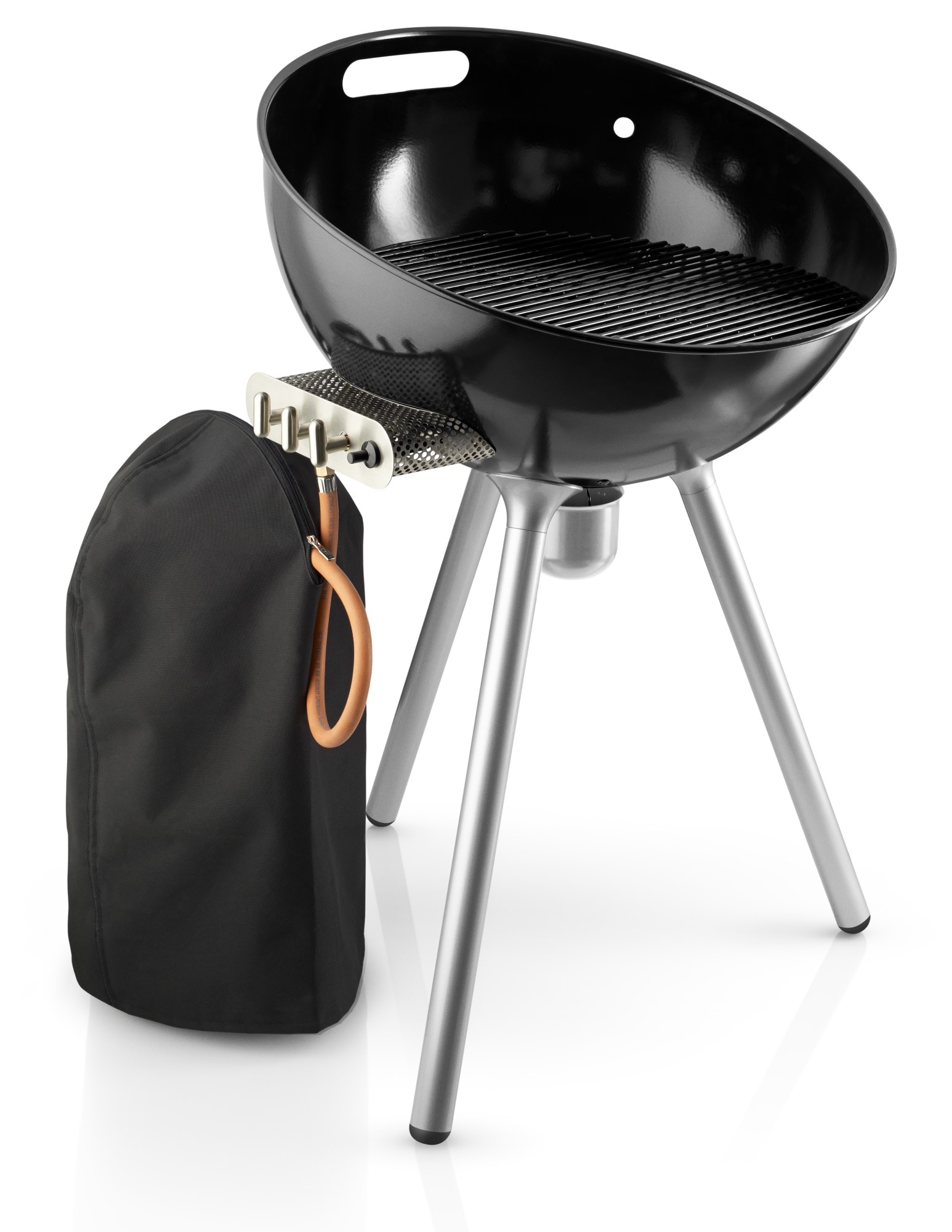 Der FireGlobe Gasgrill von Eva Solo besteht aus mattschwarzem, emailliertem Stahl. Die abnehmbaren Beine sind aus Aluminium gefertigt, der Griff aus Bakelit. Der Durchmesser beträgt 58 cm. Der Design Grill verfügt über drei einzeln regulierbare Brenner. Der Schmordeckel ist mit einem Thermometer ausgestattet.