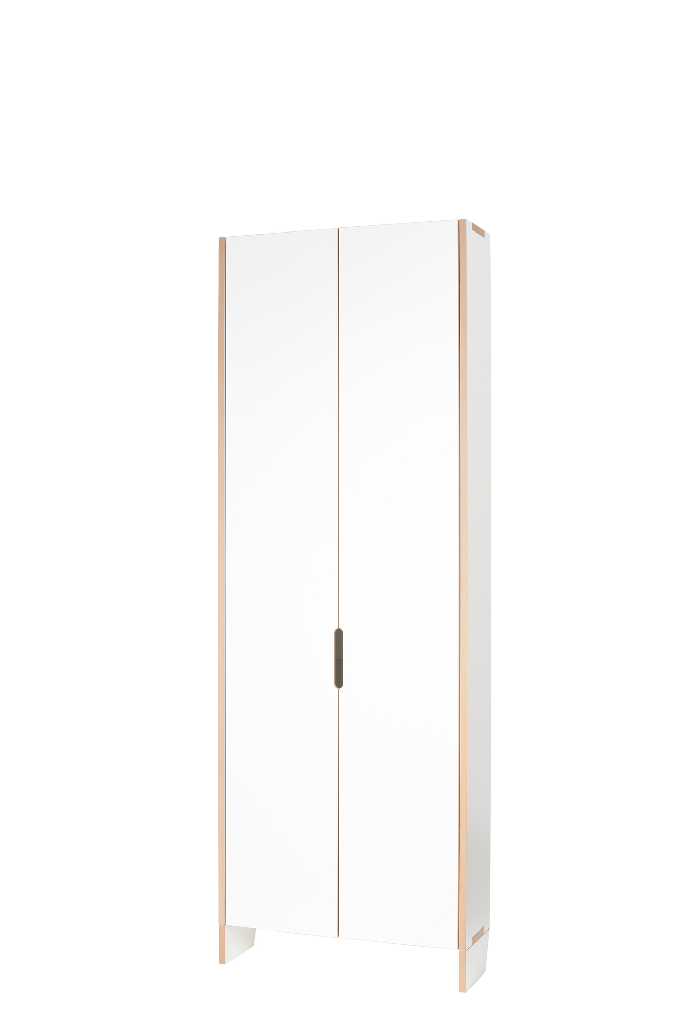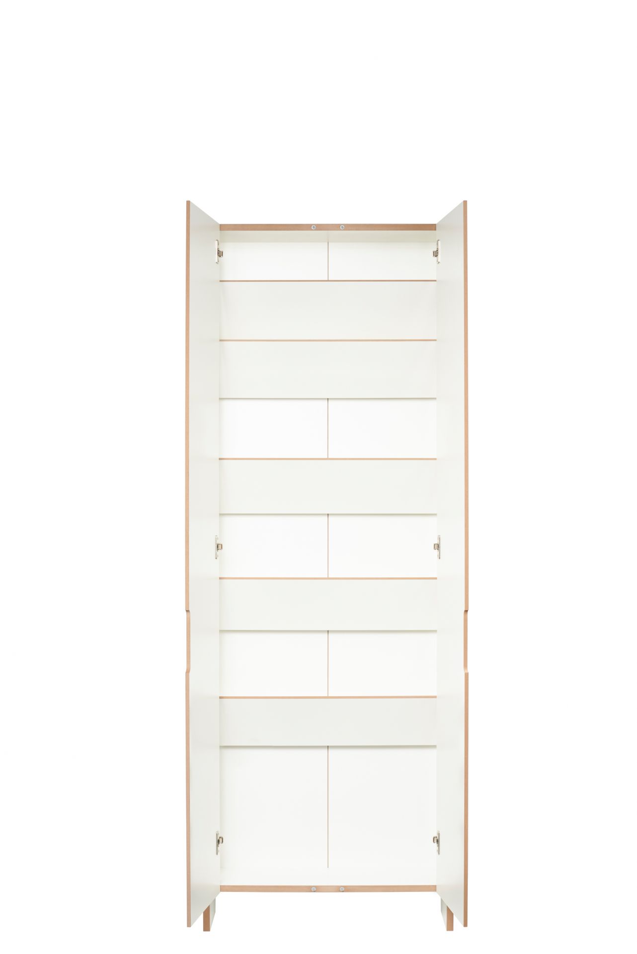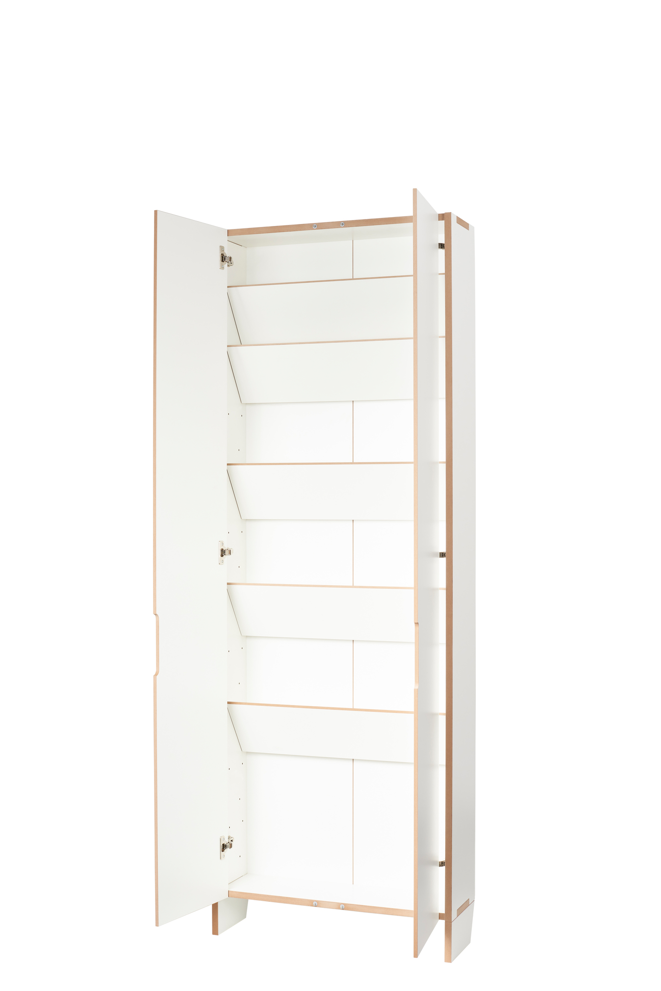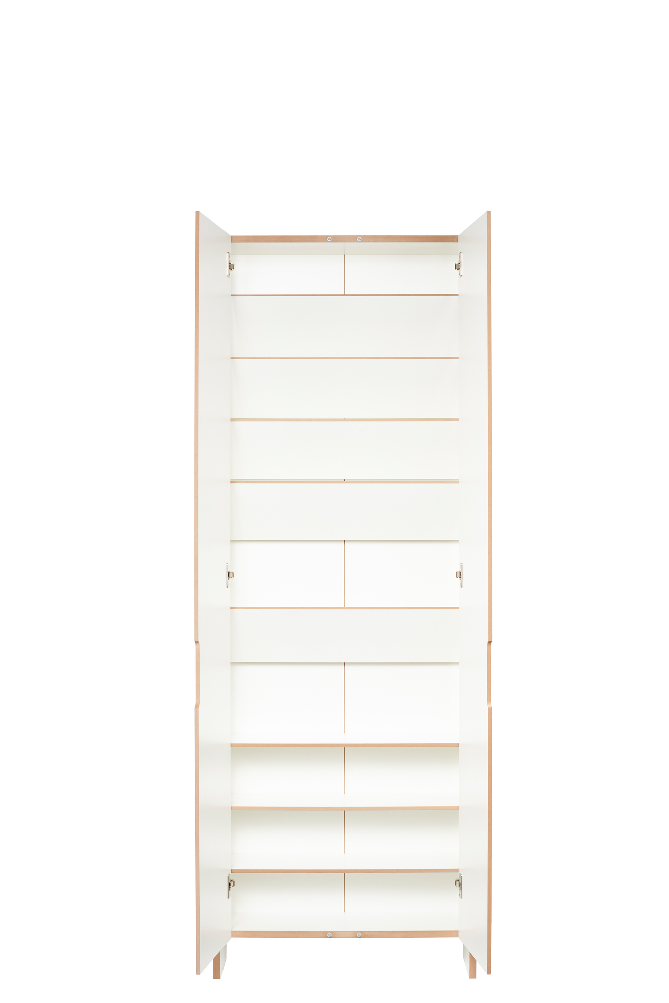 Der Tojo Flachmann besteht aus weiß beschichtetem MDF. Er ist 70 cm breit, 23 cm tief und 198 cm hoch.