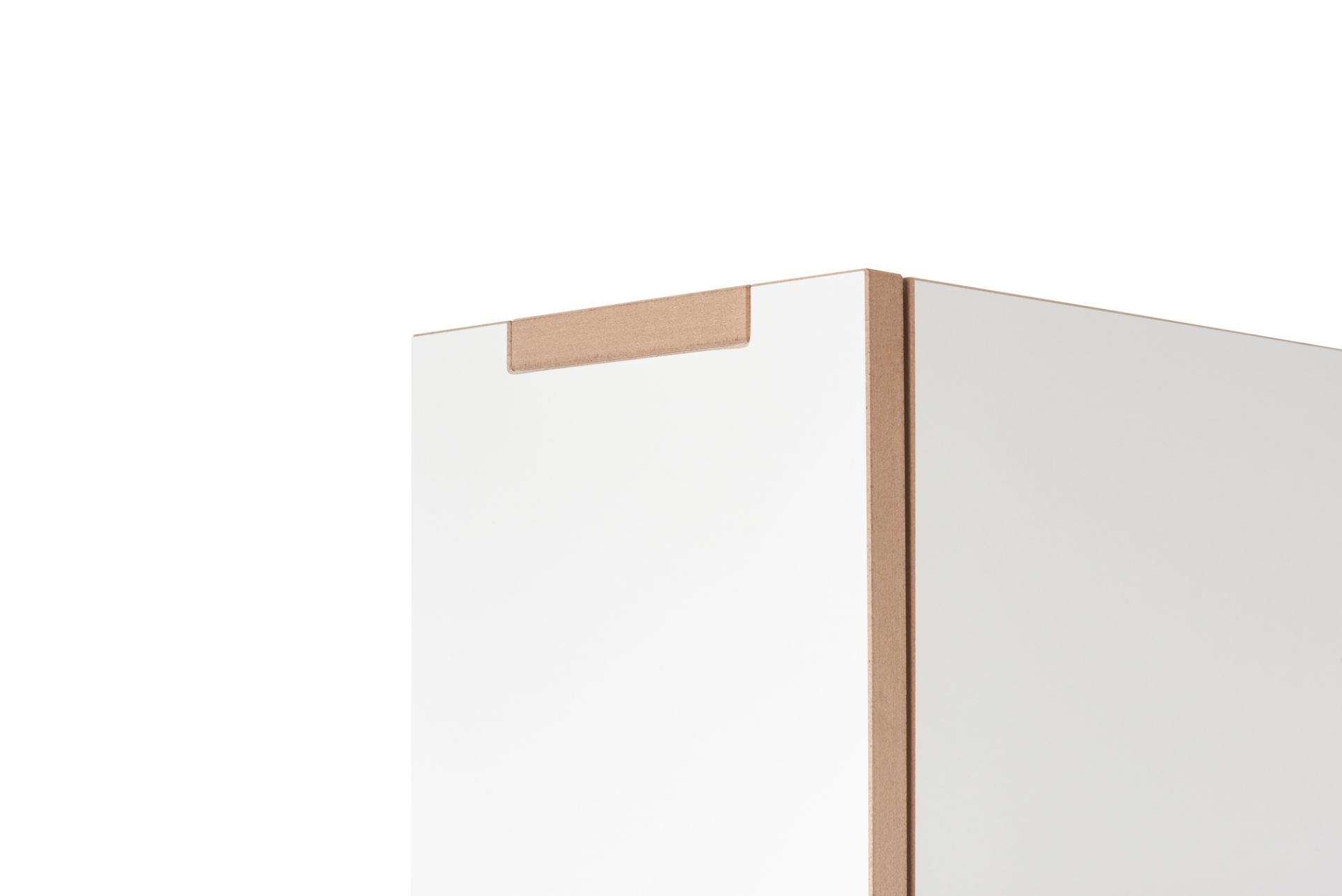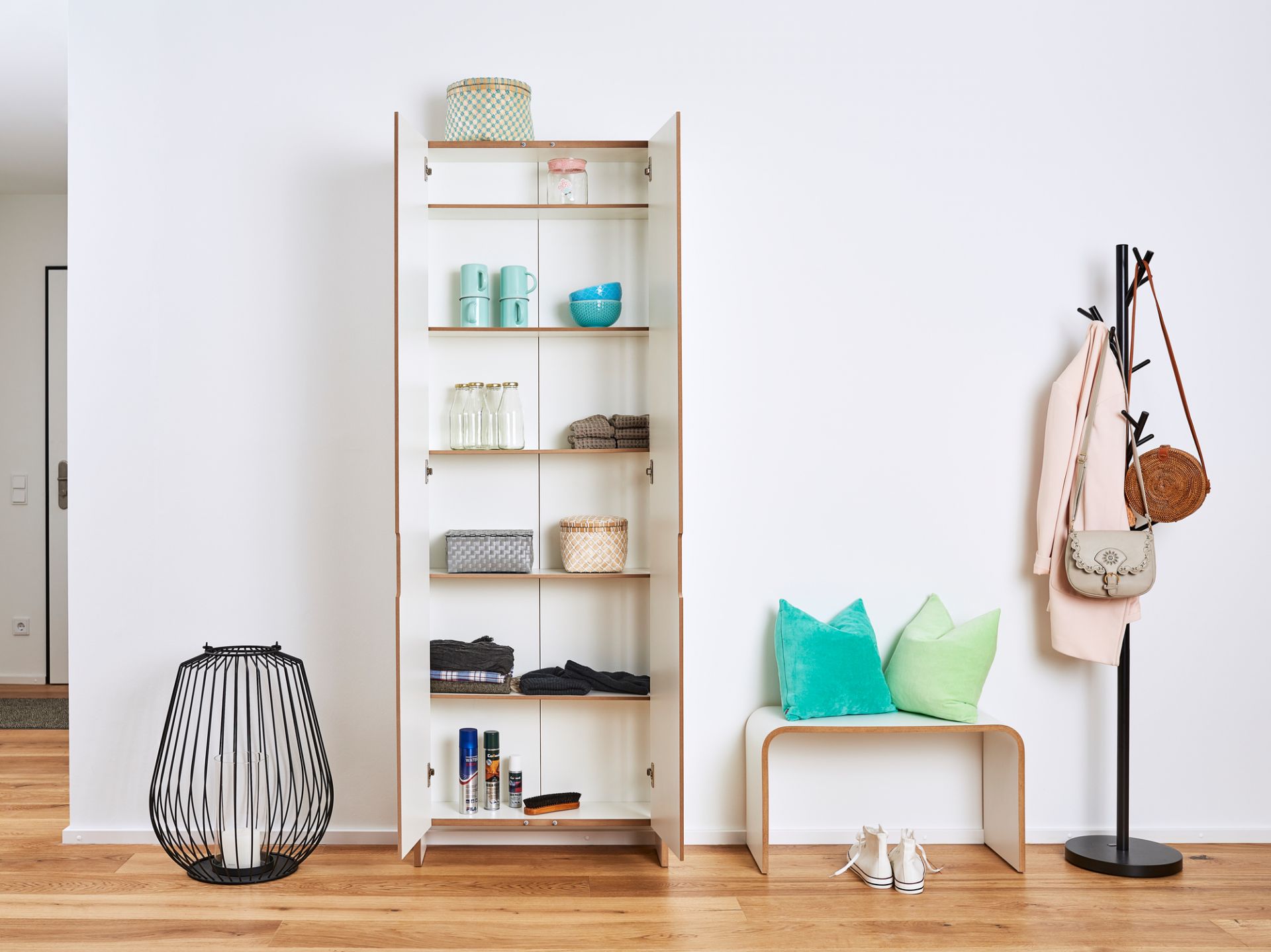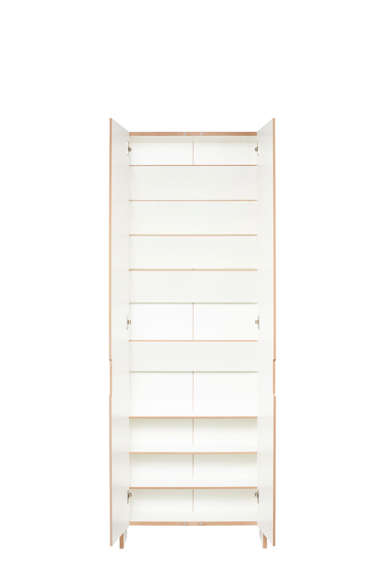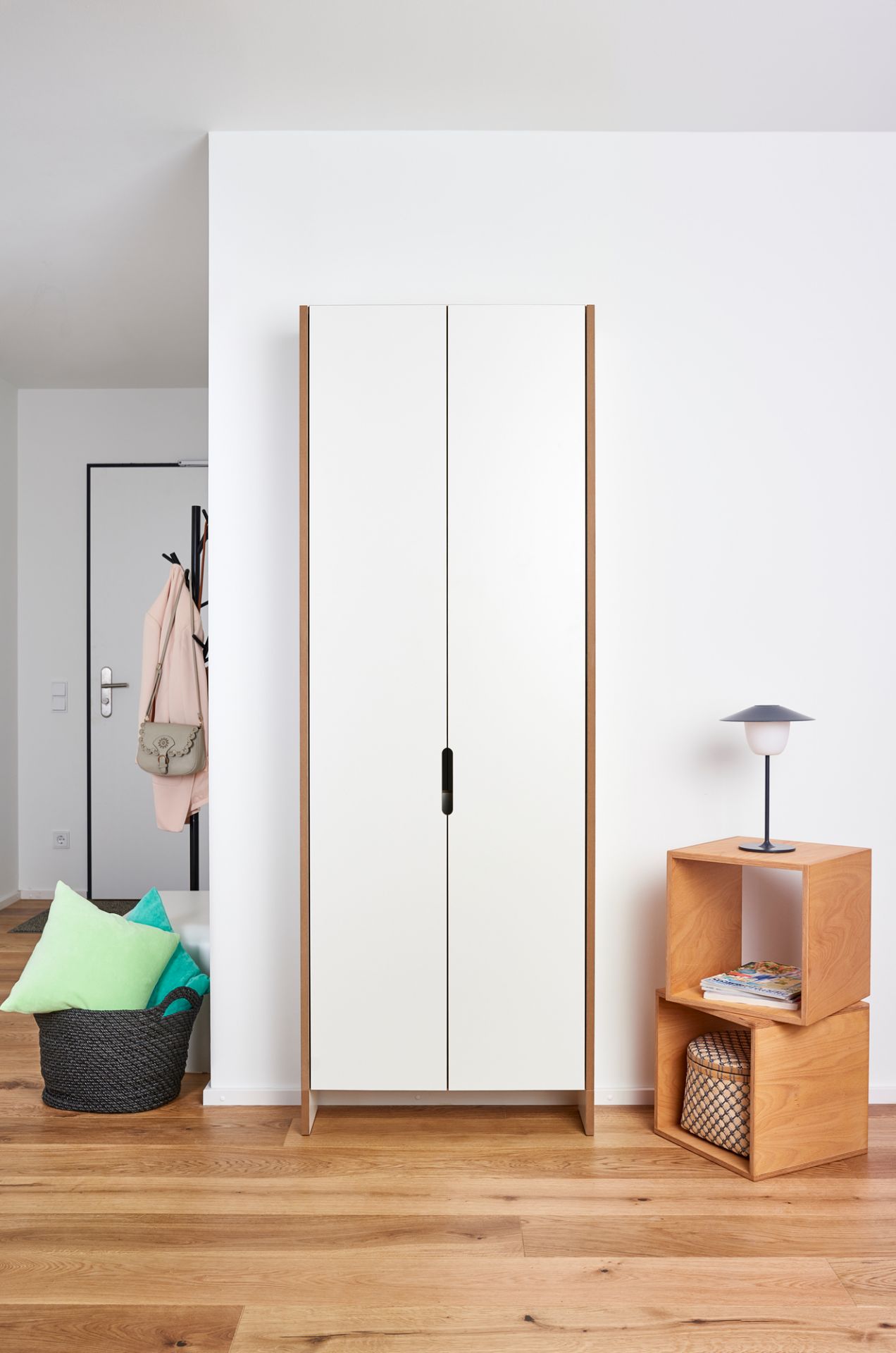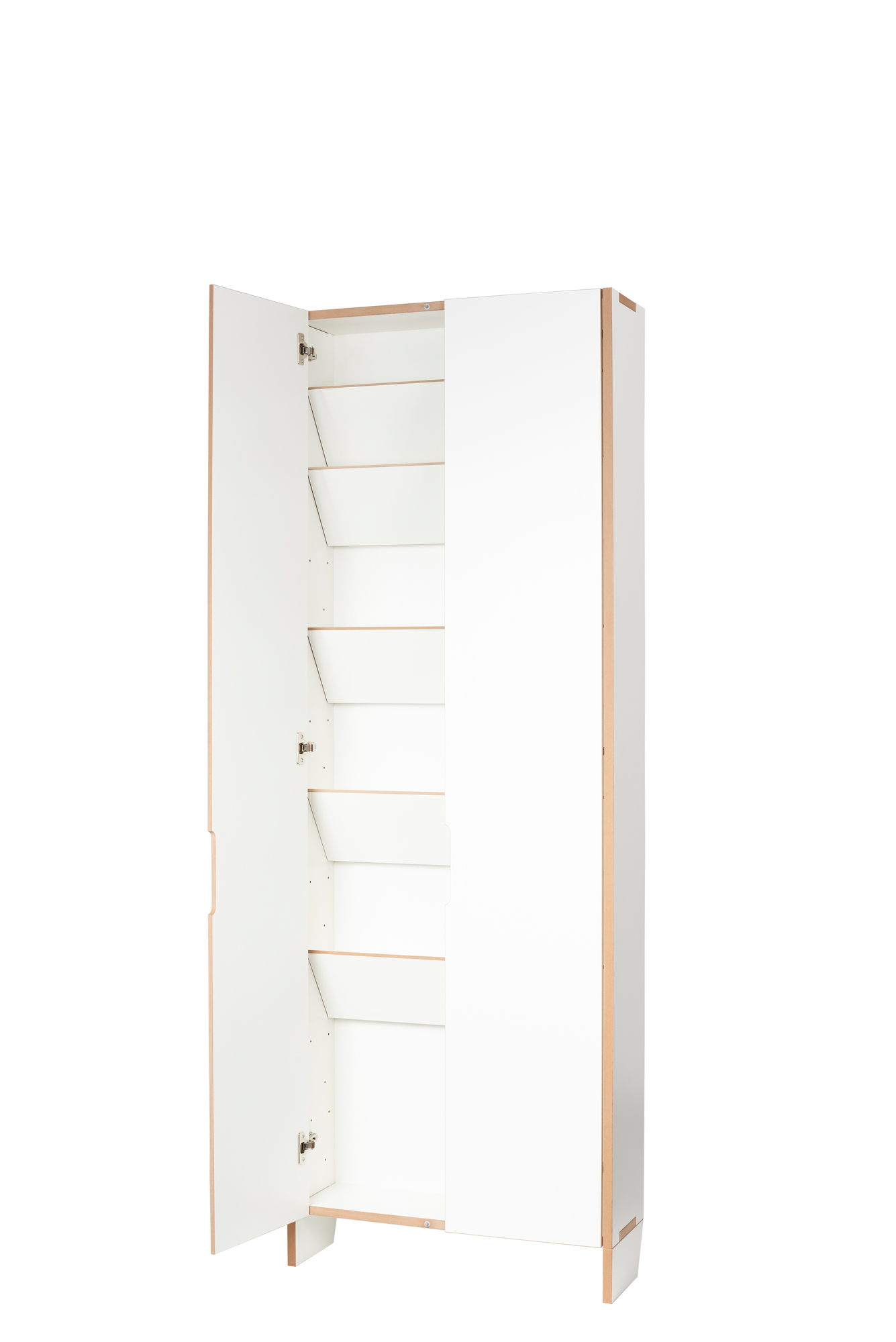Der Tojo Flachmann besteht aus weiß beschichtetem MDF. Er ist 70 cm breit, 23 cm tief und 198 cm hoch.