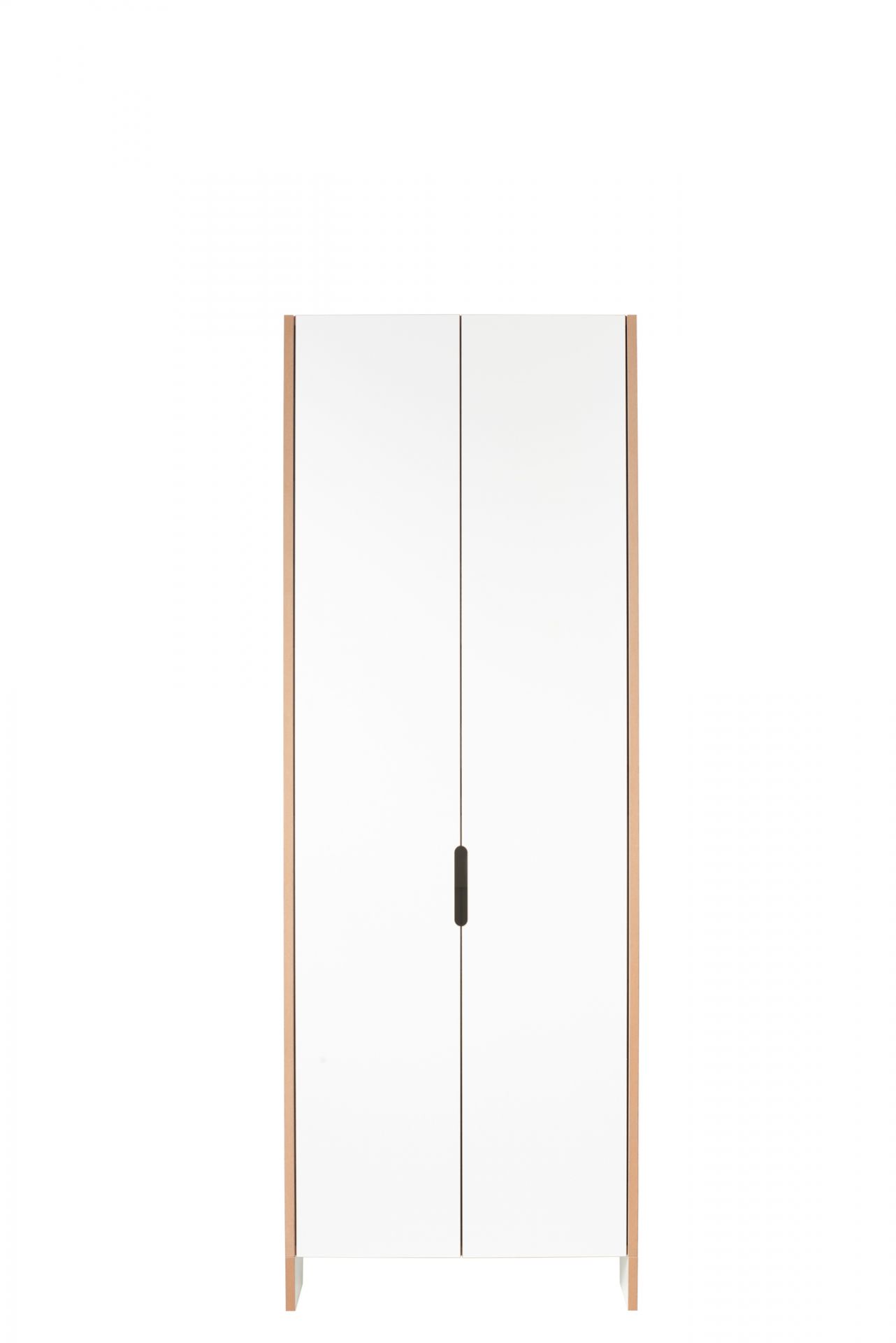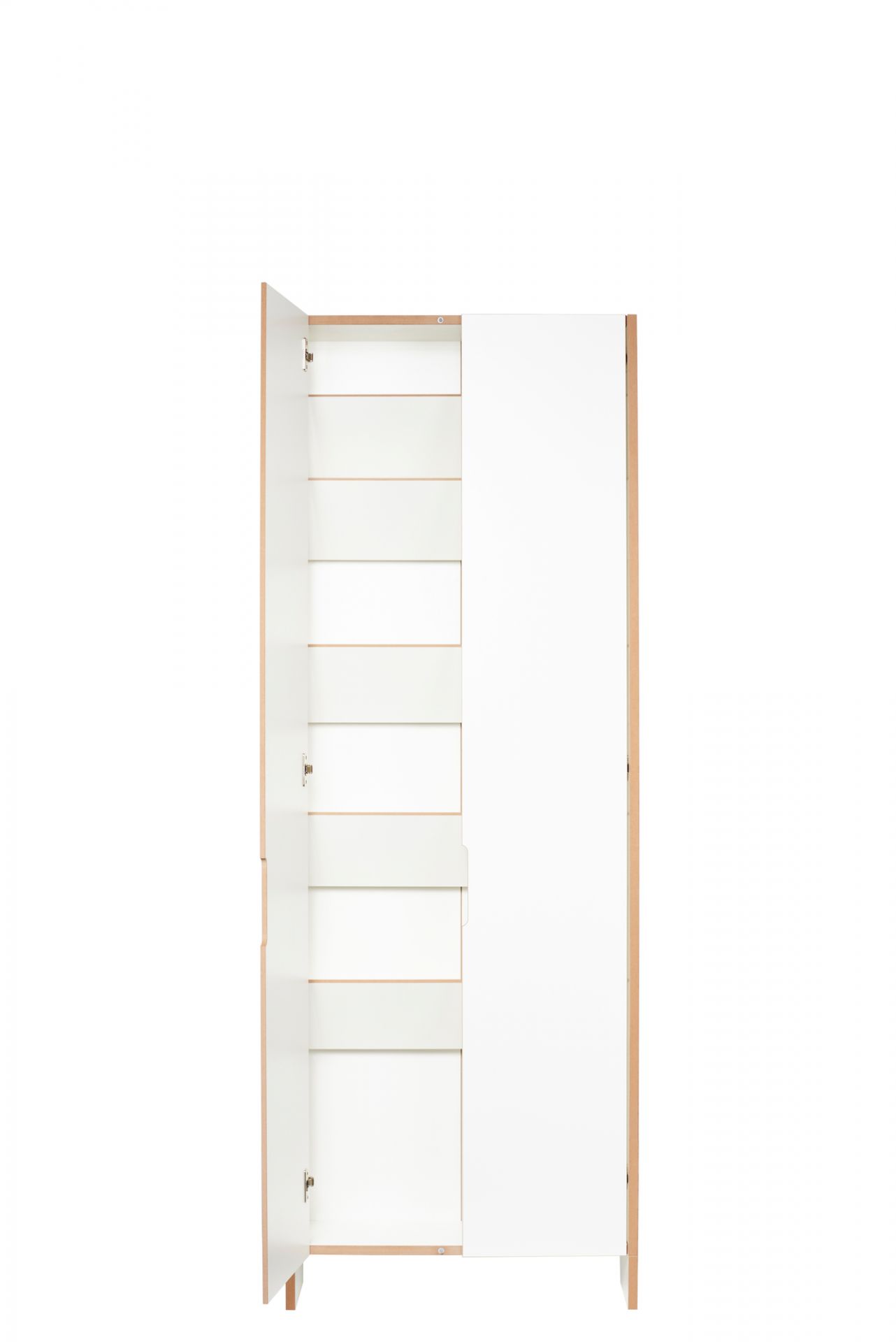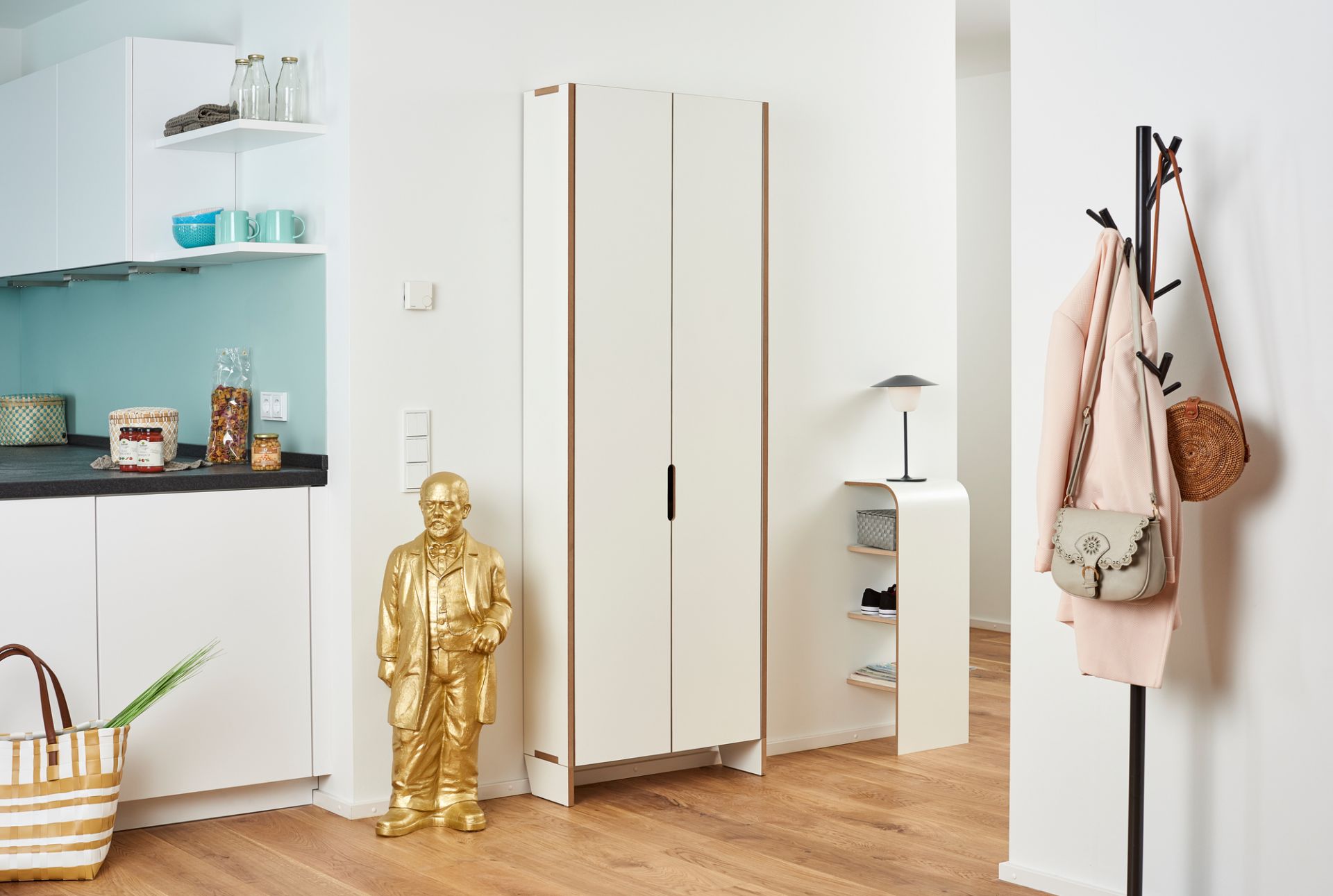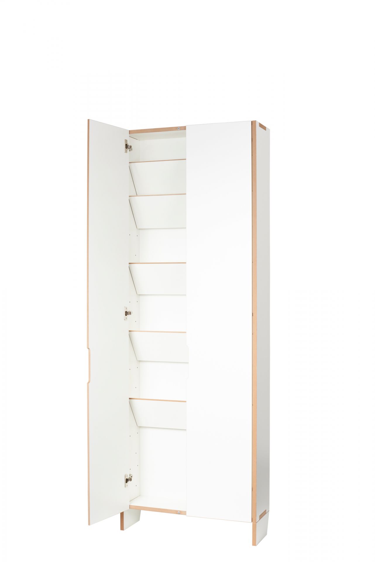 Der Tojo Flachmann besteht aus weiß beschichtetem MDF. Er ist 70 cm breit, 23 cm tief und 198 cm hoch.