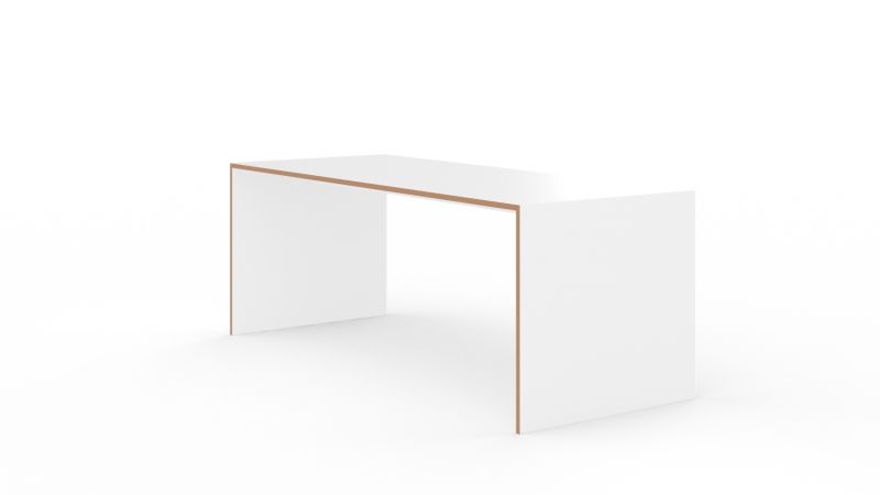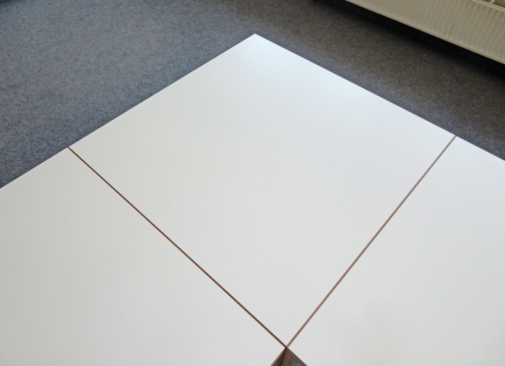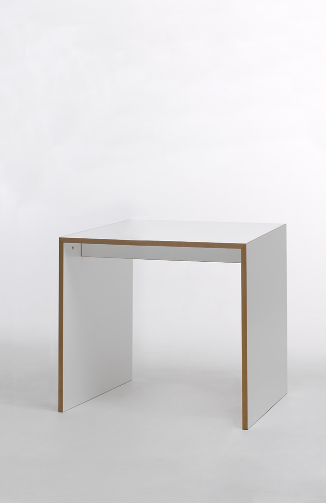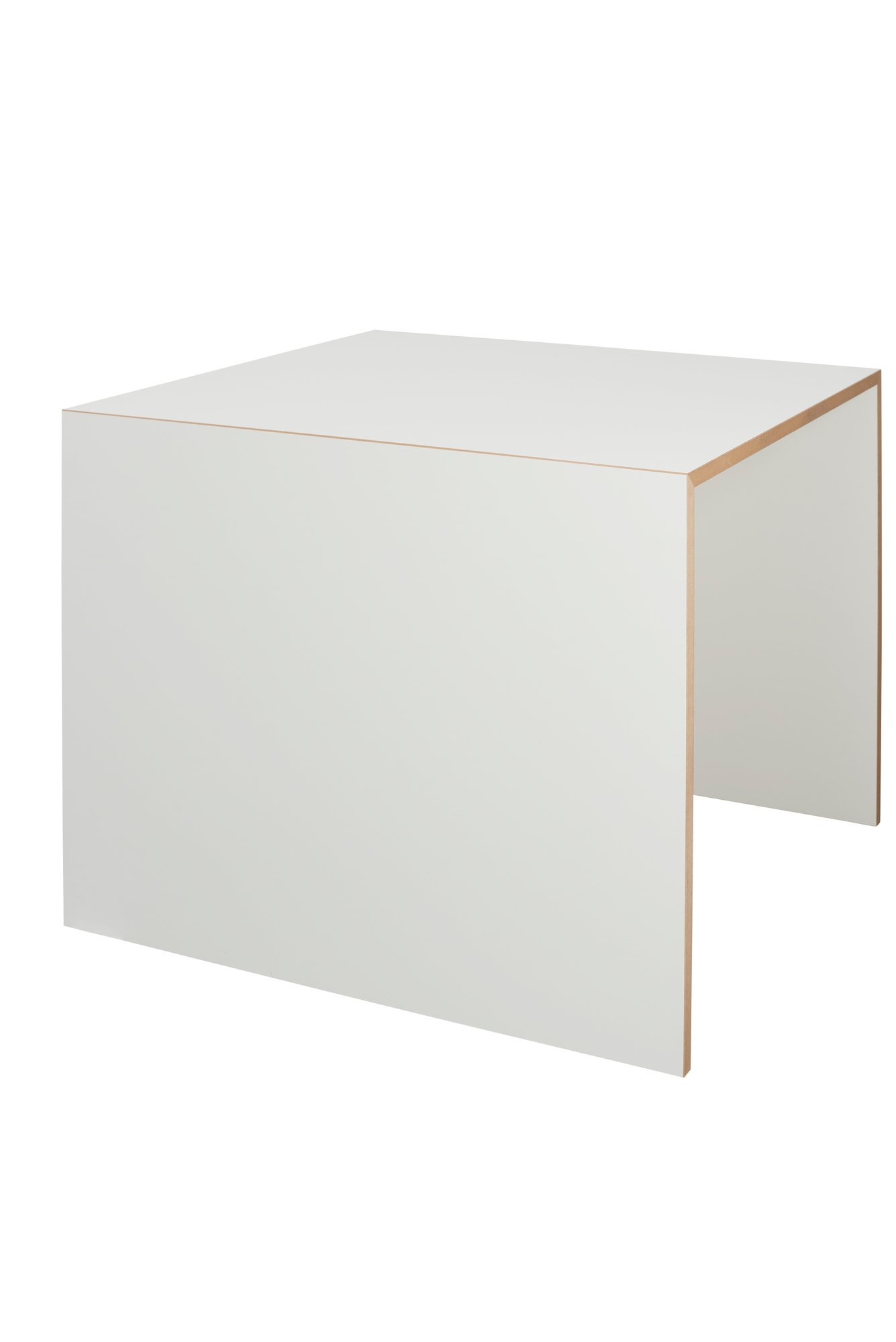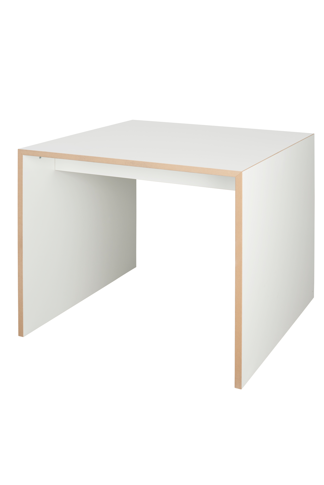 Der Tisch besteht aus weiß beschichtetem MDF. Er ist 80 cm breit und tief und 74 cm hoch.