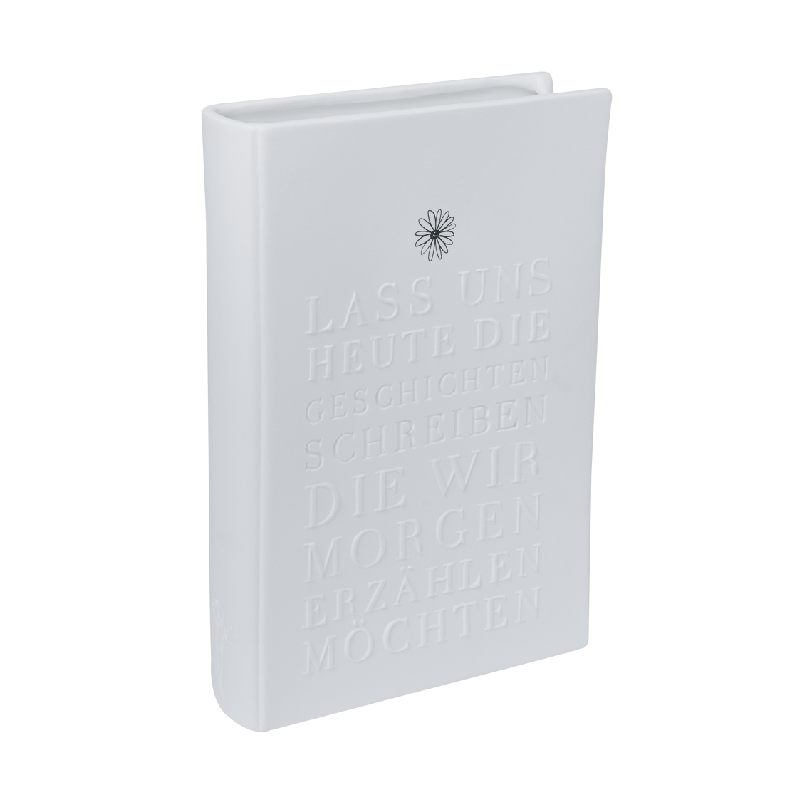 Mit der Vase "Blütezei"Geschichte schreiben" holen Sie sich ein echtes Highlight in Ihr Zuhause. Egal, ob Sie sie mit frischen Blumen oder Trockensträußen befüllen, oder ob Sie sie ohne Befüllung als Dekorationsgegenstand zur Geltung bringen, die außergewöhnlich gestaltete Vase wirkt als schöner Blickfang, besonders für Bücherliebhaber!