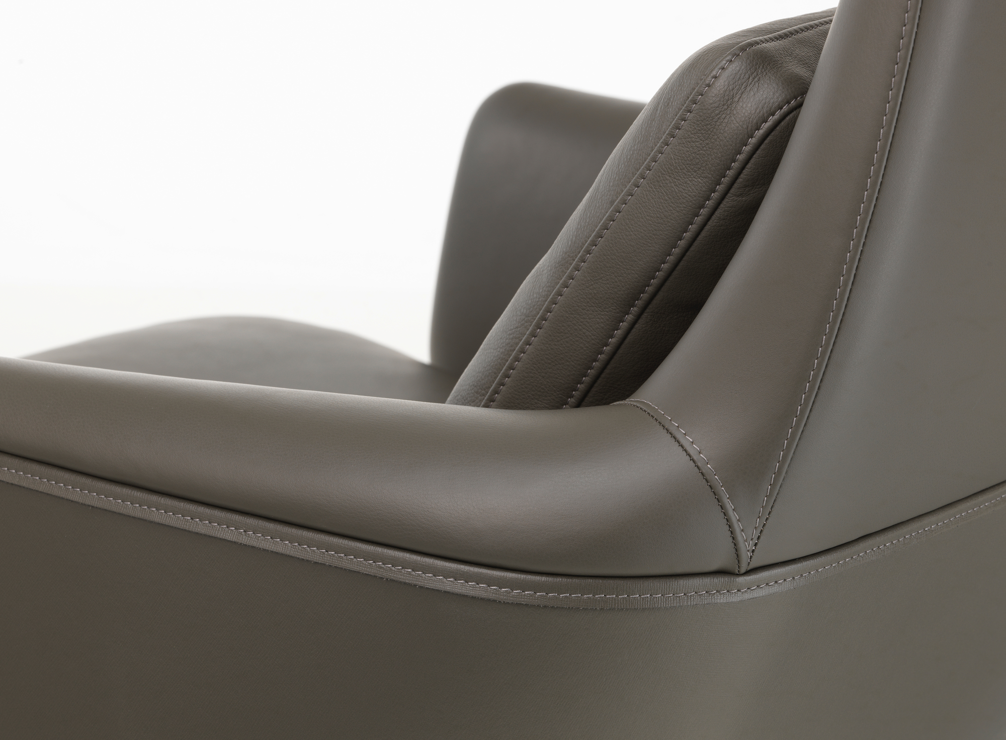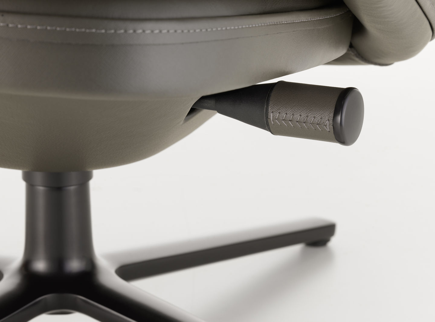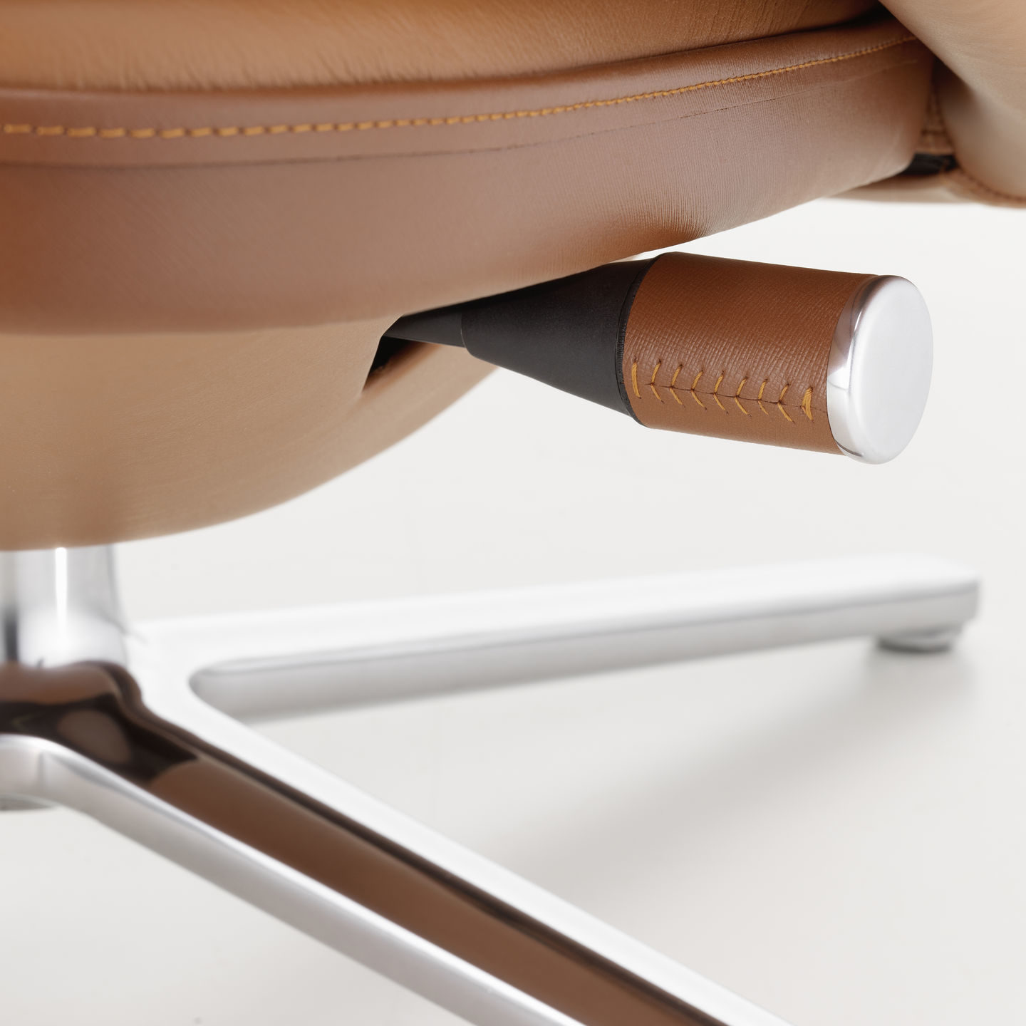 Dieser ergibt sich aus dem perfekten Zusammenspiel verschiedener Elemente: hochwertiges Leder umgibt weich gefüllte Sitz- und Rückenkissen, die so flexibel gestaltet sind, dass sie nach dem Aufstehen in ihre ursprüngliche Form zurückkehren. Eine integrierte und im Sessel verborgene Mechanik sorgt dafür, dass der Benutzer beim Hinsetzen langsam einsinkt und in eine angenehme Ruheposition geführt wird. Ein Drehknopf bietet die Möglichkeit den Ablauf der Mechanik einzustellen und verschiedene Positionen zu arretieren. Der elegante Viersternfuß lässt den Sessel um 360 Grad drehbar werden.