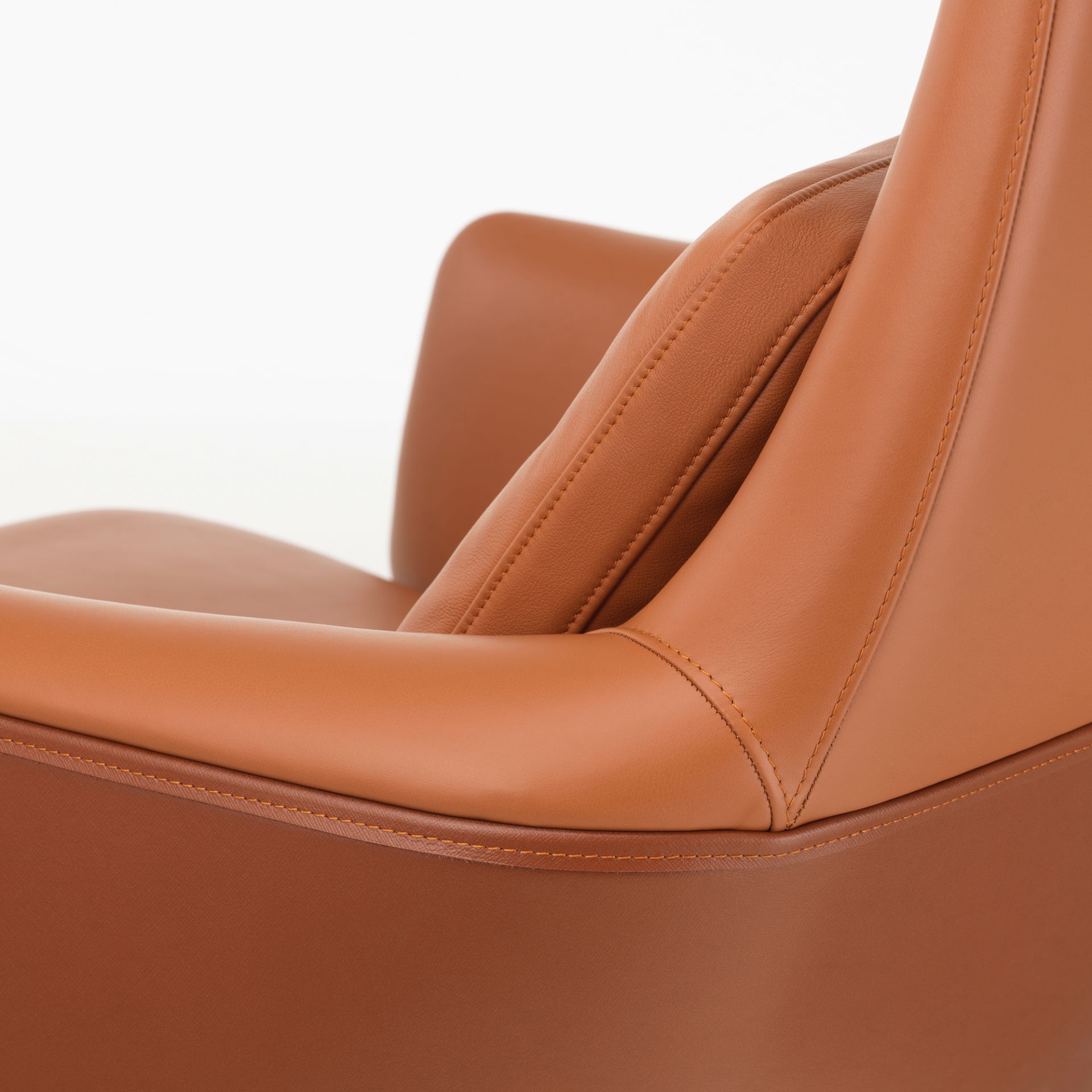 Auch optisch ist der Sessel ein wahrer Hingucker. Seine untere Hälfte der Sitzschalenrückseite ist mit strukturiertem Spaltleder eingefasst. Die restlichen Elemente sind mit Leder Premium bezogen und so entsteht ein spannungsreicher Kontrast zwischen der Innen- und Außenseite des Sessels.