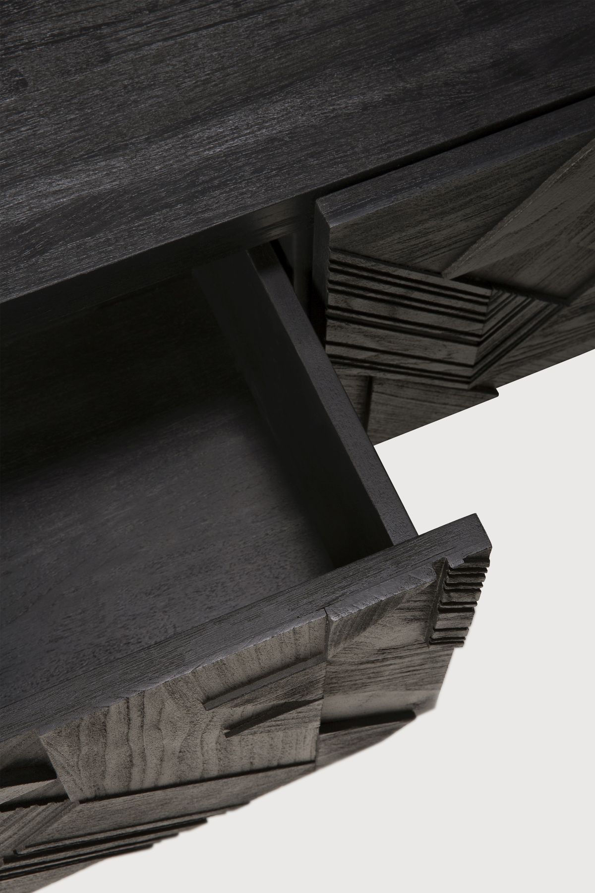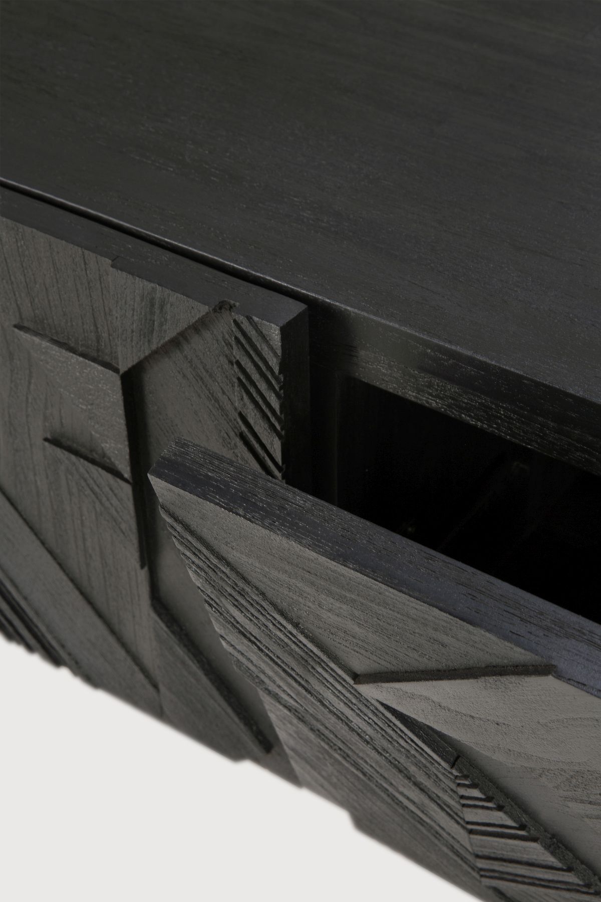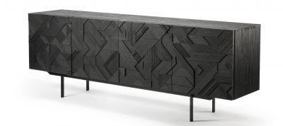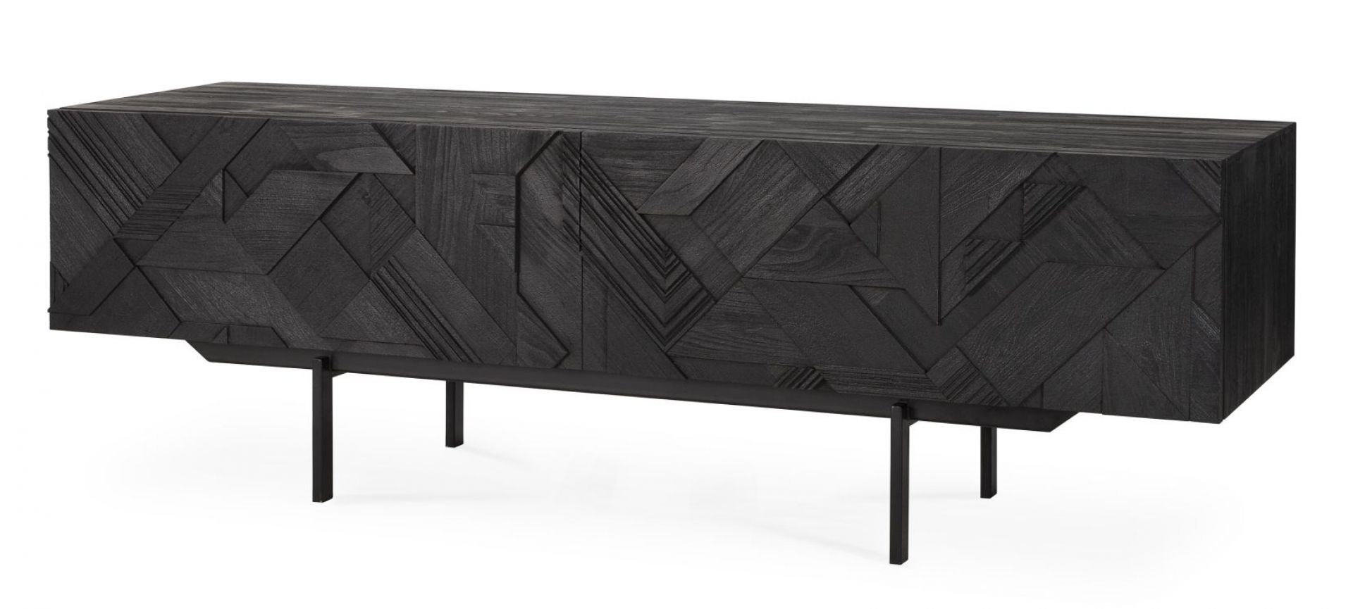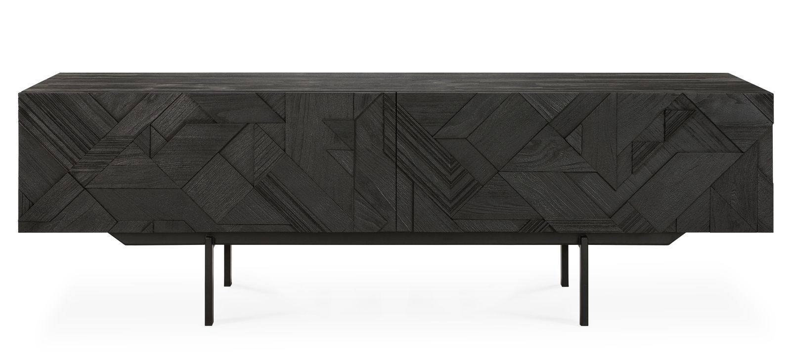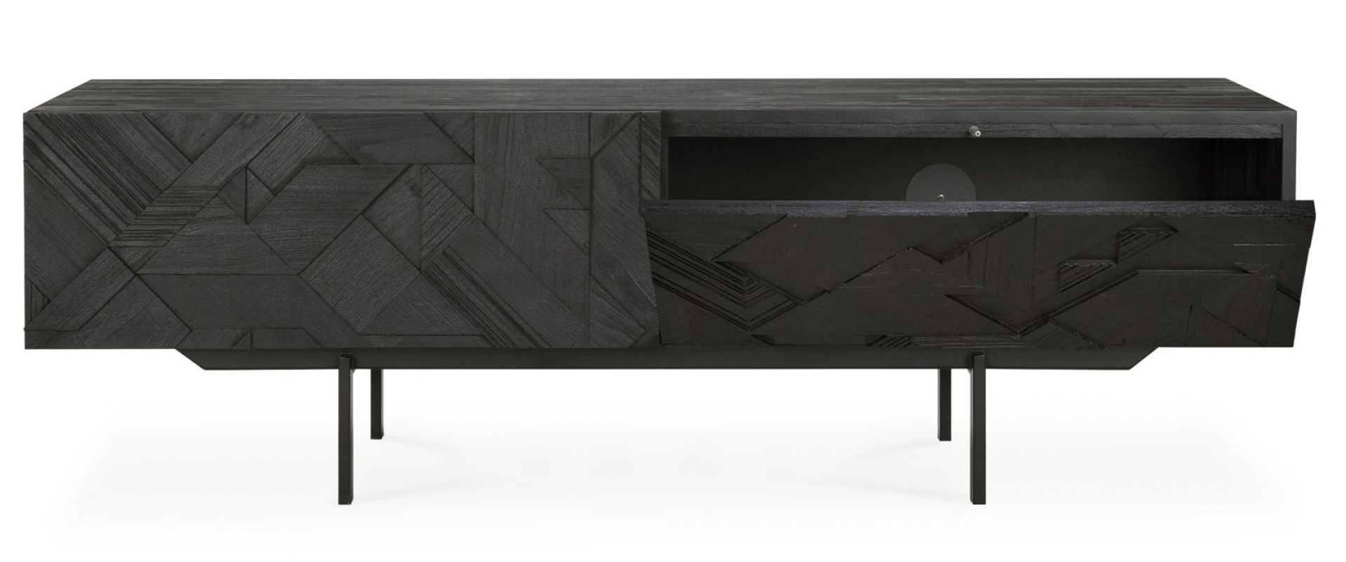 Der Graphic TV-Schrank ist aus massivem, gebürstetem Teakholz gefertigt, das mit einem schwarzen Lack verfeinert wurde. In Kombination mit dem Gestell aus Schwarzmetall entsteht ein imposanter Look. Das Designmöbel ist in zwei Varianten erhältlich: